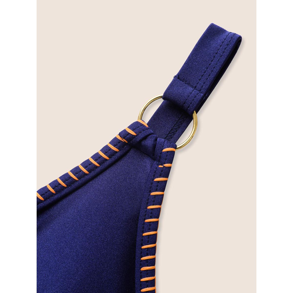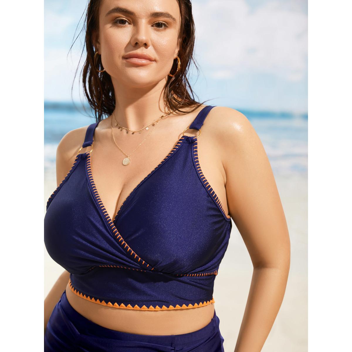 Plus Size Contrast Embroidered Wrap Buckle Detail Swim Top Women's Swimwear Navy Beach Patchwork High stretch Skinny Overlap Collar Curve Swim Tops BloomChic 18-20/2X