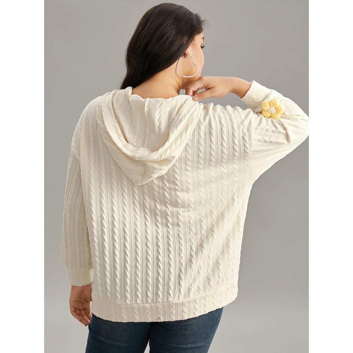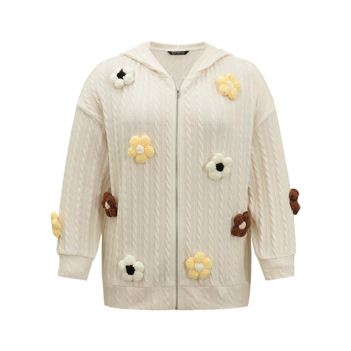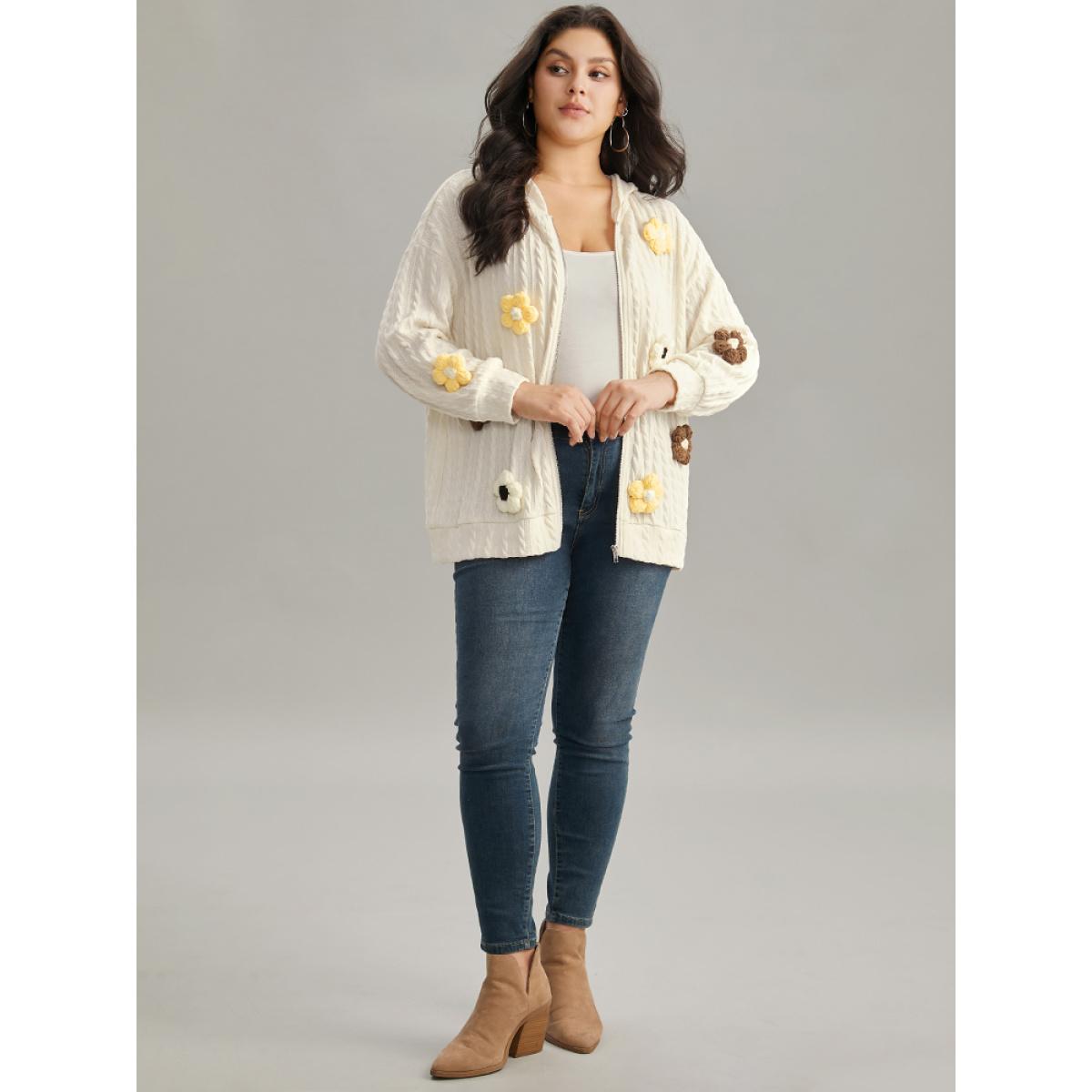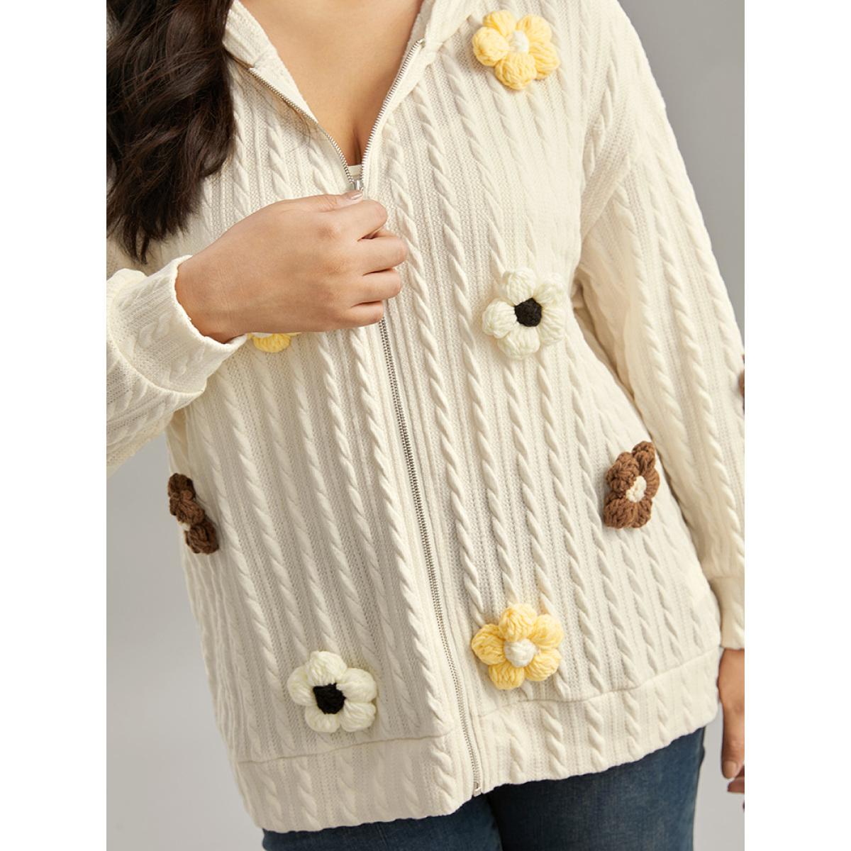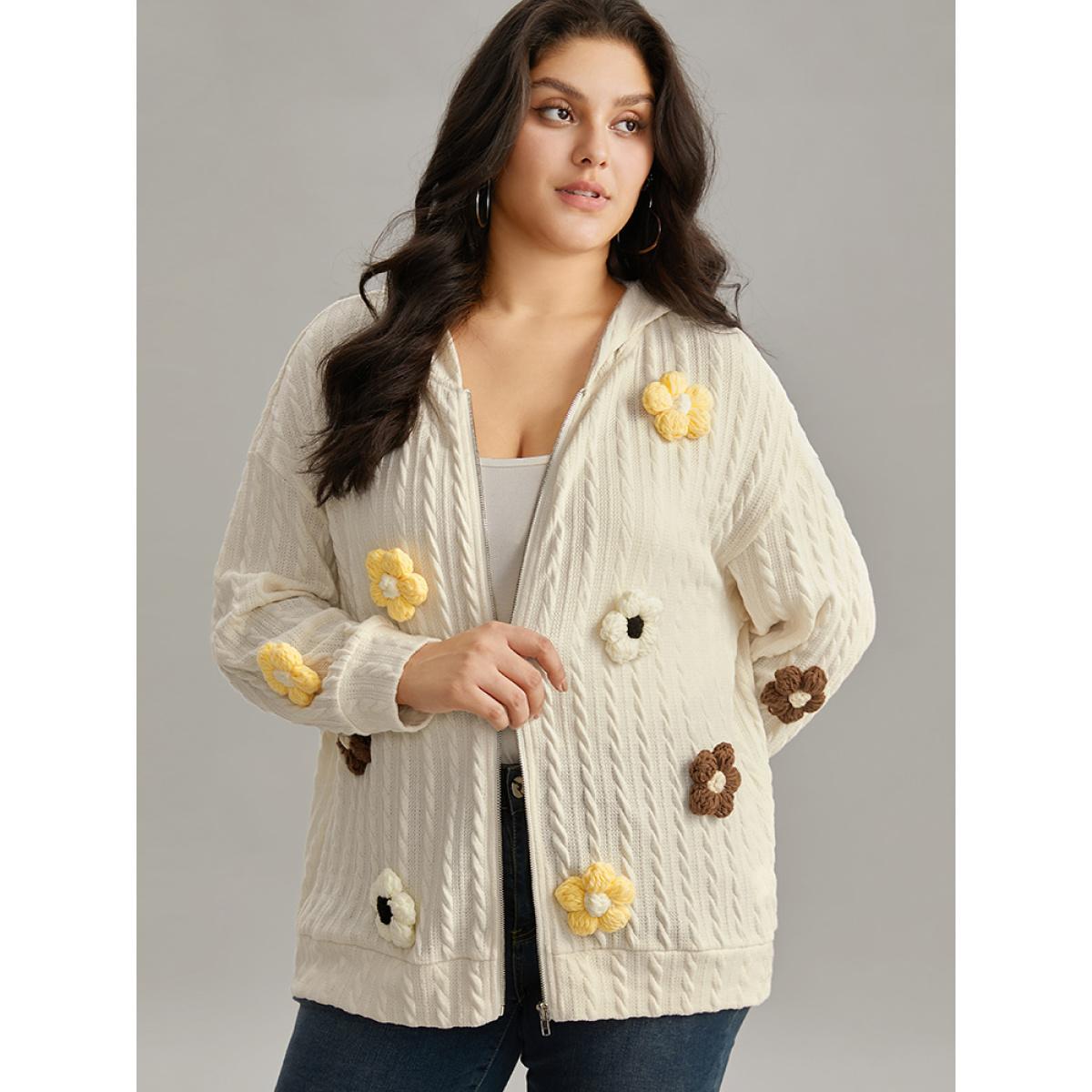 Plus Size Contrast Floral Detail Textured Zipper Fly Sweatshirt Women Apricot Elegant Texture Hooded Dailywear Sweatshirts BloomChic 14-16/1X