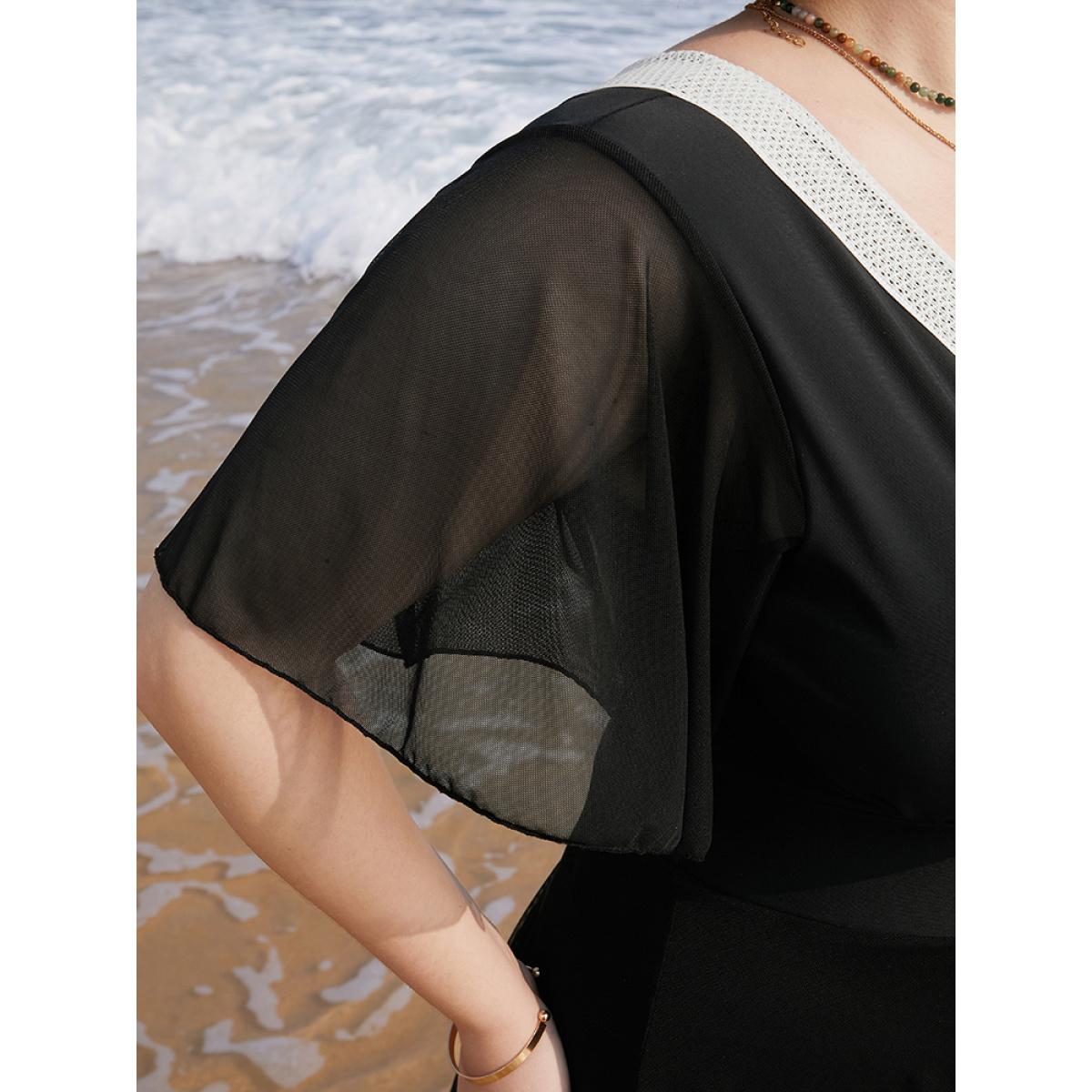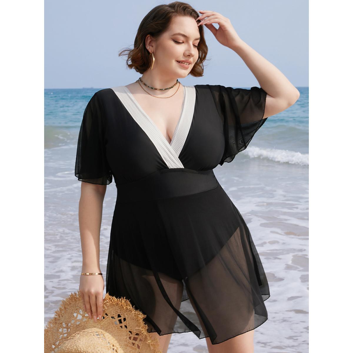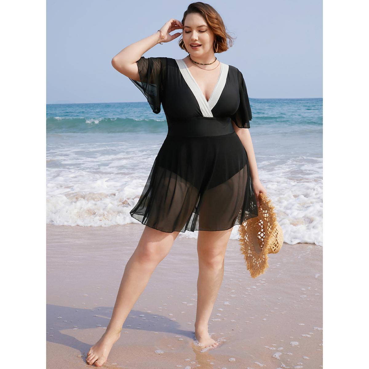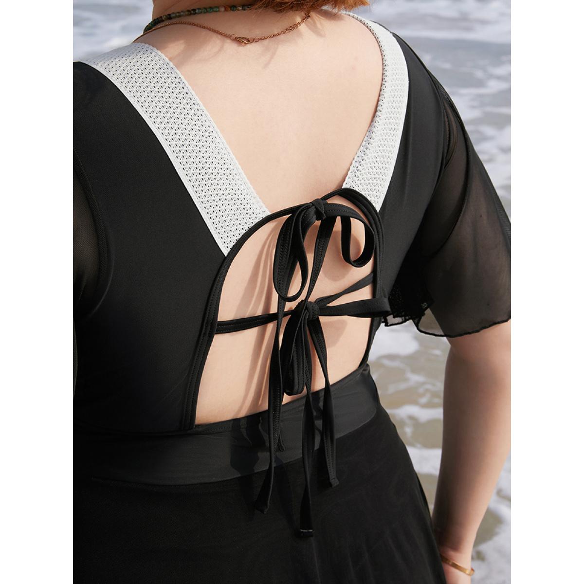 Plus Size Contrast Lace Knot Back Mesh Ruffle Swim Dress Women's Swimwear Black Vacation Bodycon Deep V-neck High stretch Curve Swim Dresses BloomChic 28/5X