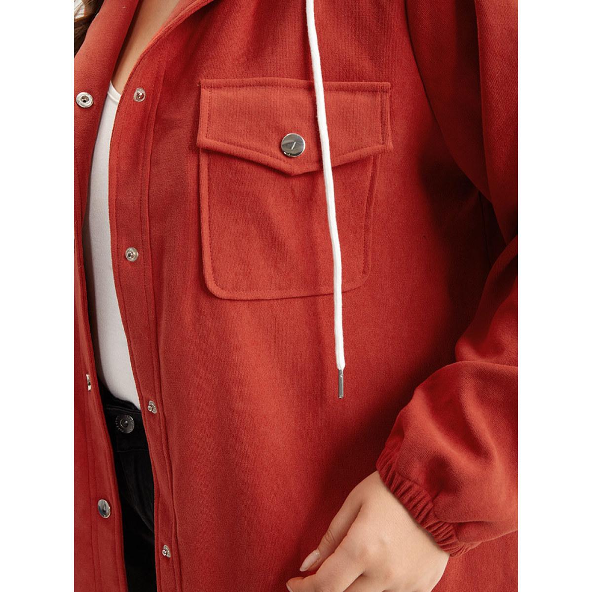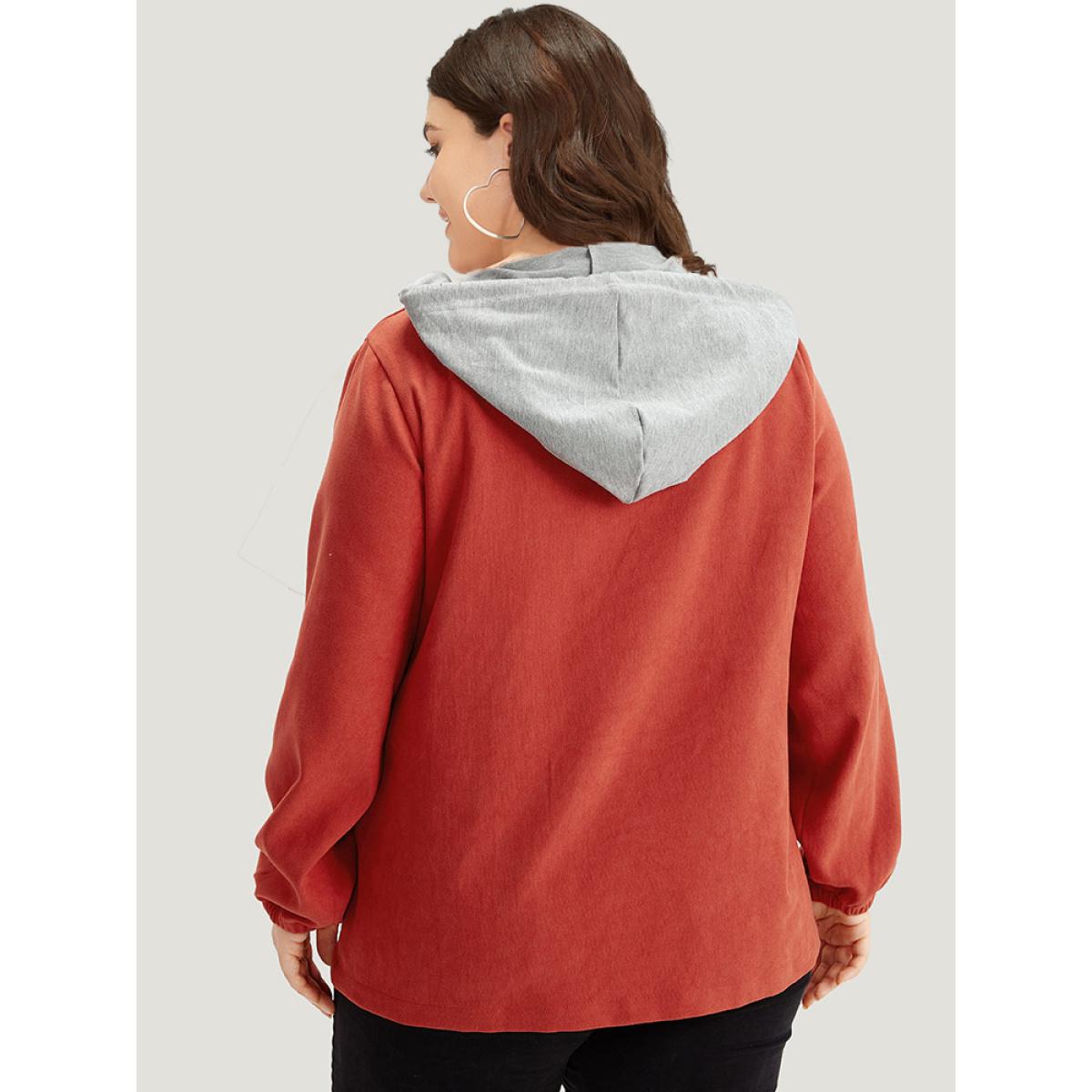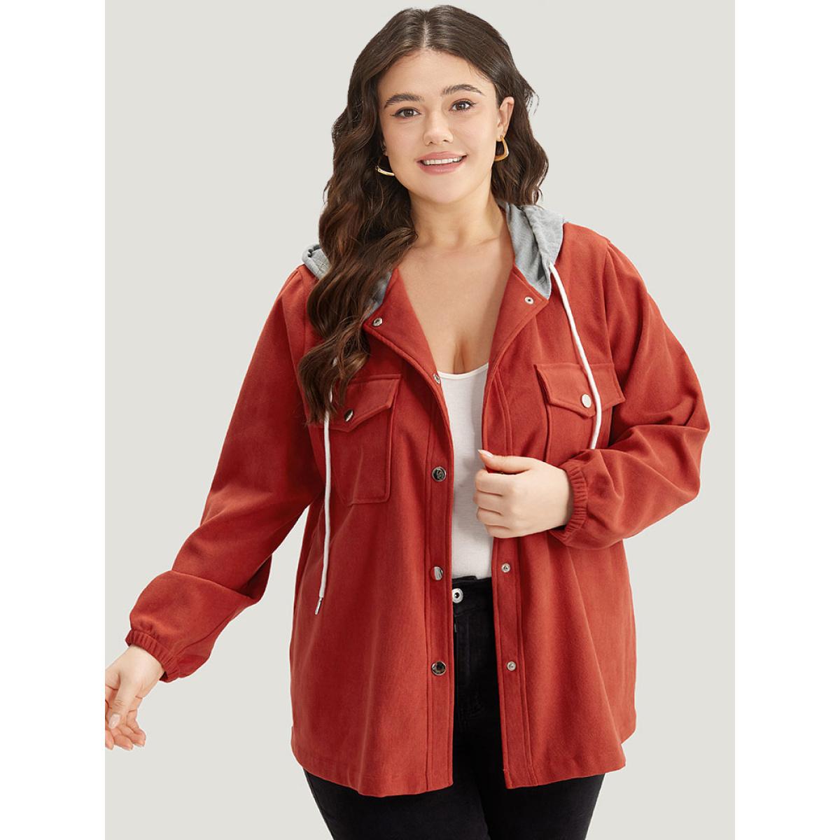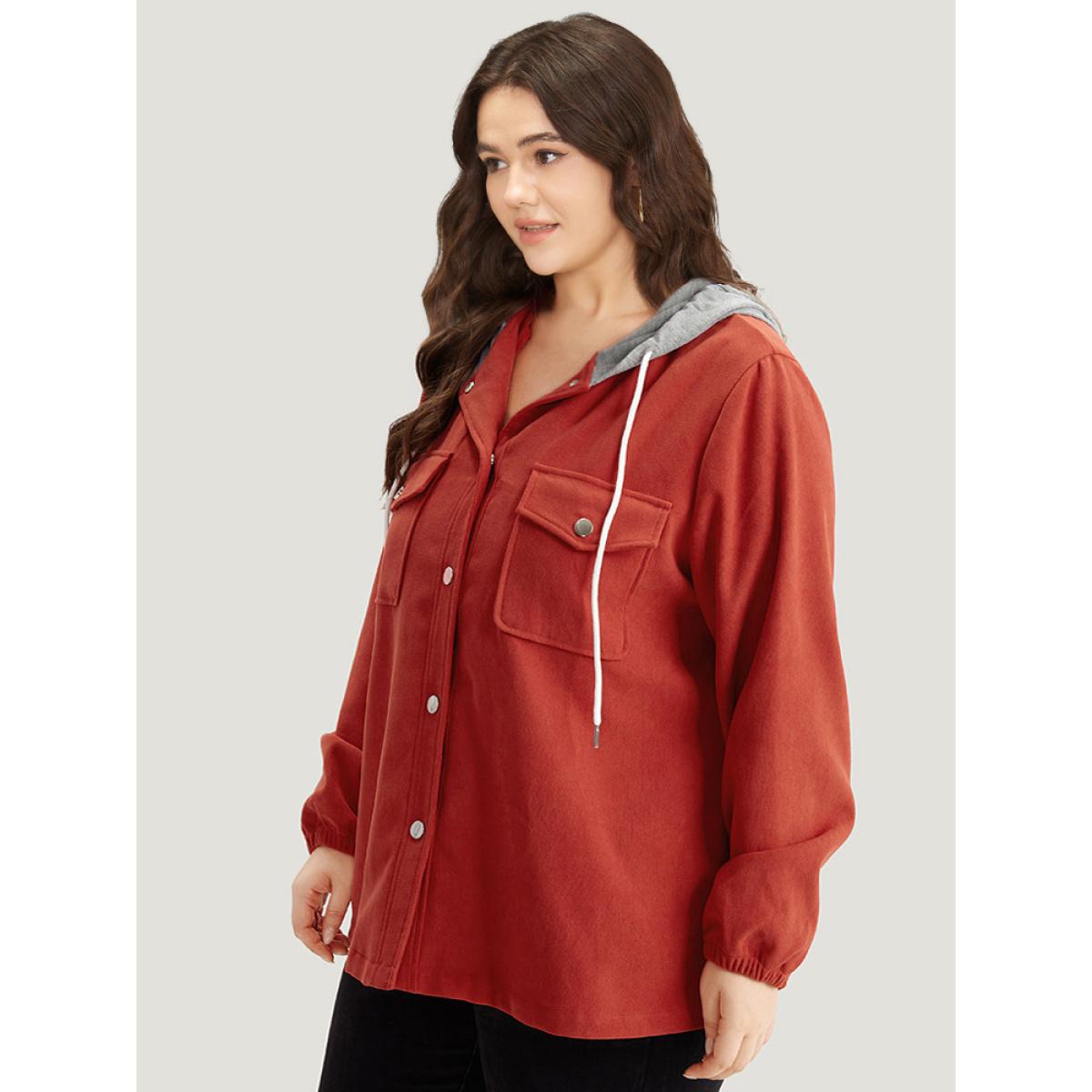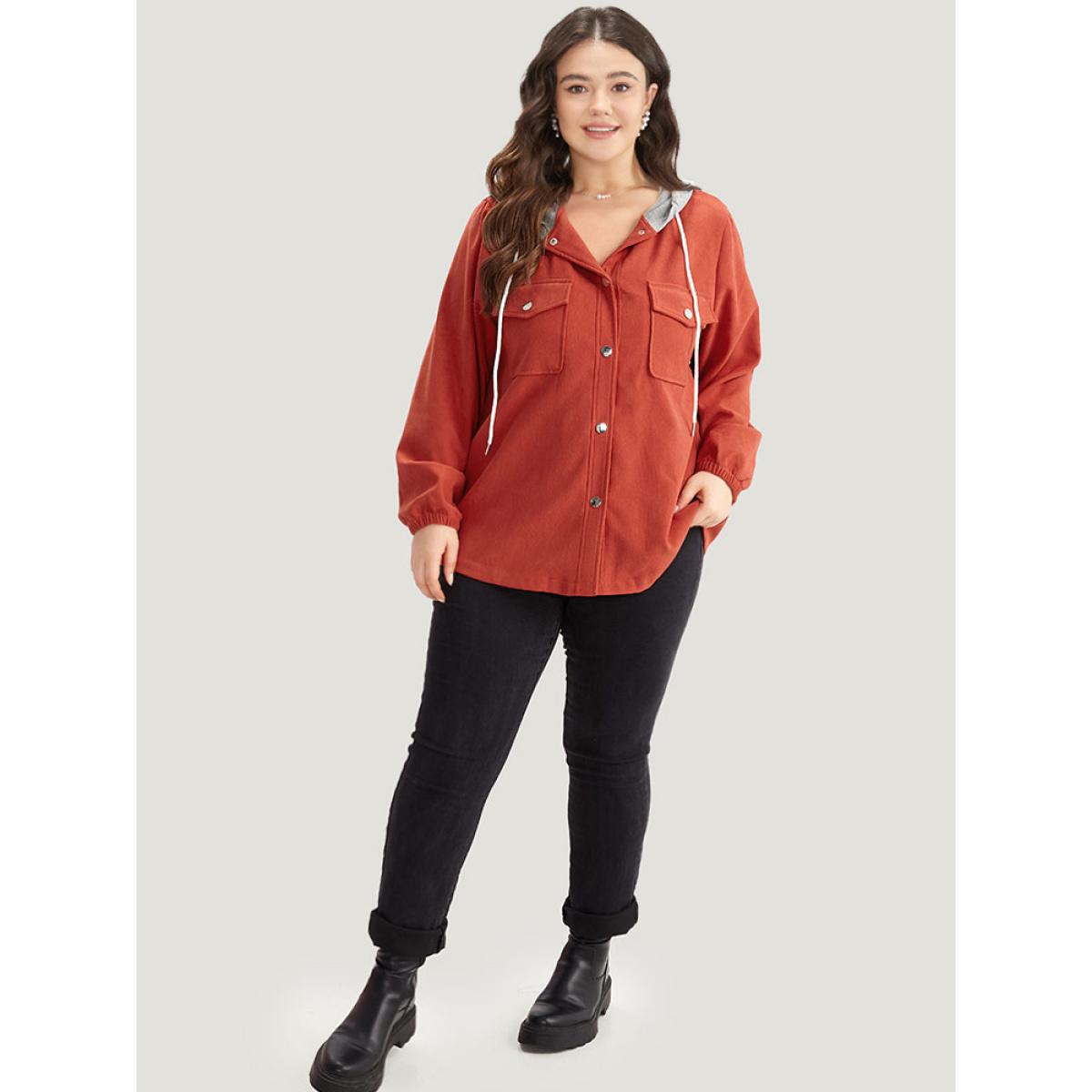 Plus Size Contrast Patchwork Button Through Hooded Drawstring Corduroy Coat Women OrangeRed Contrast Pocket Dailywear Jackets BloomChic 10/M