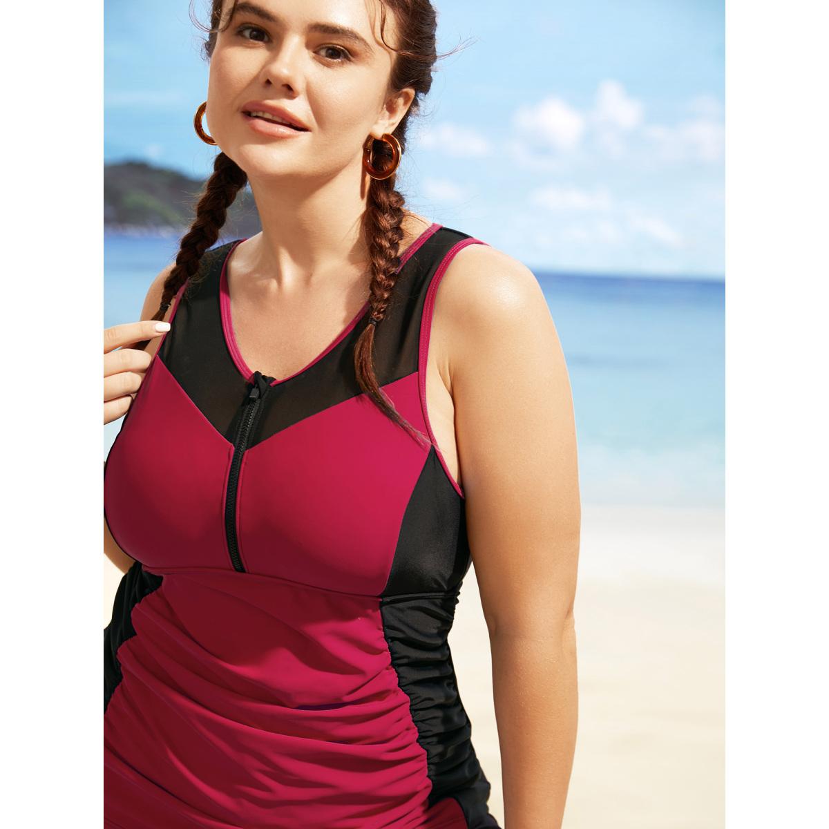 Plus Size Contrast Patchwork Gathered Half Zip Swim Top Women's Swimwear Scarlet Resort Gathered High stretch Skinny Round Neck Curve Swim Tops BloomChic 28/5X
