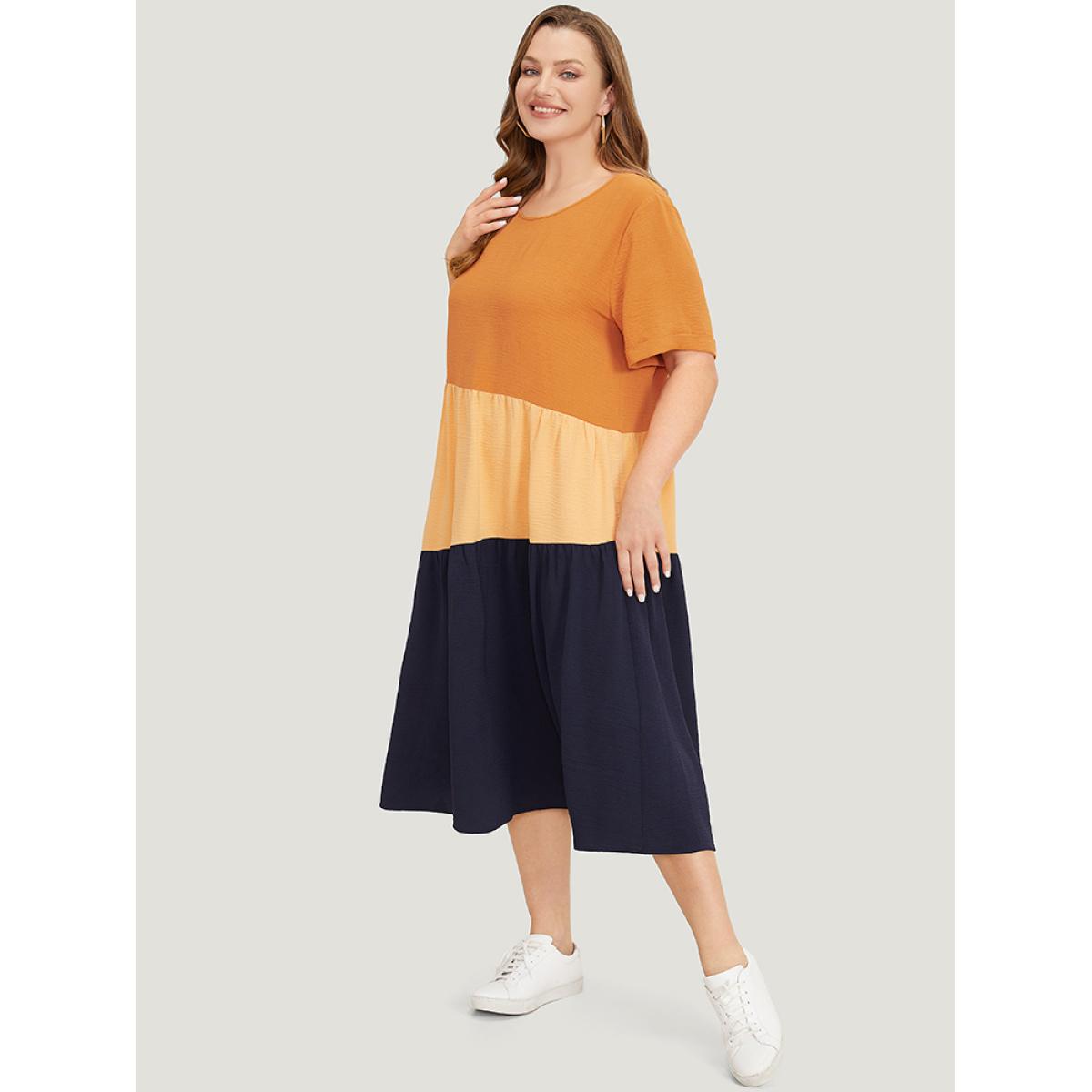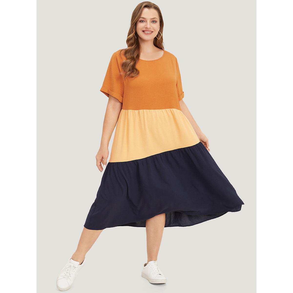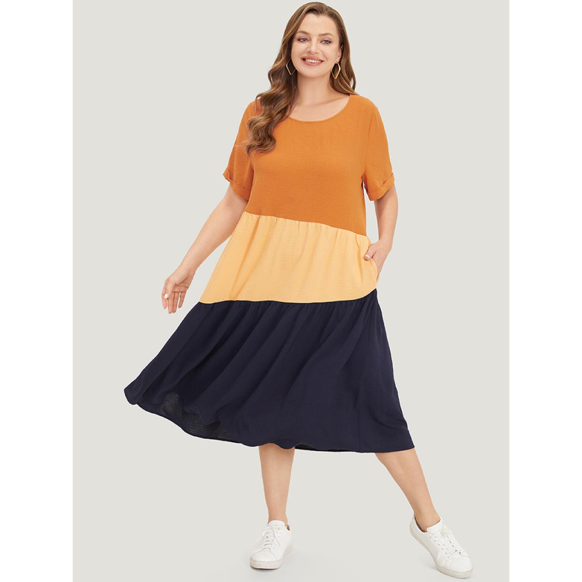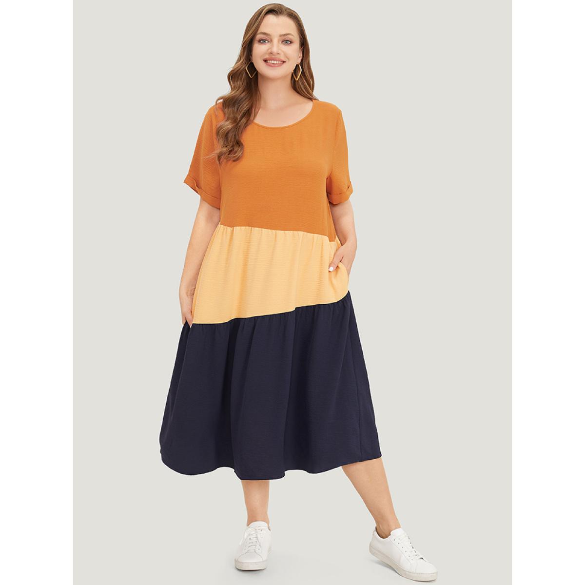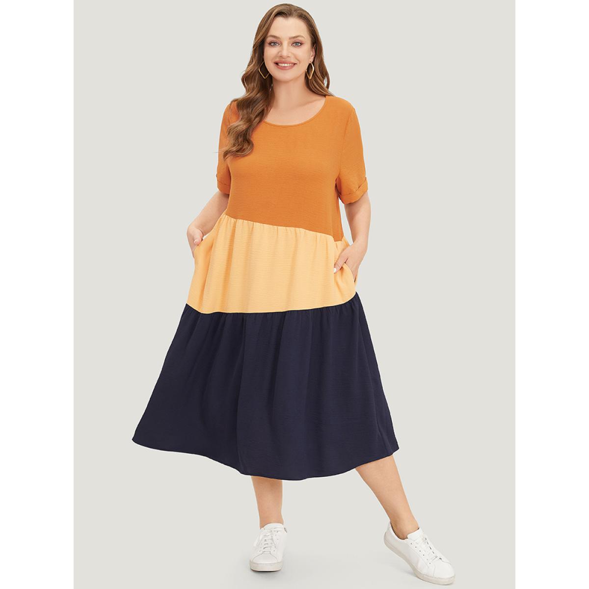 Plus Size Contrast Patchwork Pocket Cuffed Sleeve Dress Multicolor Women Casual Plain Round Neck Short sleeve Curvy Midi Dress BloomChic 10/M