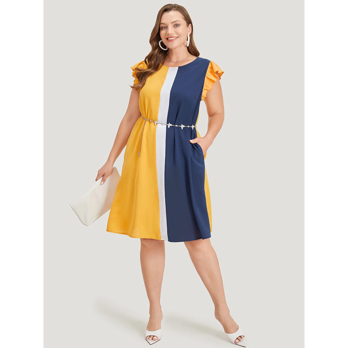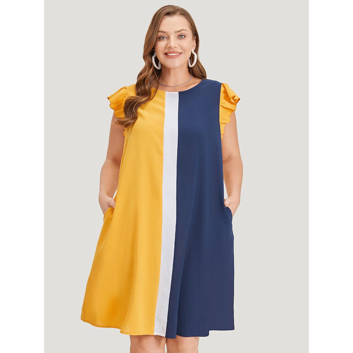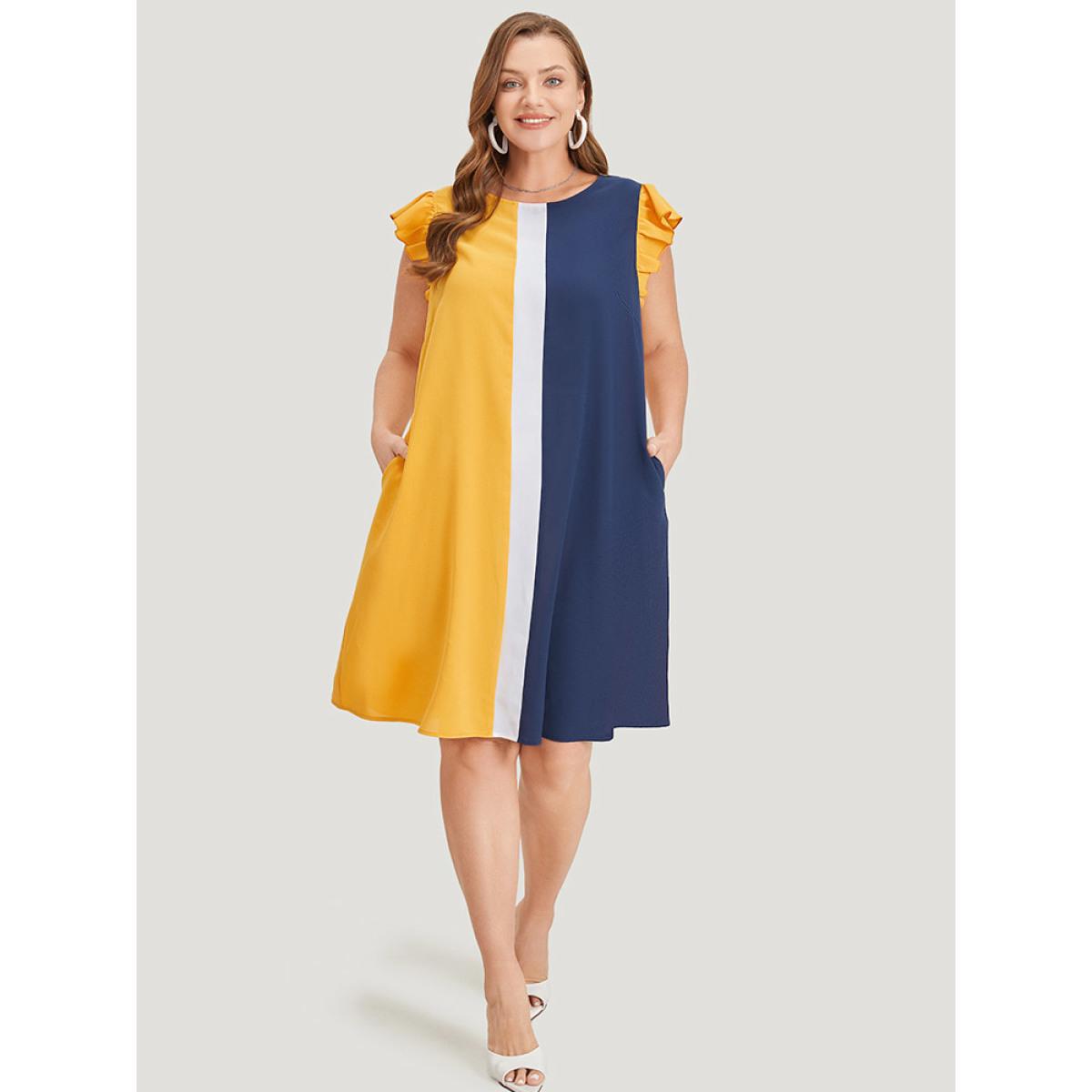 Plus Size Contrast Patchwork Pocket Ruffle Cap Sleeve Dress Multicolor Women Office Contrast Round Neck Cap Sleeve Curvy Knee Dress BloomChic 30/6X