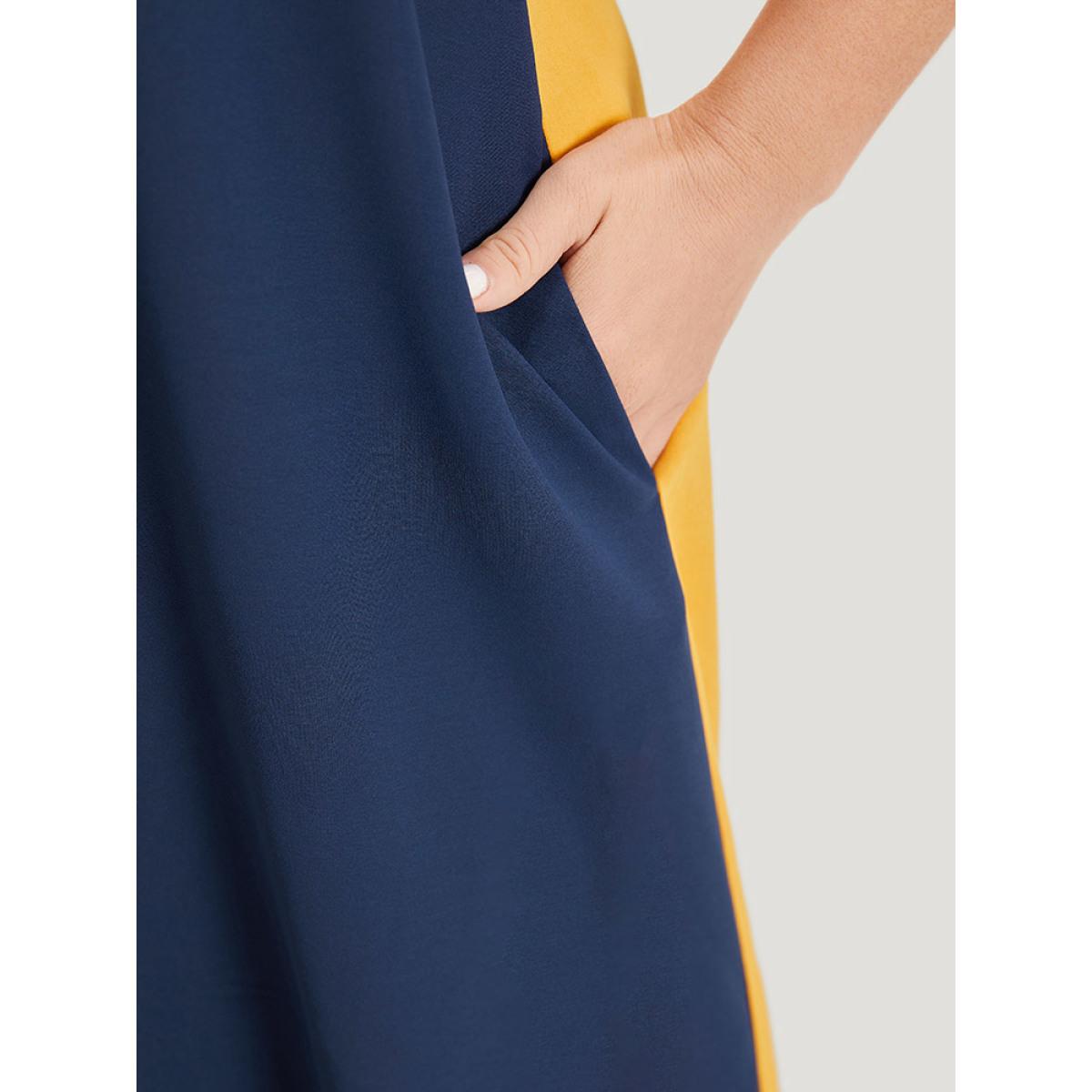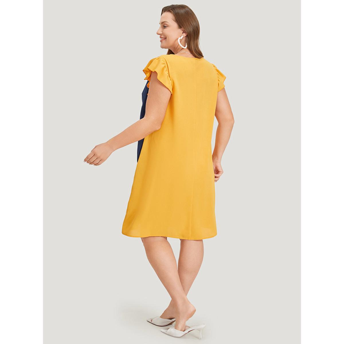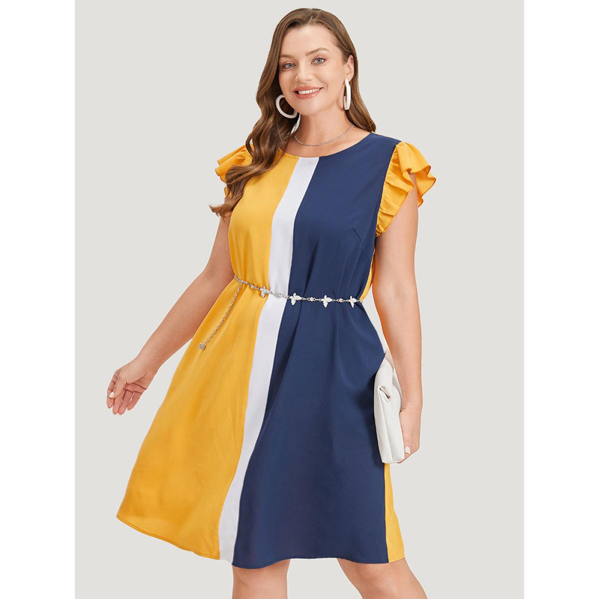 Plus Size Contrast Patchwork Pocket Ruffle Cap Sleeve Dress Multicolor Women Office Contrast Round Neck Cap Sleeve Curvy Knee Dress BloomChic 30/6X