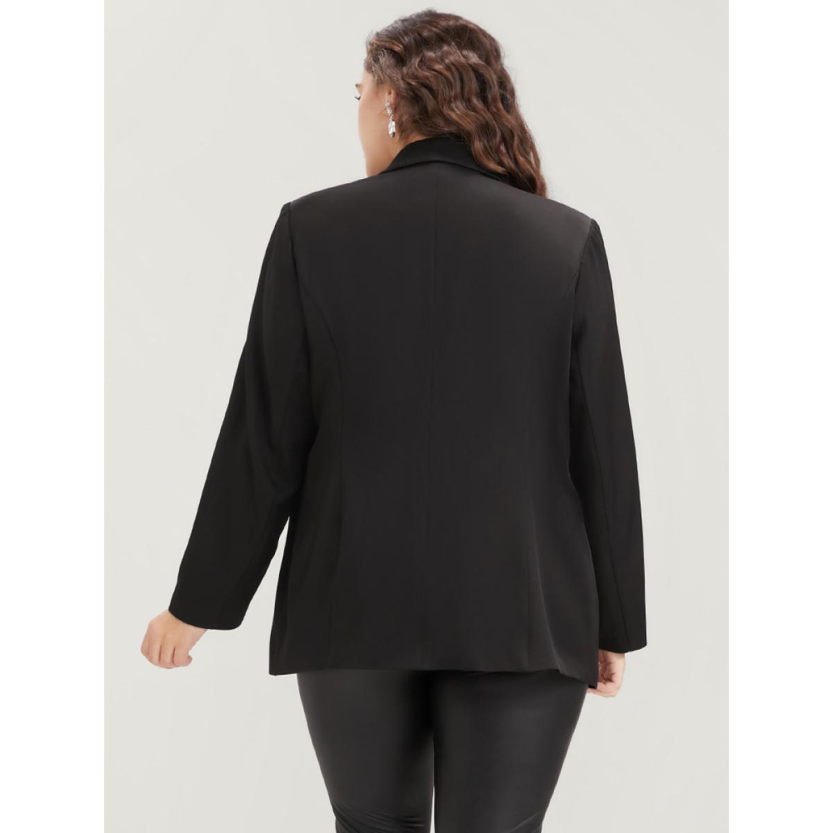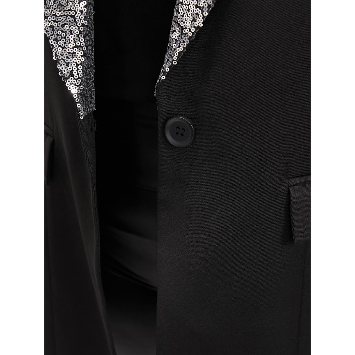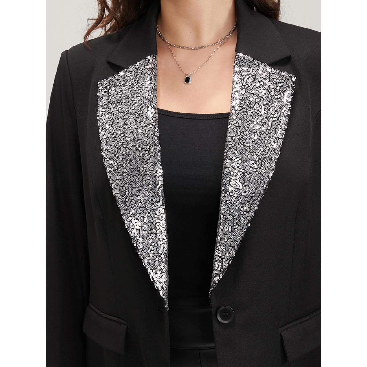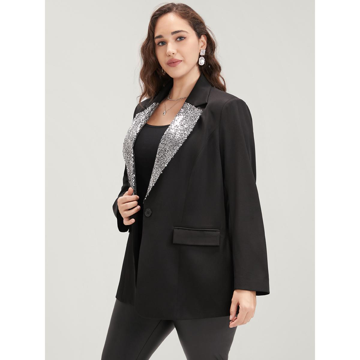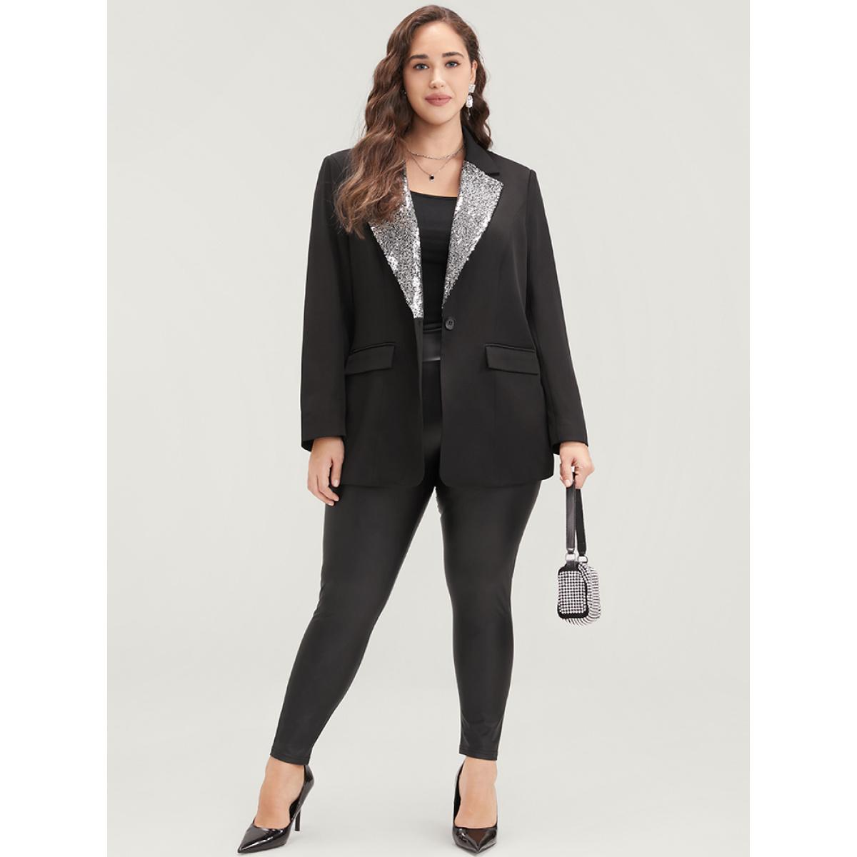 Plus Size Contrast Sequin Suit Collar Flap Pocket Blazer Black Women Going out Plain Patchwork Sleeve Long Sleeve Suit Collar 30/6X Pocket Party Blazers BloomChic