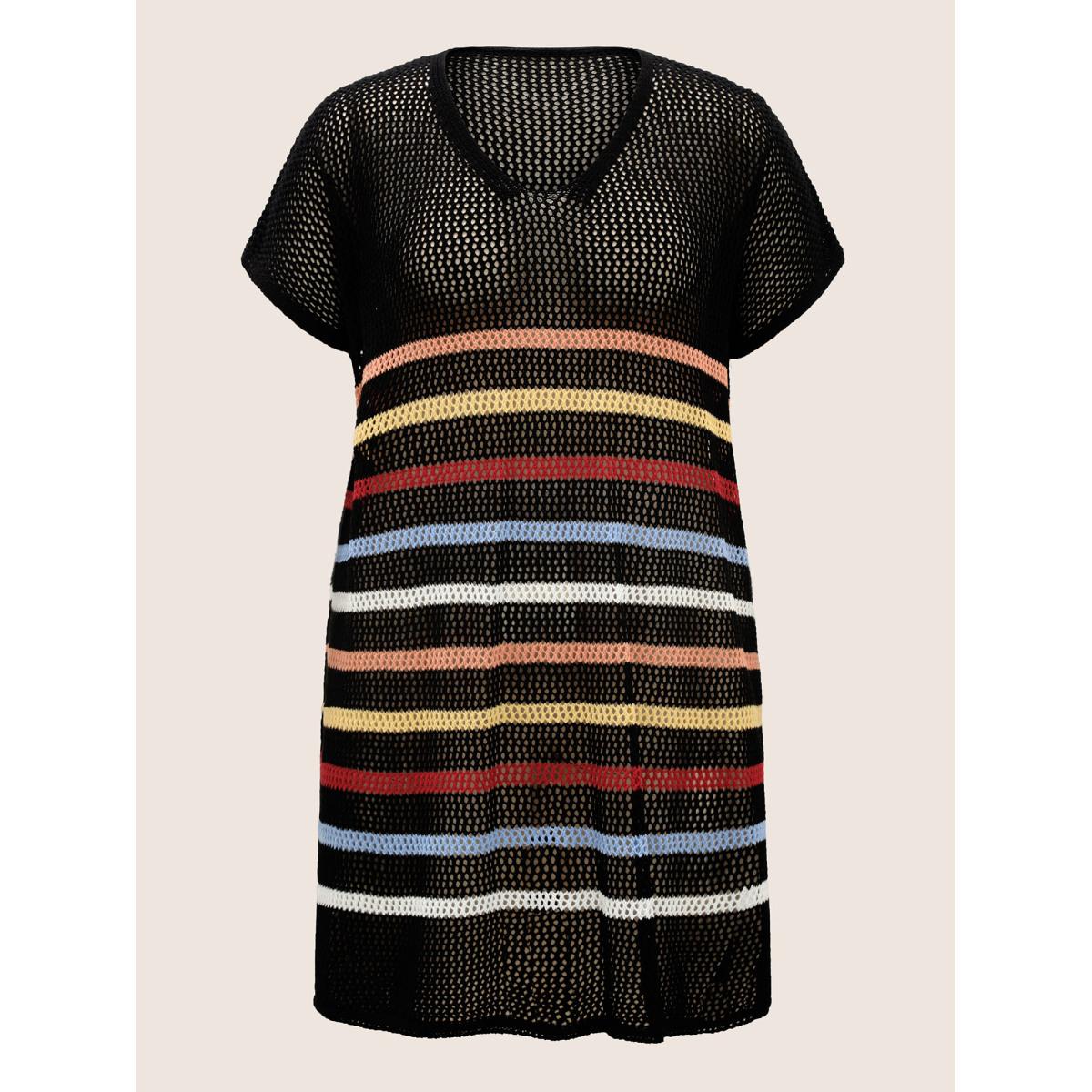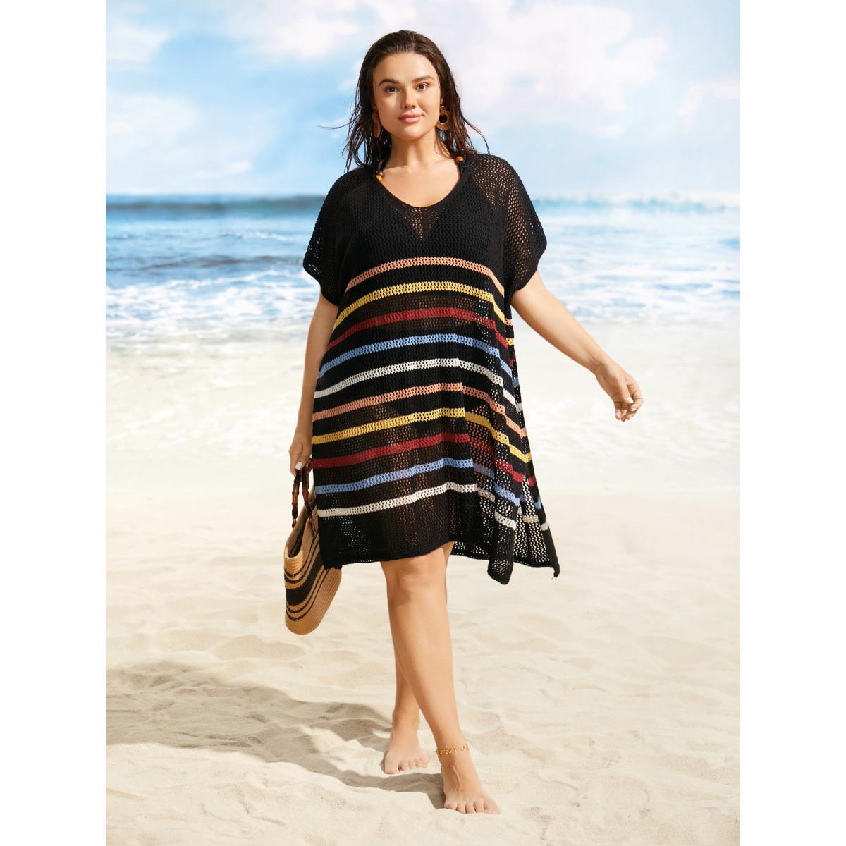 Plus Size V Neck Contrast Striped Batwing Sleeve Swim Cover Up Women's Swimwear Multicolor Beach Loose Texture Curve Swim Cover Ups BloomChic 22-24/3X