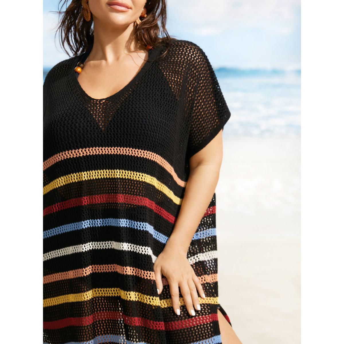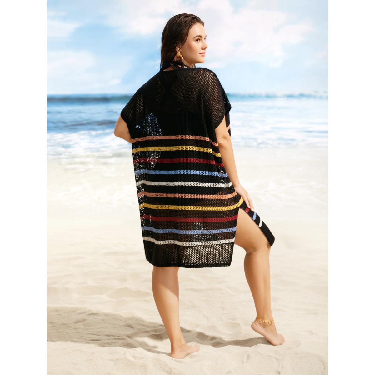 Plus Size Contrast Striped Batwing Sleeve Split Hem Swim Cover Up Women's Swimwear Black Beach Loose Texture Curve Swim Cover Ups BloomChic 12/L