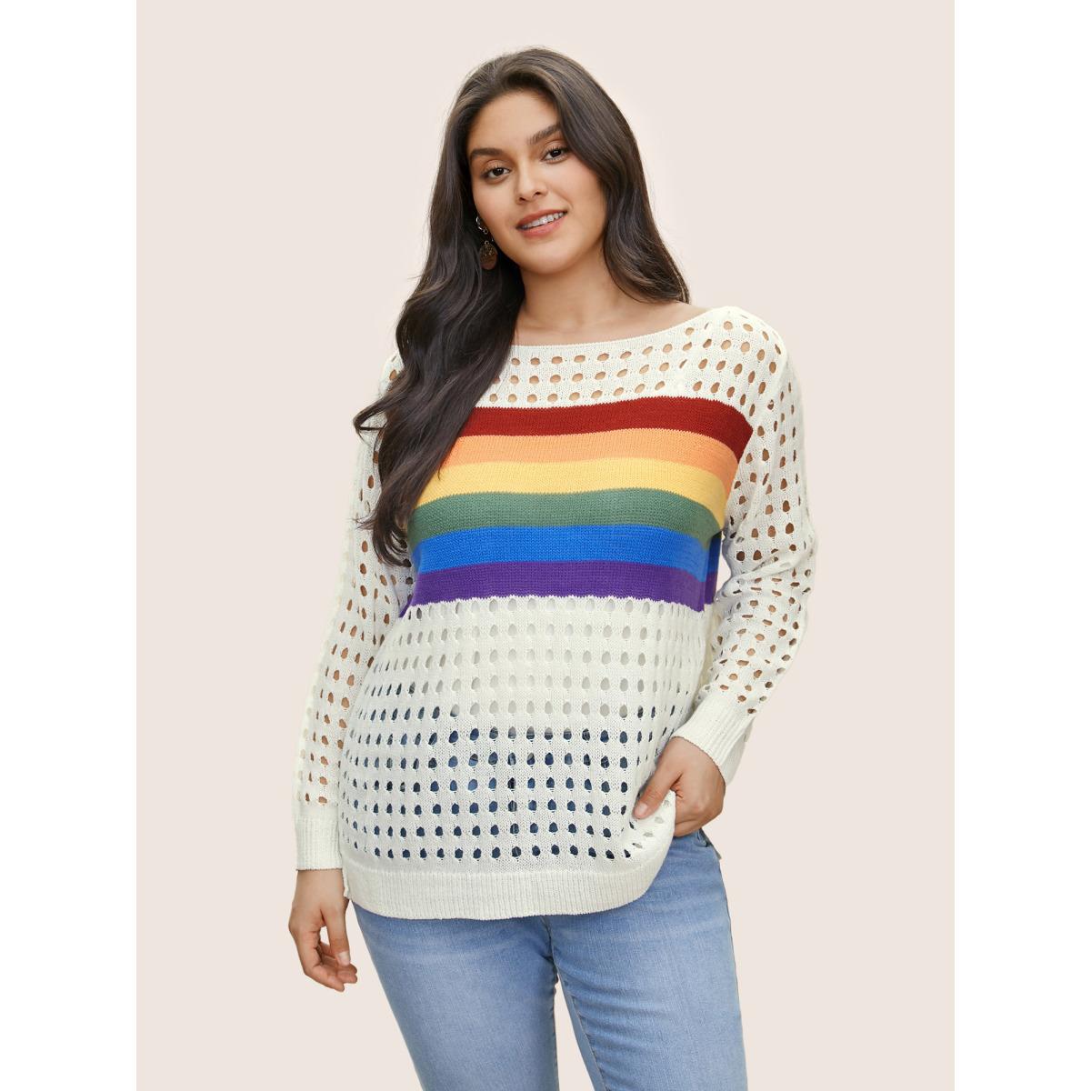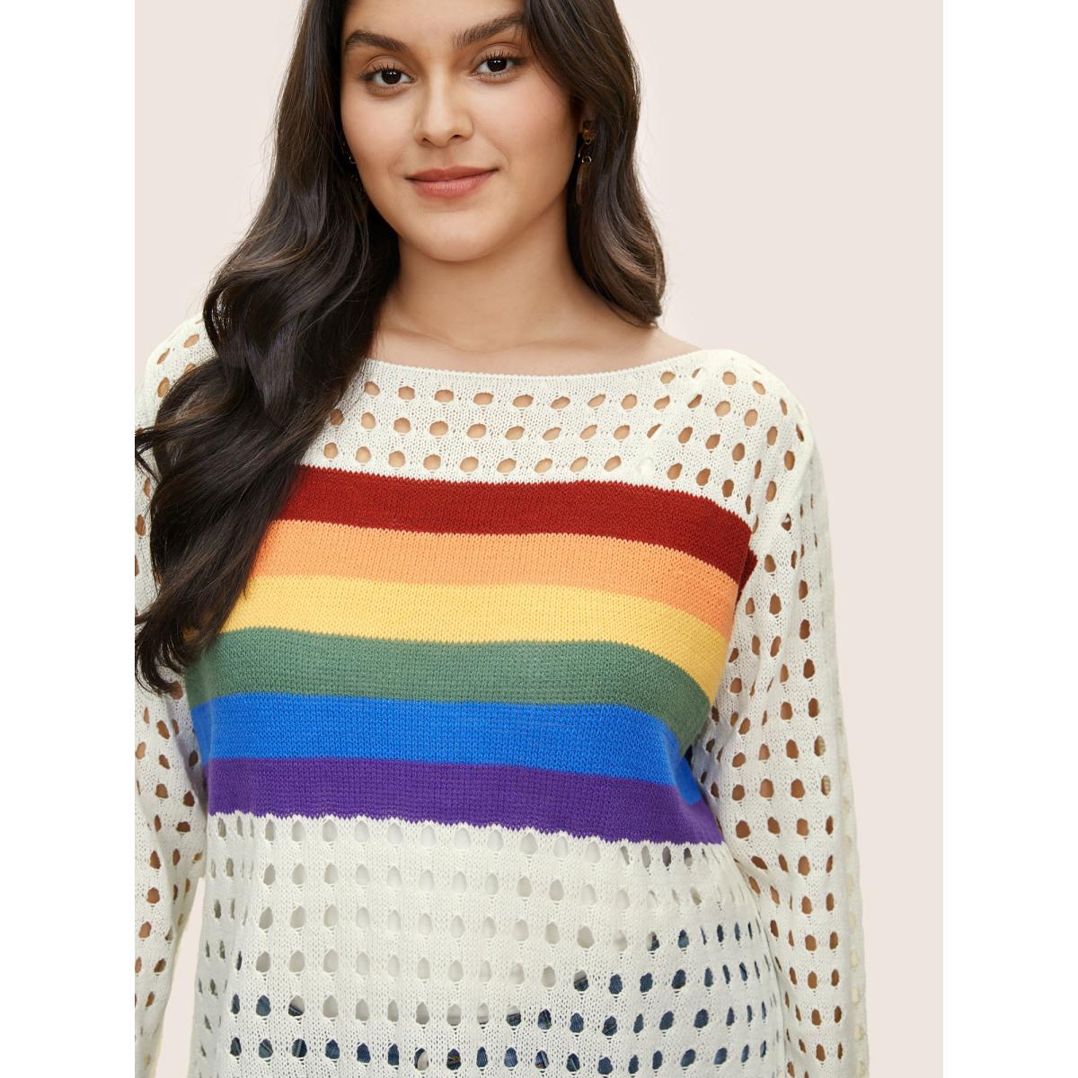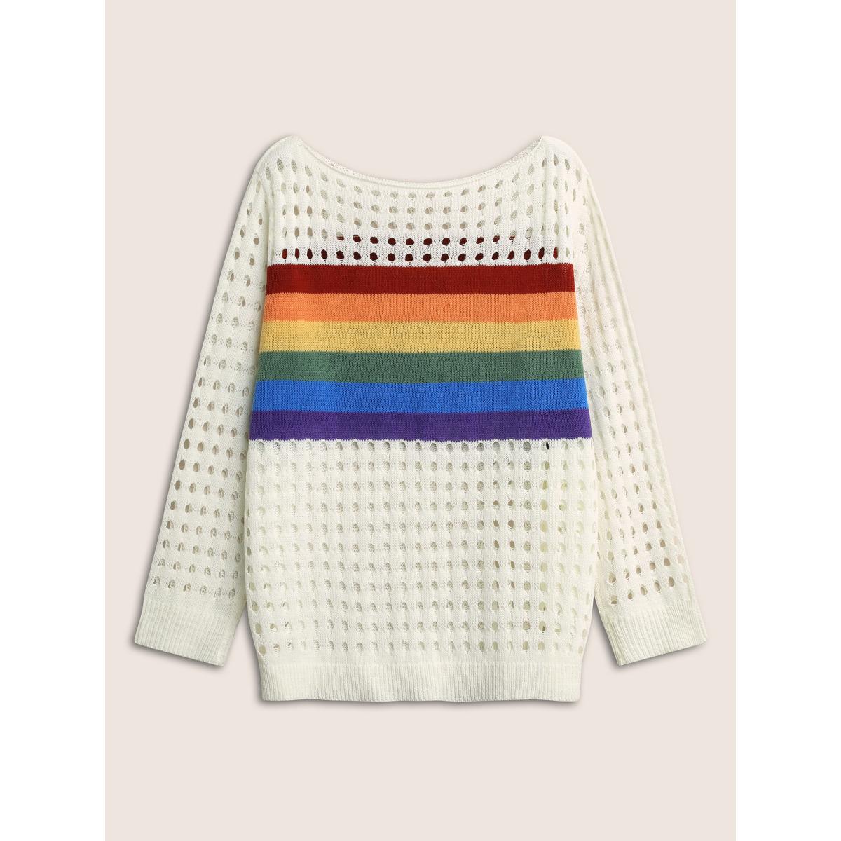 Plus Size Contrast Striped Boat Neck Cut Out Pullover White Women Resort Long Sleeve Boat Neck Vacation Pullovers BloomChic 10/M
