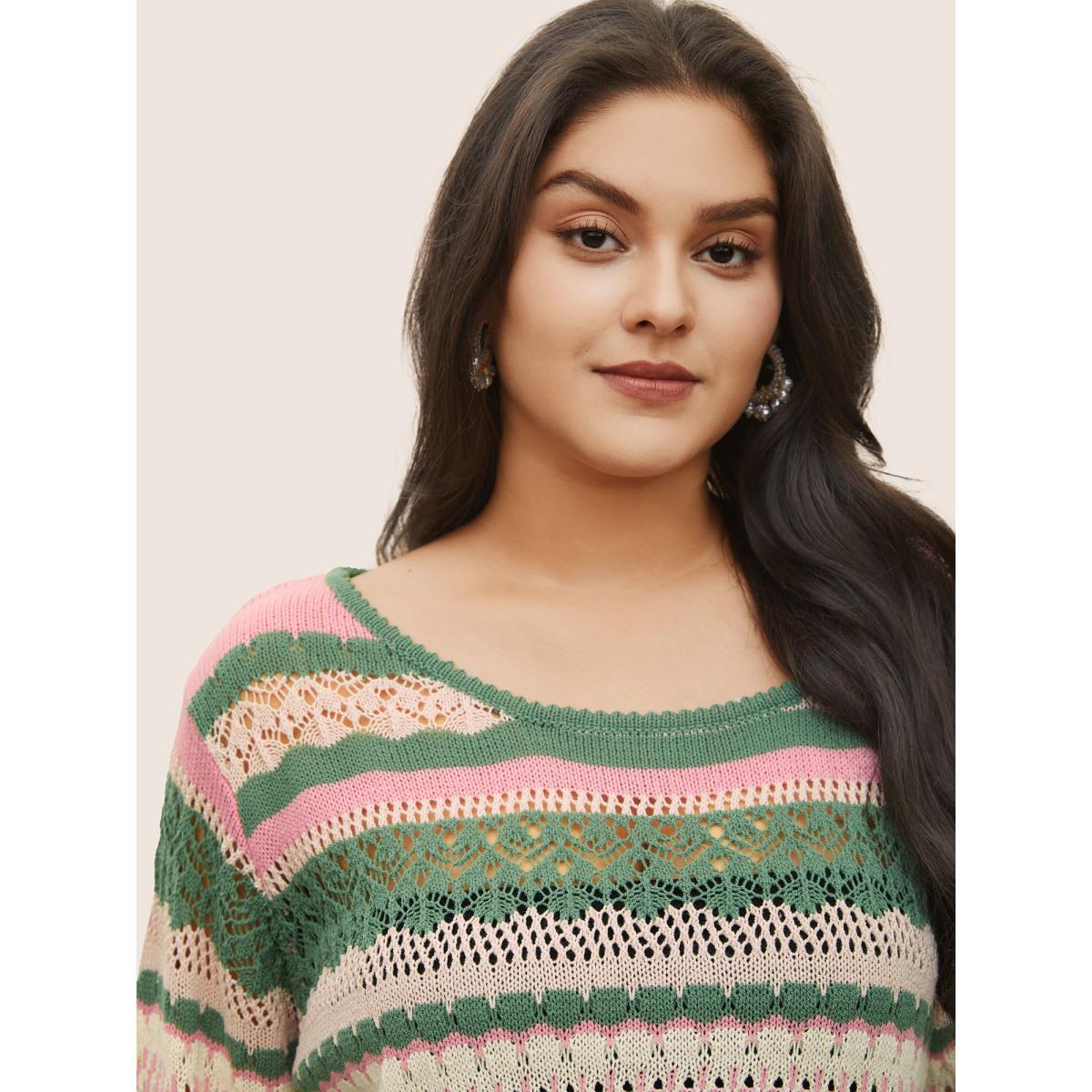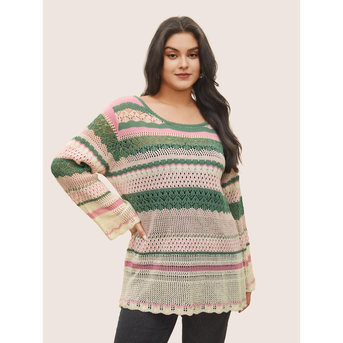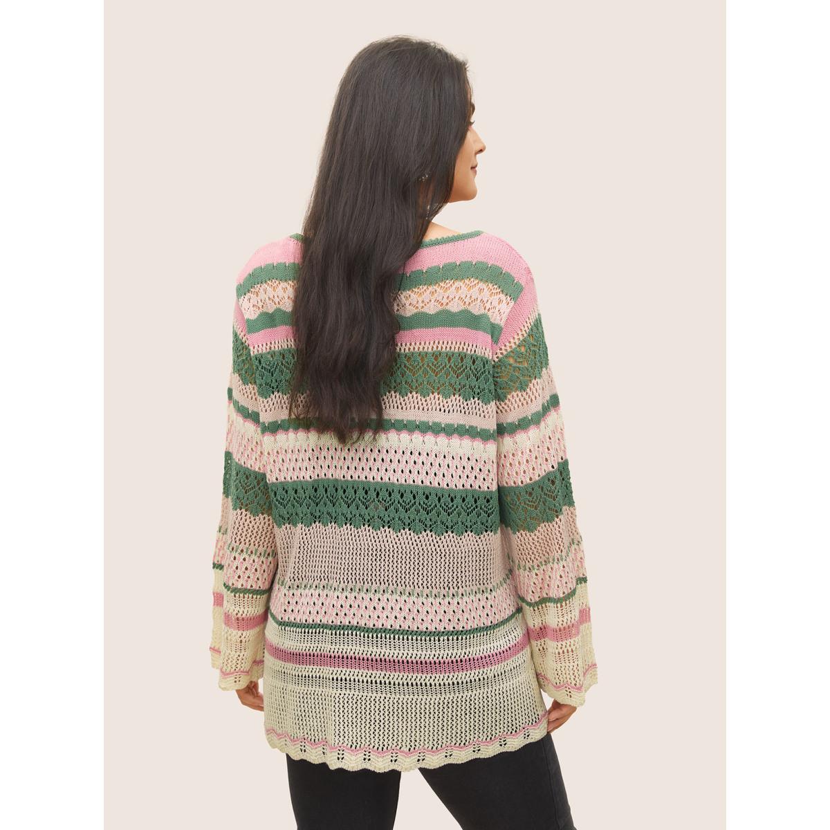 Plus Size Contrast Striped Cut Out Bell Sleeve Pullover Emerald Women Casual Everyday Pullovers BloomChic 14-16/1X