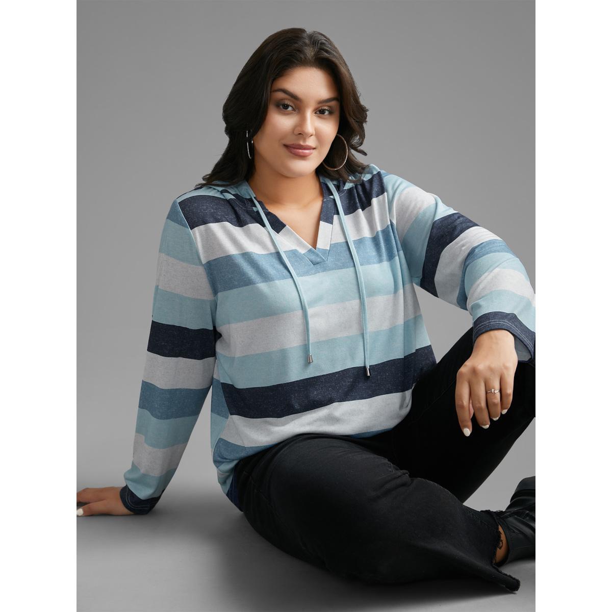 Plus Size Contrast Striped Hooded Drawstring T-shirt Aegean Women Casual Drawstring Hooded Everyday T-shirts BloomChic 22-24/3X