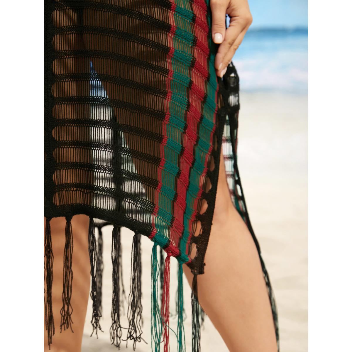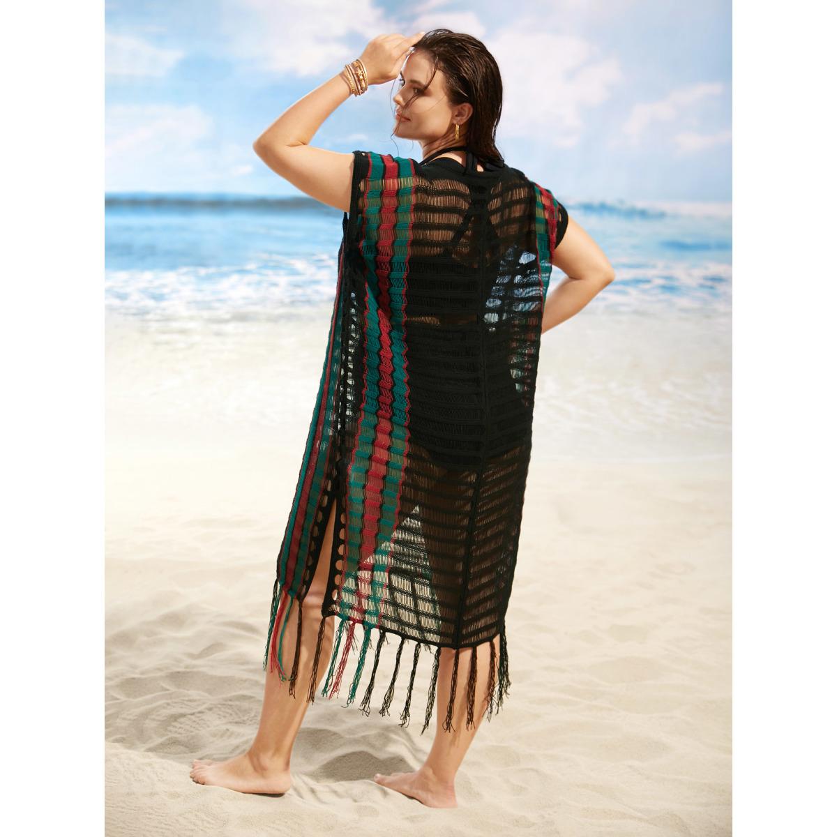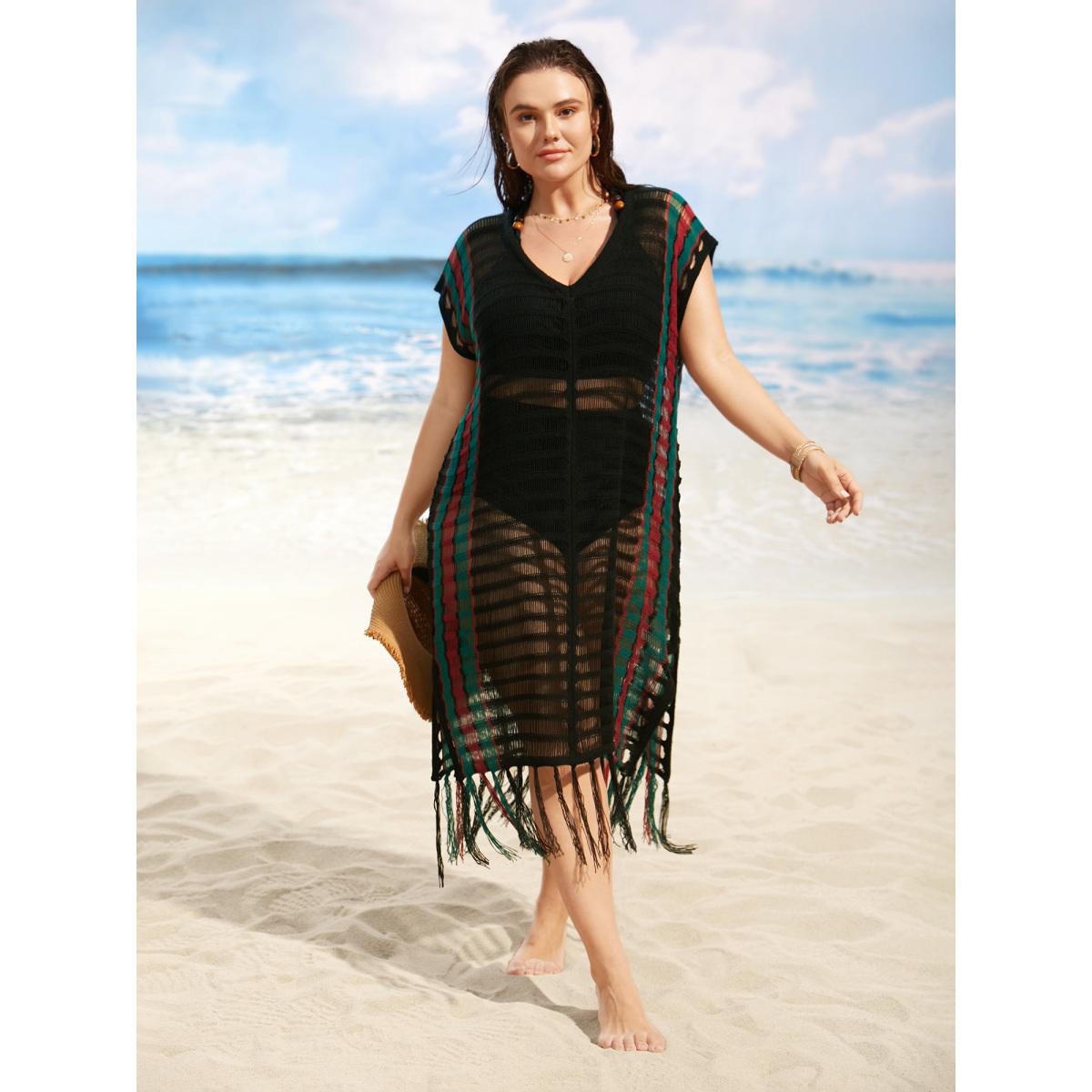 Plus Size Contrast Striped Tassel Trim Split Side Swim Cover Up Women's Swimwear Black Beach Loose Crochet Curve Swim Cover Ups BloomChic 30/6X