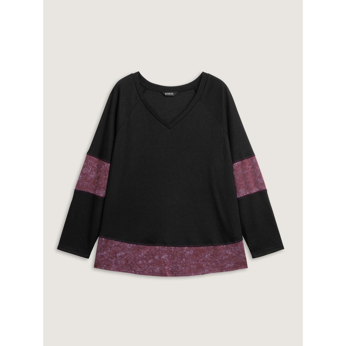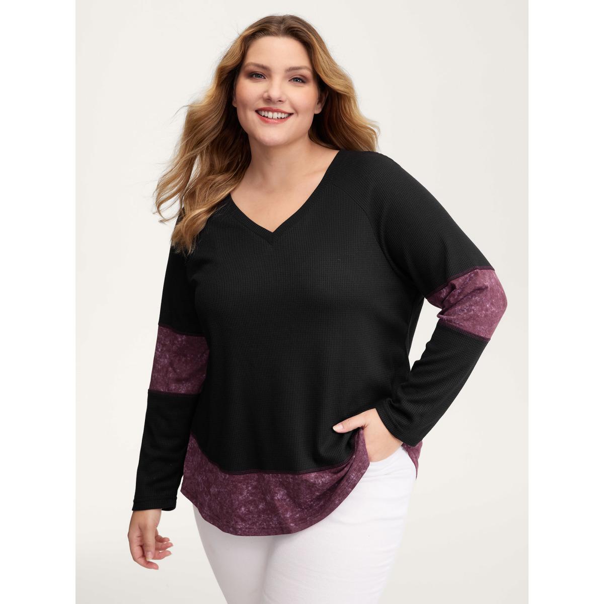 Plus Size Contrast Stripes Vintage V-Neck T-Shirt Black Women Leisure Texture Plain V-neck Casual T-shirts BloomChic 10/M Product Image