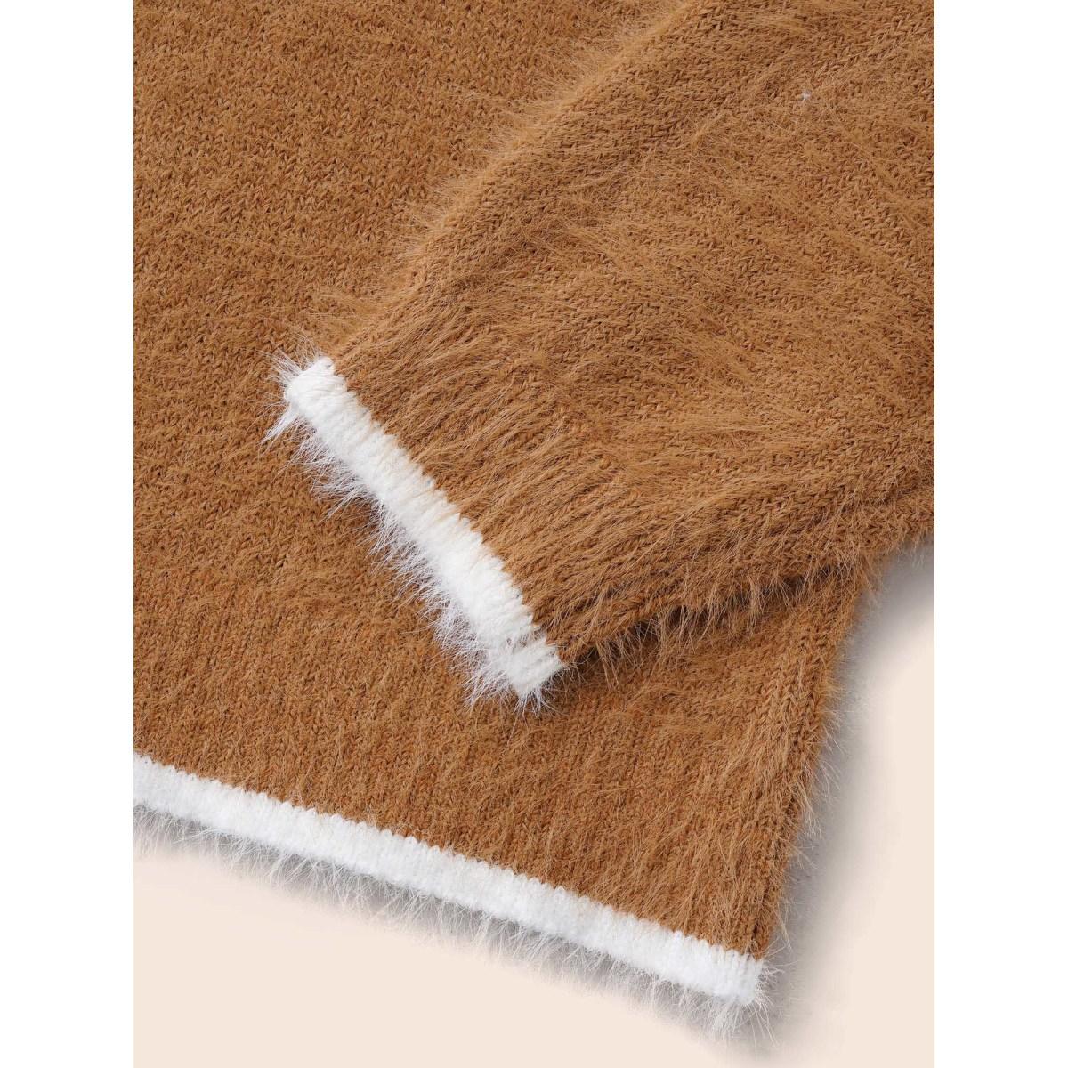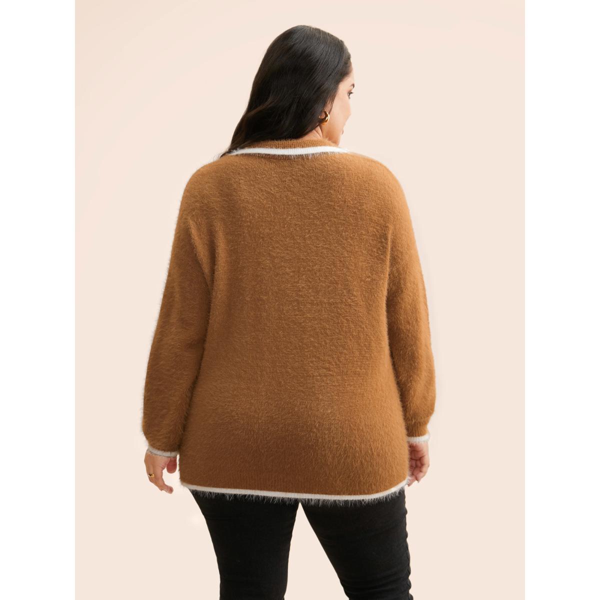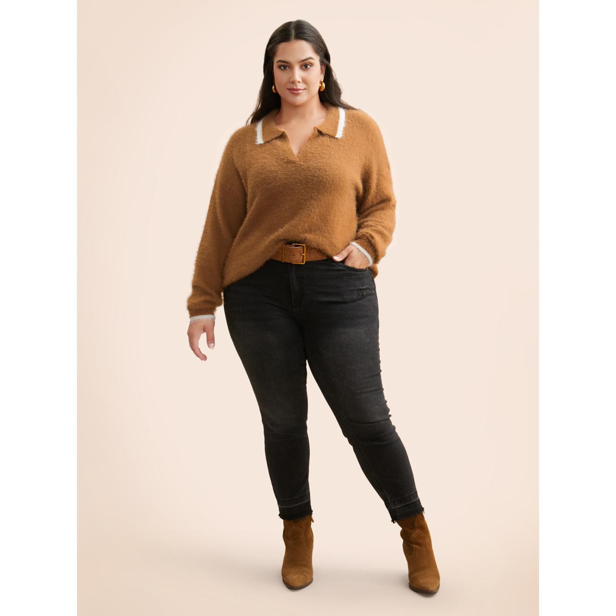 Plus Size Contrast Trim Polo Neck Fluffy Pullover Yellowishbrown Women Casual Long Sleeve Polo Everyday Pullovers BloomChic 30/6X