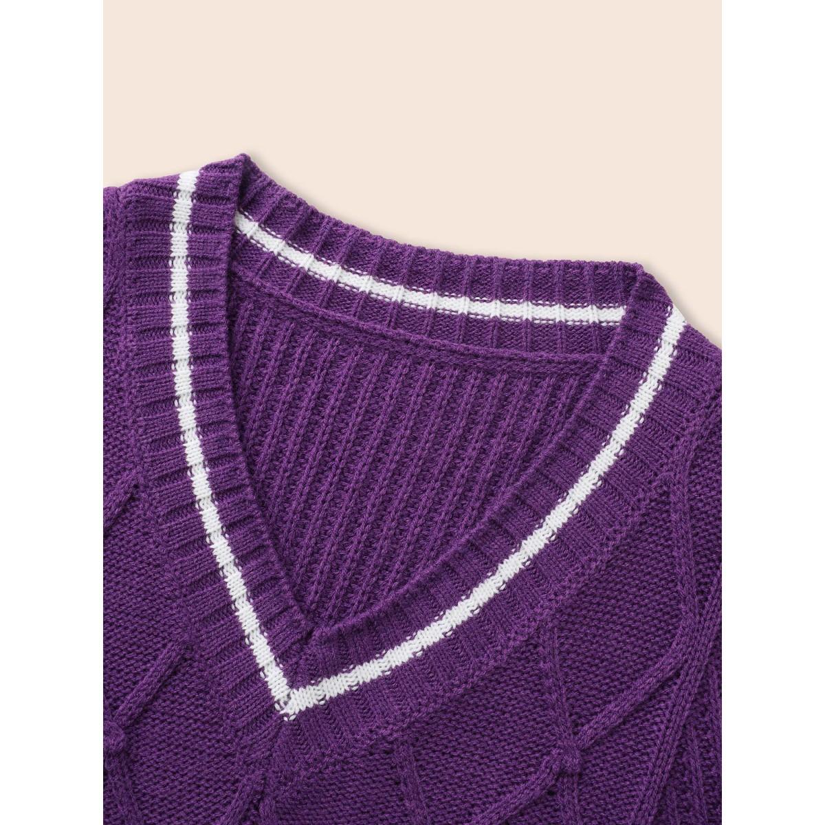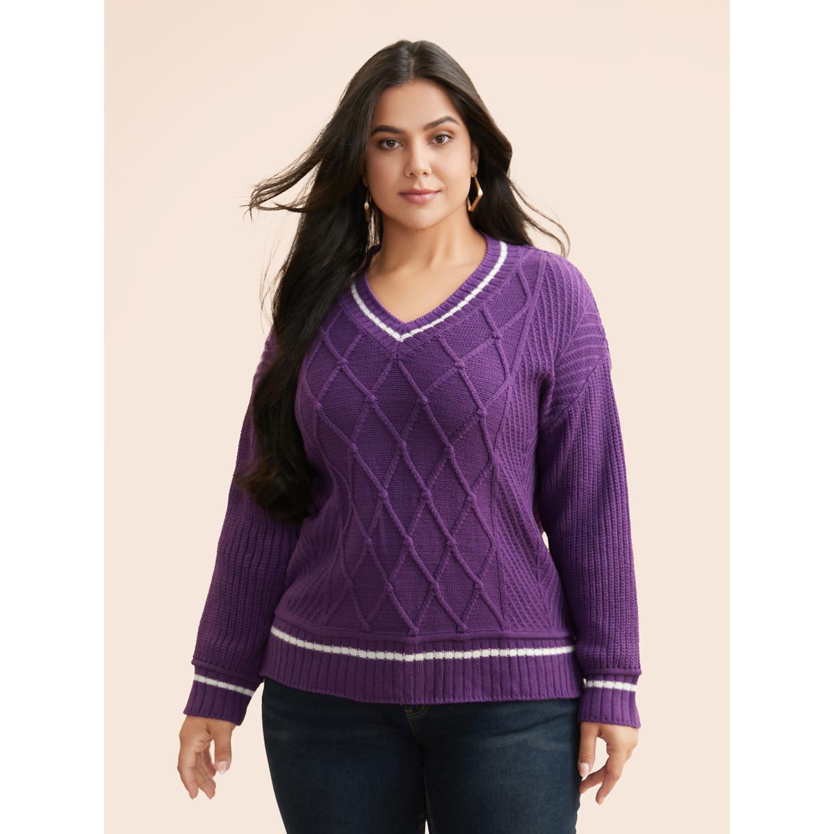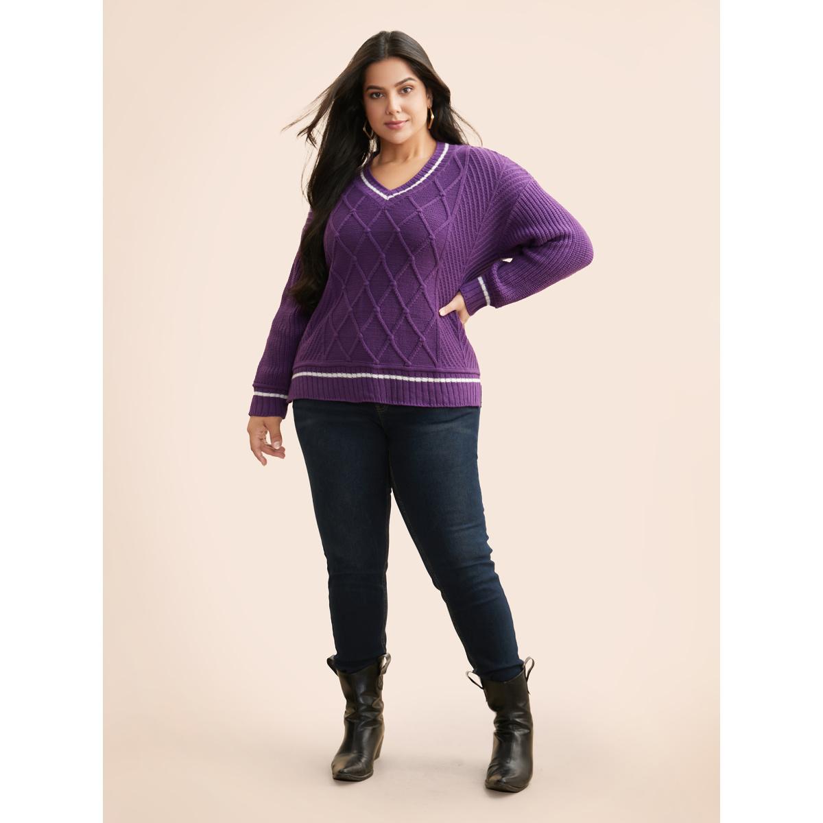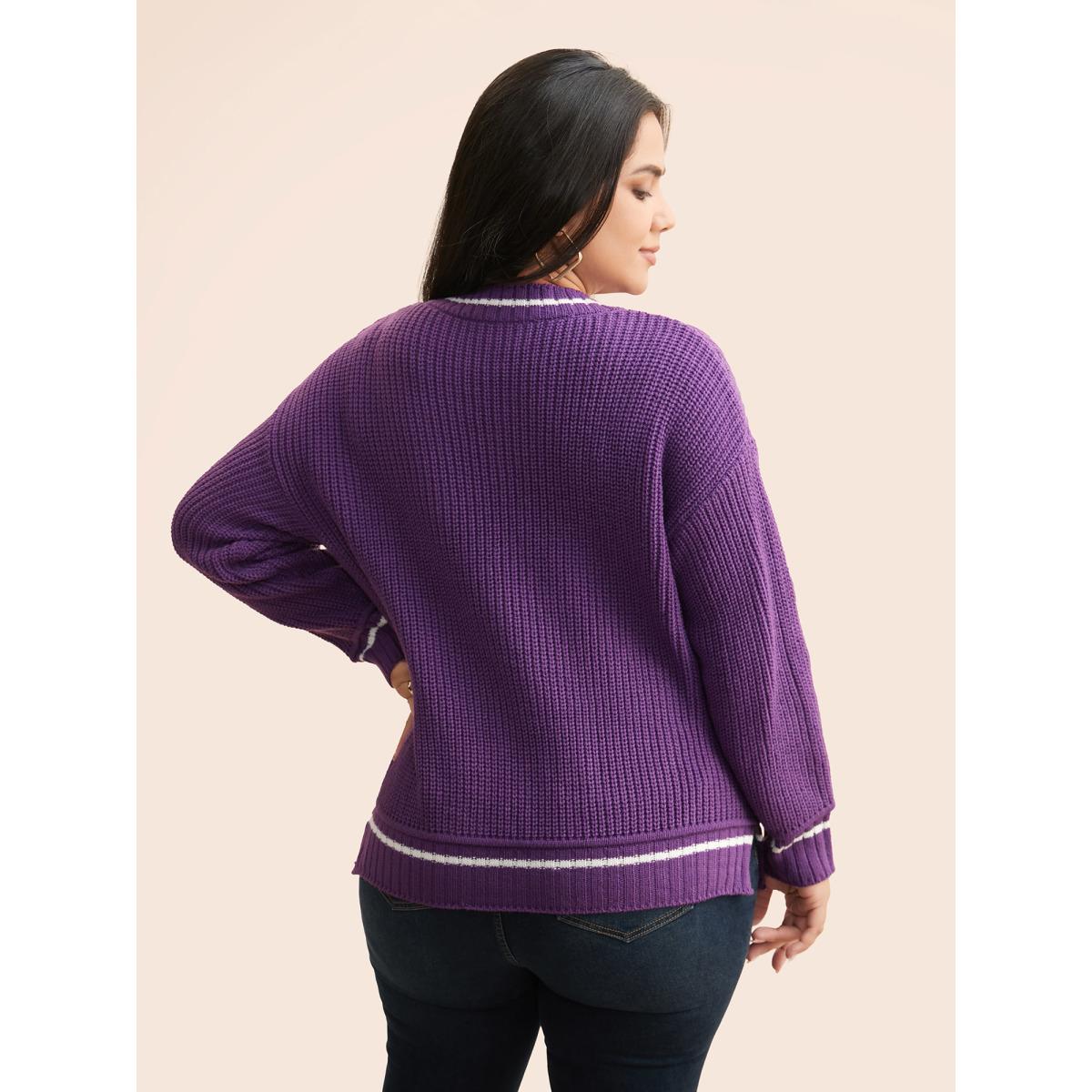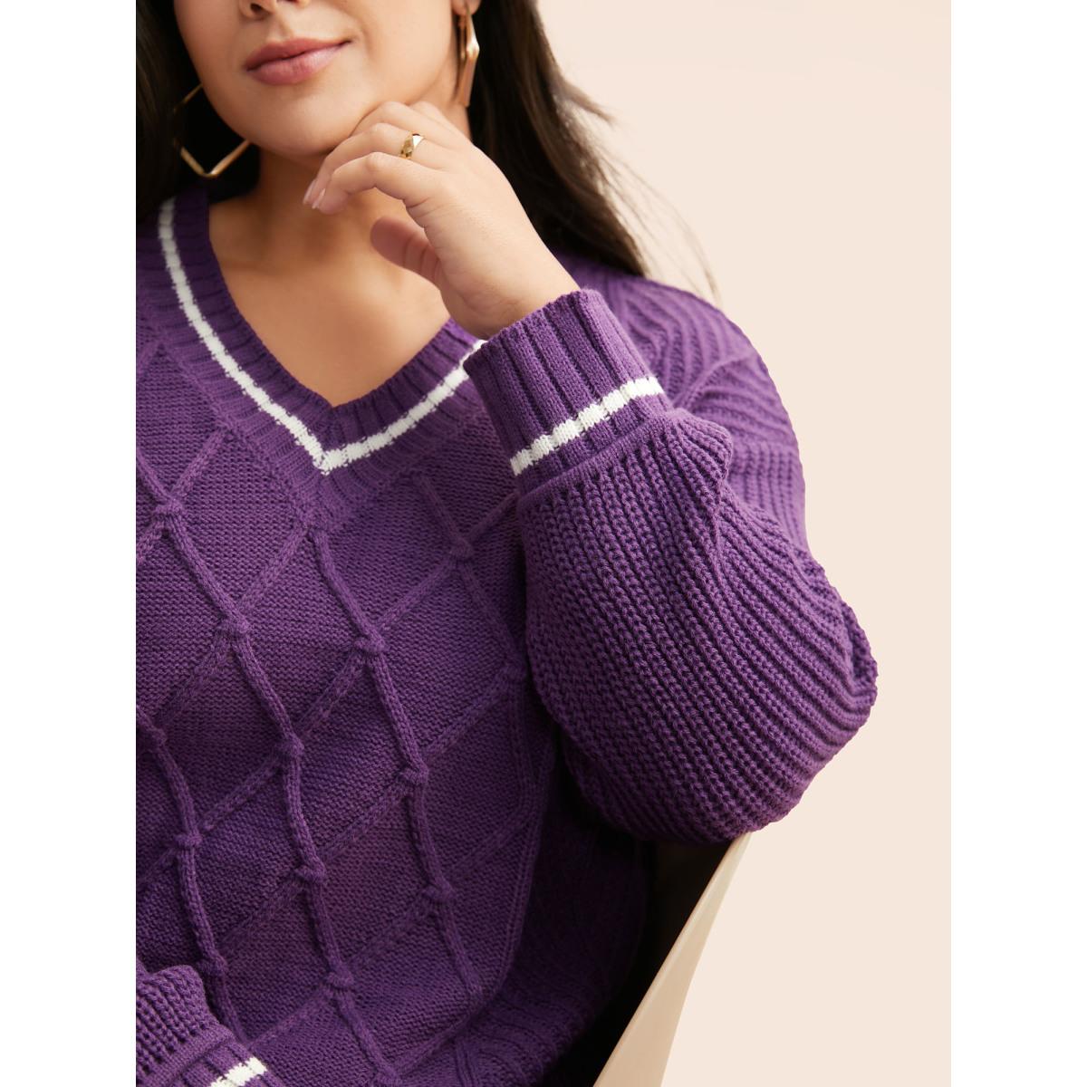 Plus Size Contrast Trim V Neck Texture Pullover DarkViolet Women Casual Loose Long Sleeve V-neck Everyday Pullovers BloomChic 14-16/1X
