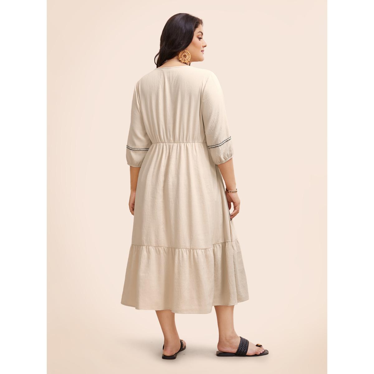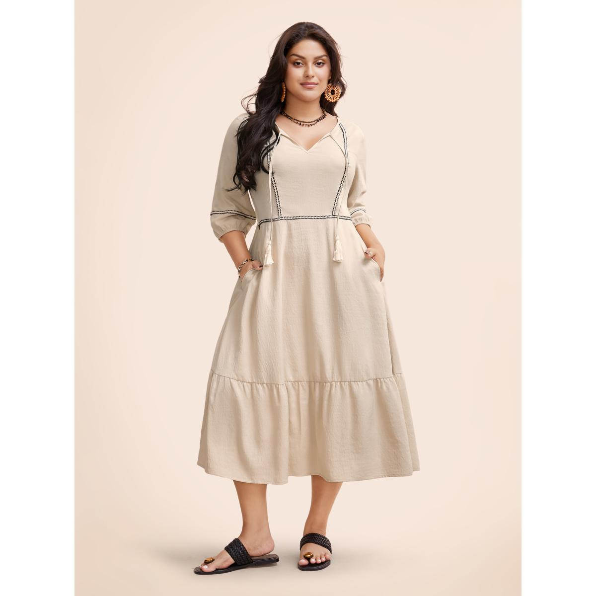 Plus Size Contrast Webbing Tassel Tie Knot Dress Apricot Women Resort Tie knot V-neck Elbow-length sleeve Curvy BloomChic 14-16/1X