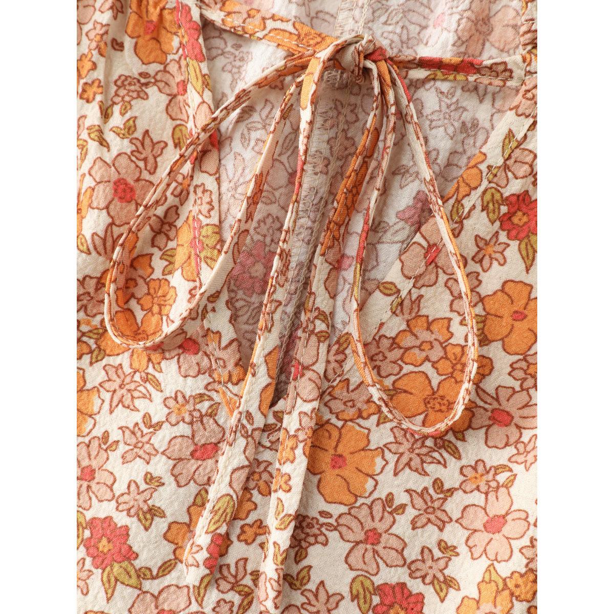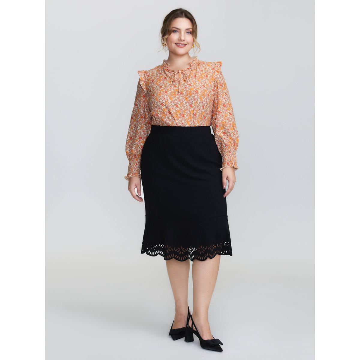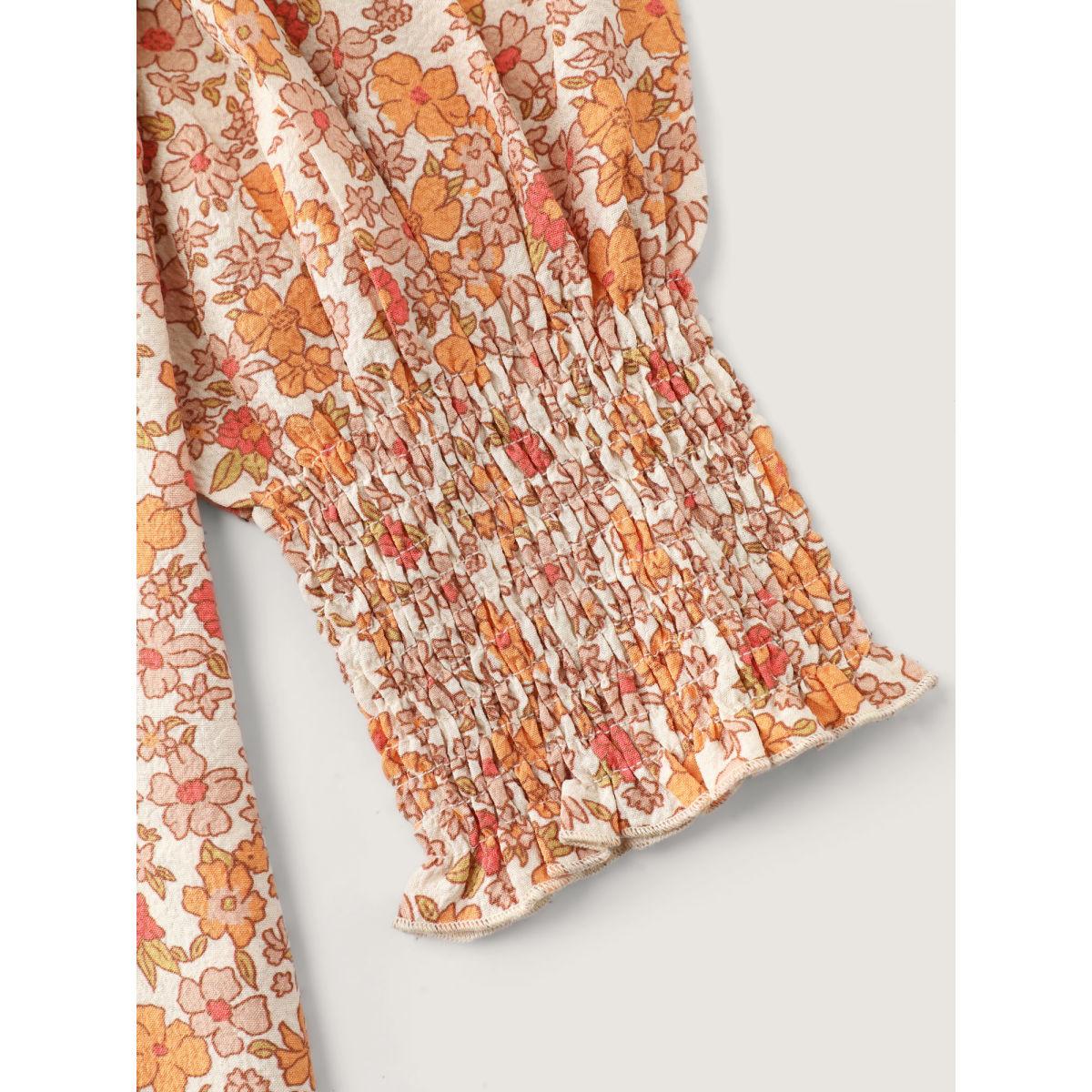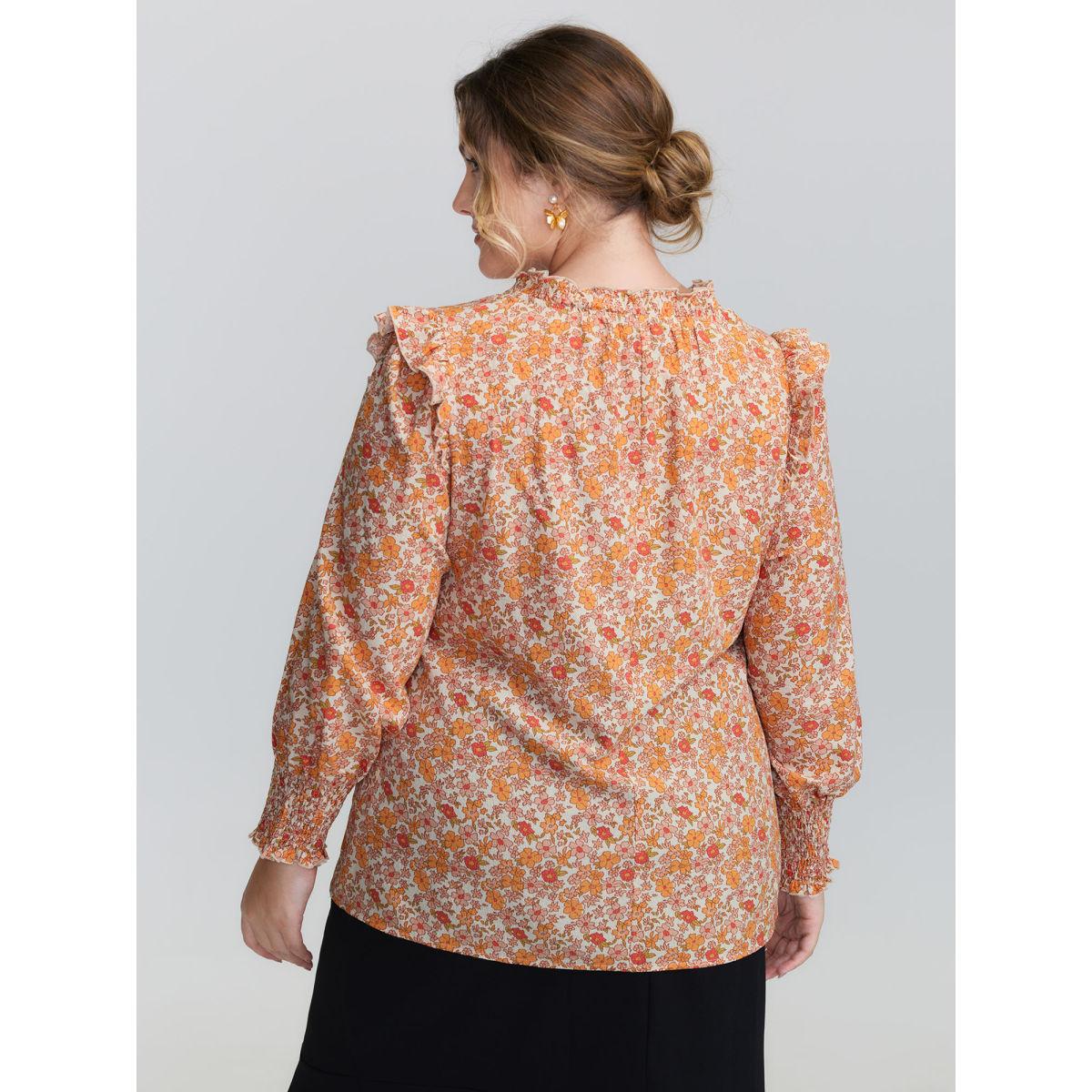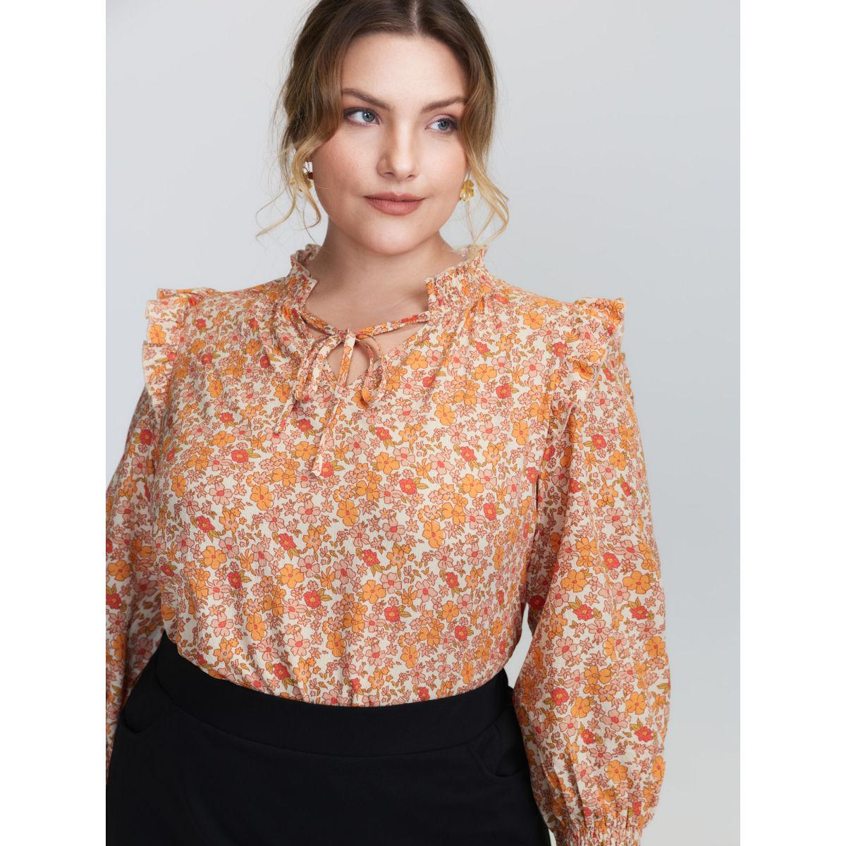 Plus Size Coral Chiffon Floral Print Ruffled Shoulder Blouse Women Timeless Long Sleeve Flat collar with V-notch Elegant Blouses BloomChic 10/M