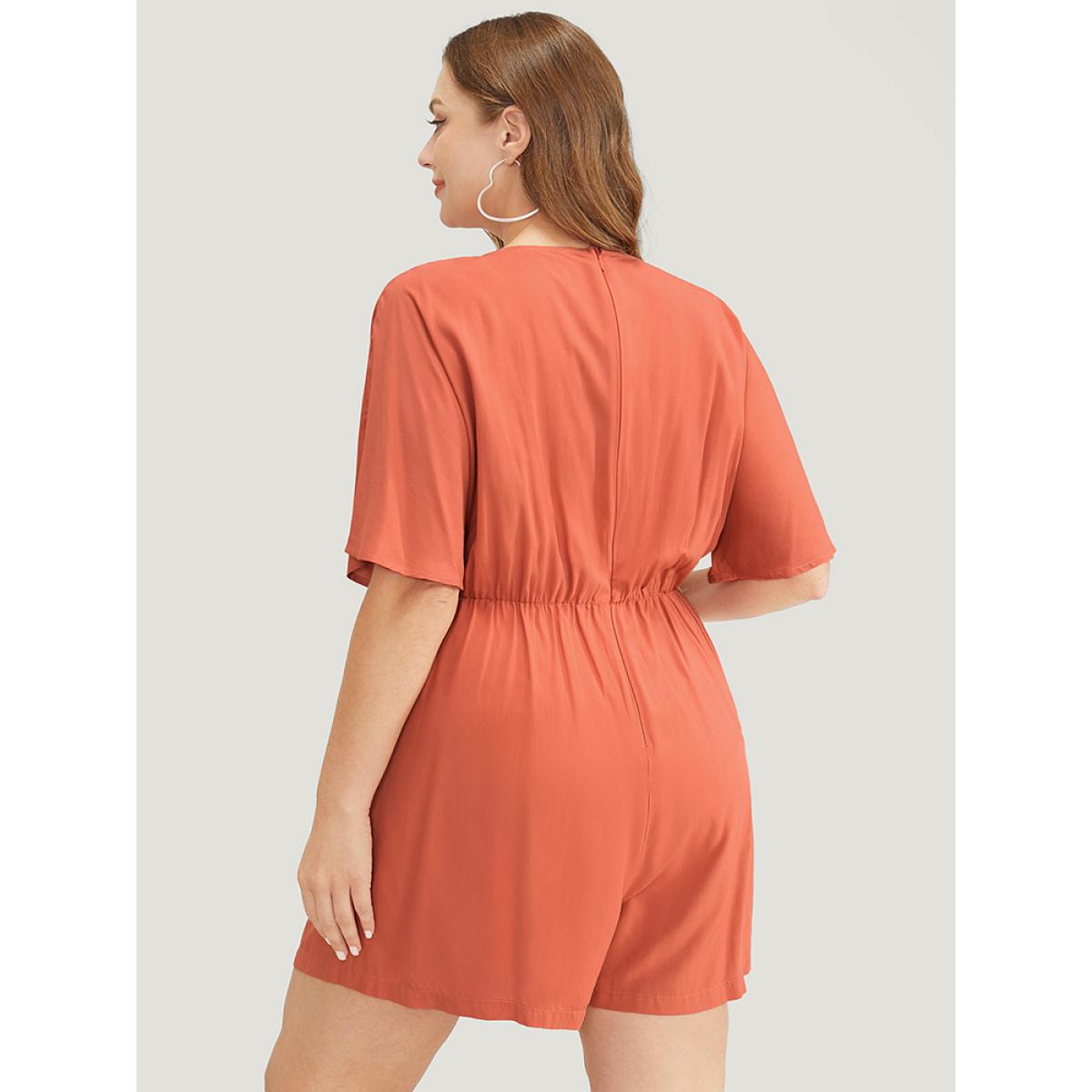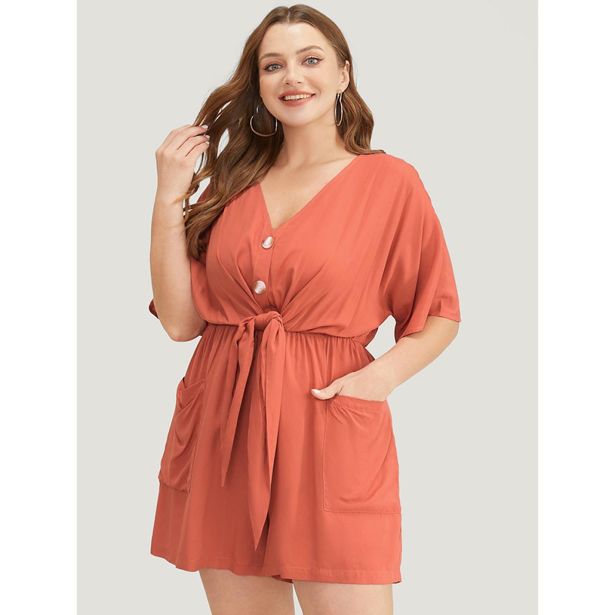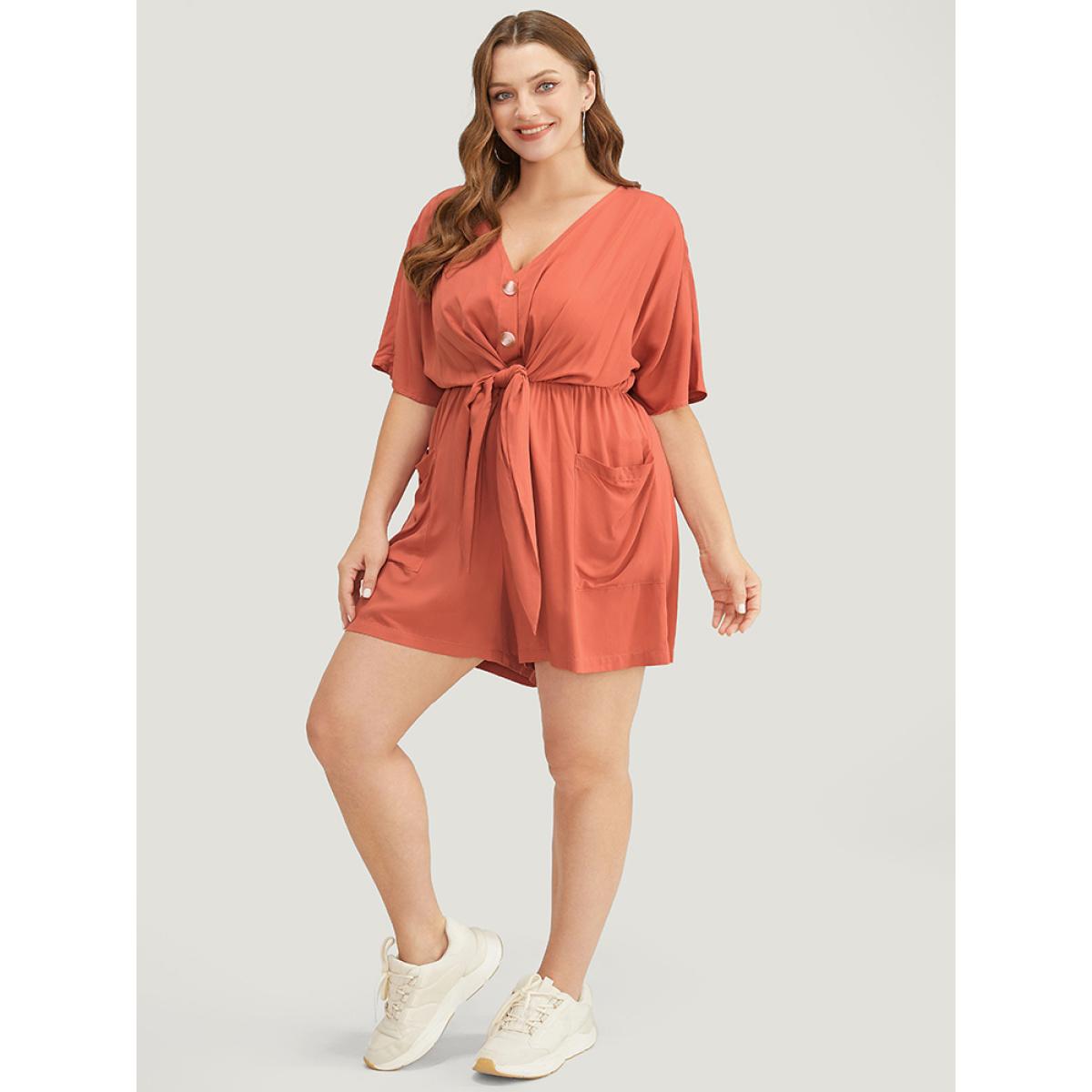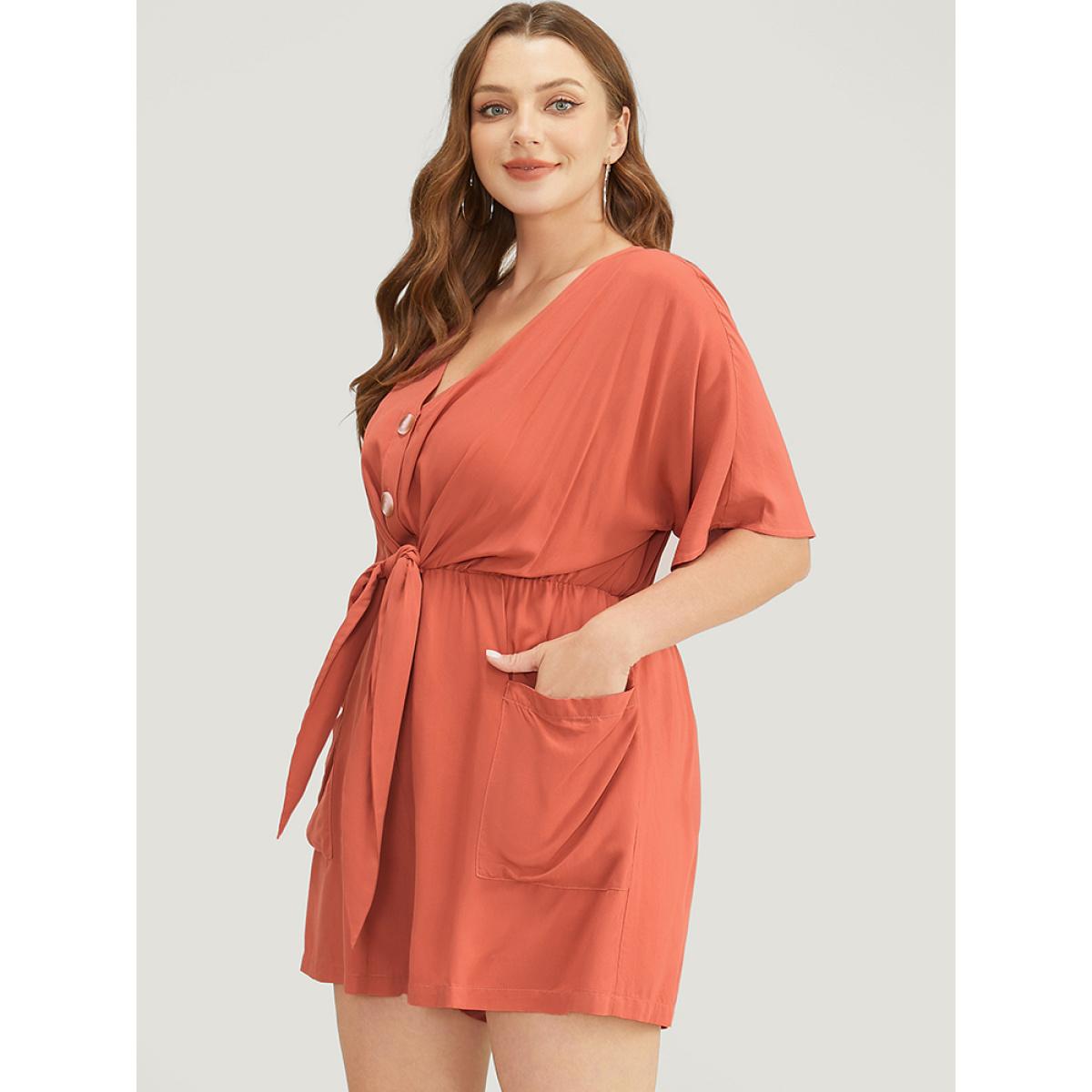 Plus Size Coral Solid Pocket Button Up Belted Knotted Front Romper Women Casual Short sleeve V-neck Dailywear Loose Jumpsuits BloomChic 26/4X