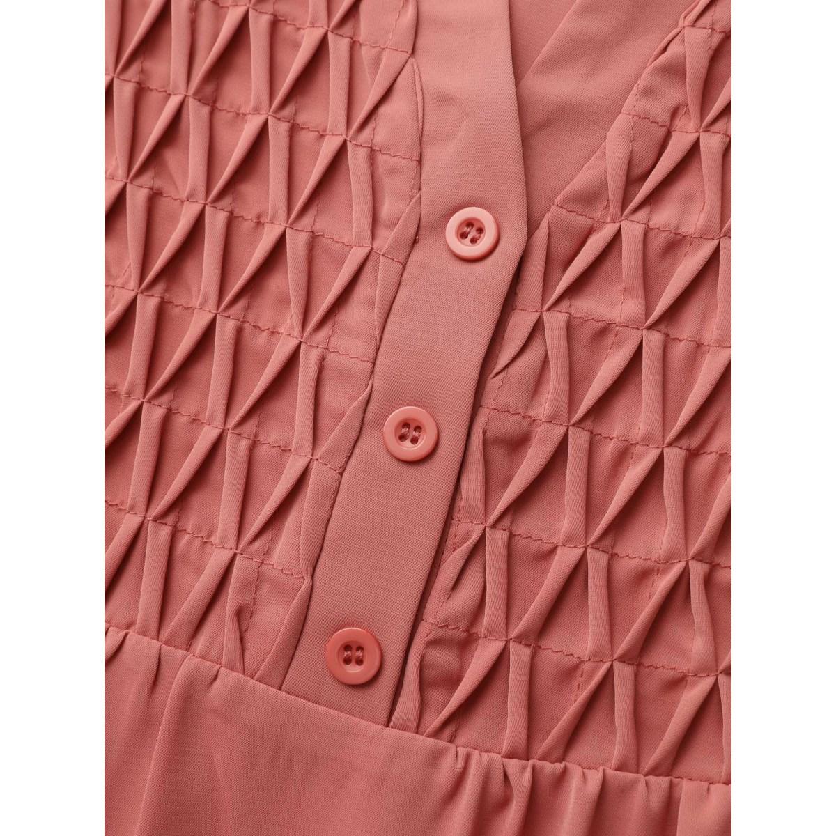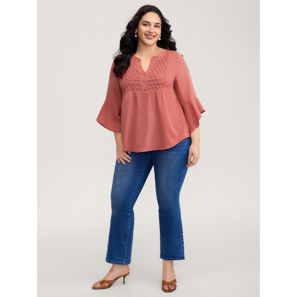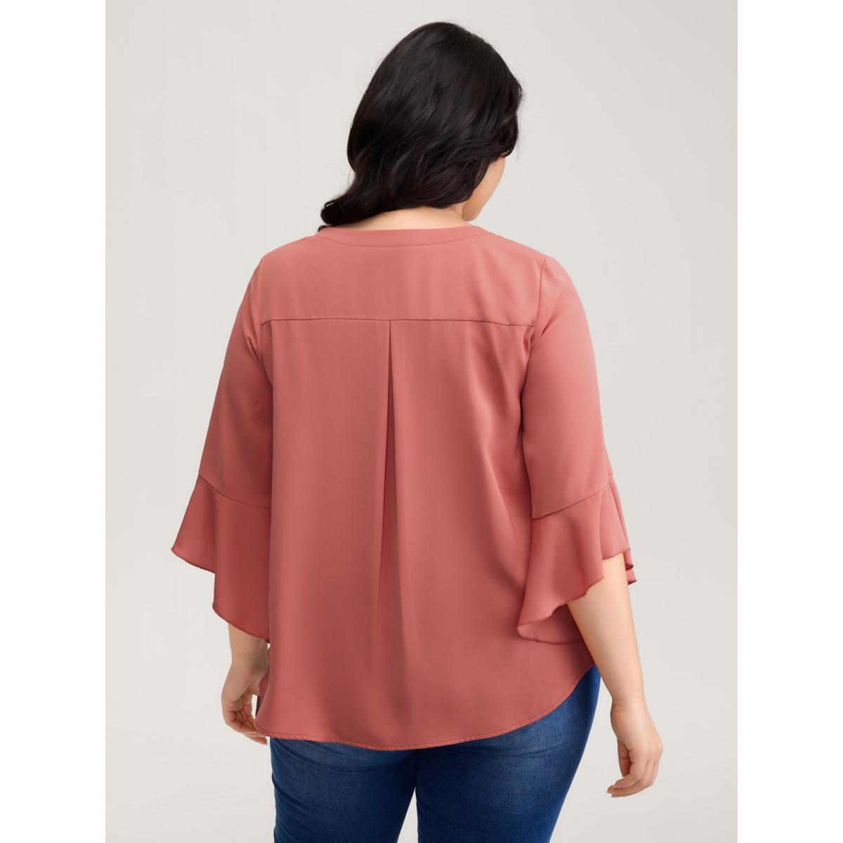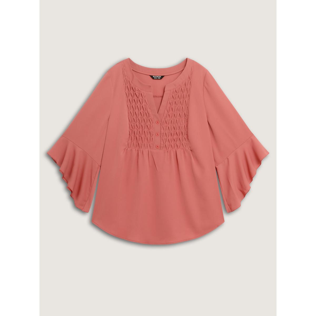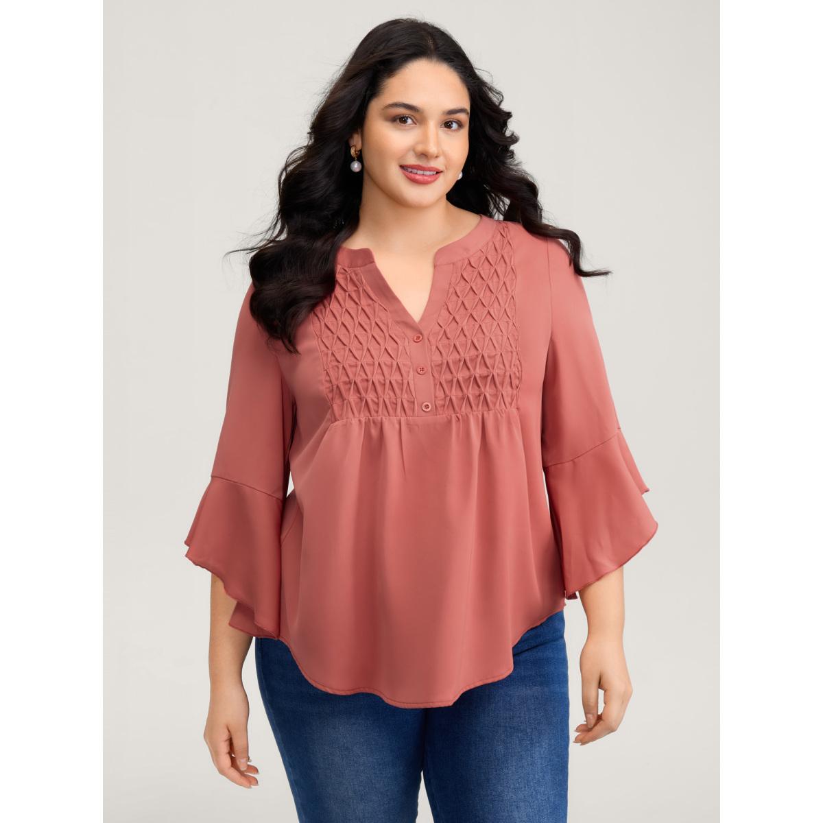 Plus Size Coral Textured Ruffled Sleeve Flowy Blouse Women Romantic Elbow-length sleeve Flat collar with V-notch Elegant Blouses BloomChic 18-20/2X
