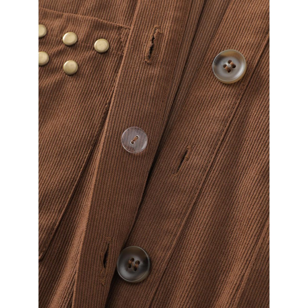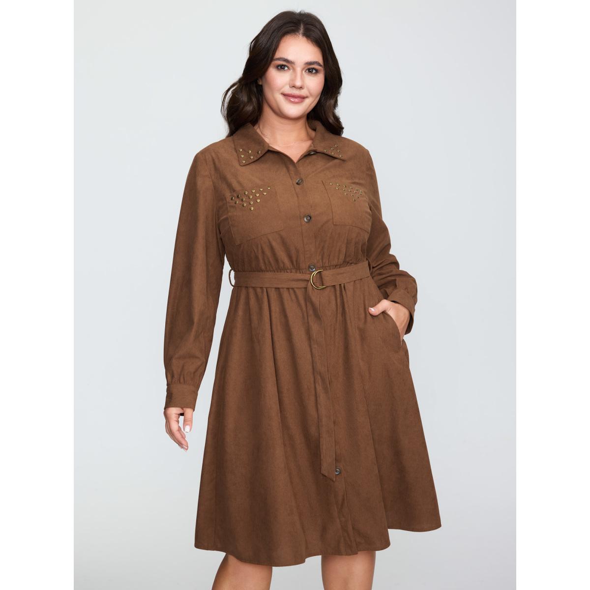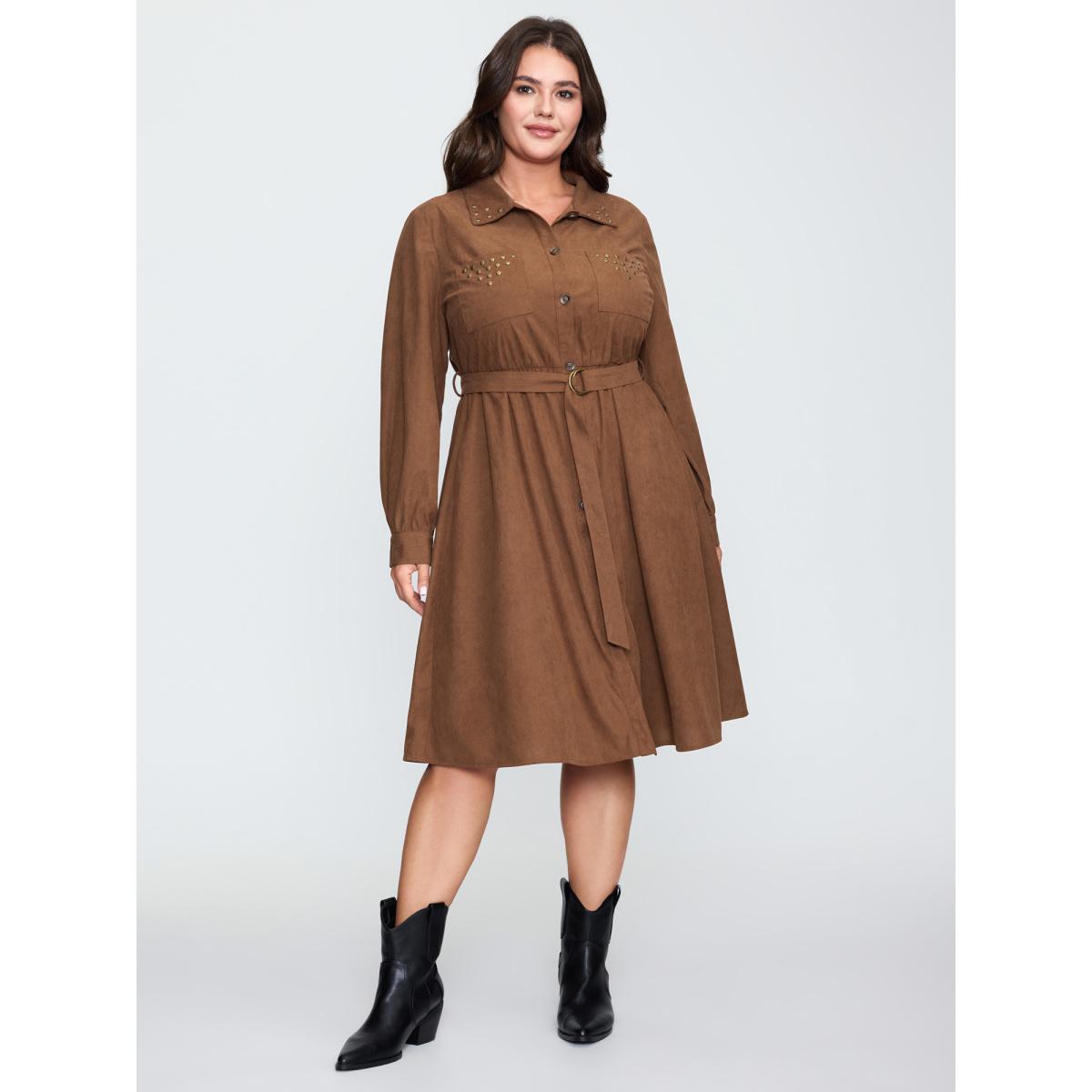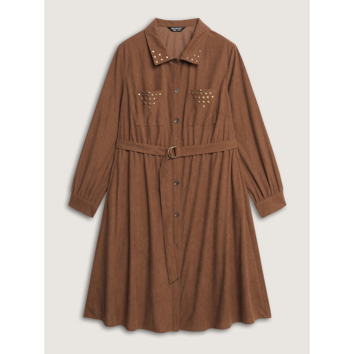 Plus Size Corduroy Rivets Belted Waist Midi Shirt Dress Yellowishbrown Women Leisure Tie knot Shirt collar Long Sleeve Curvy BloomChic 14-16/1X