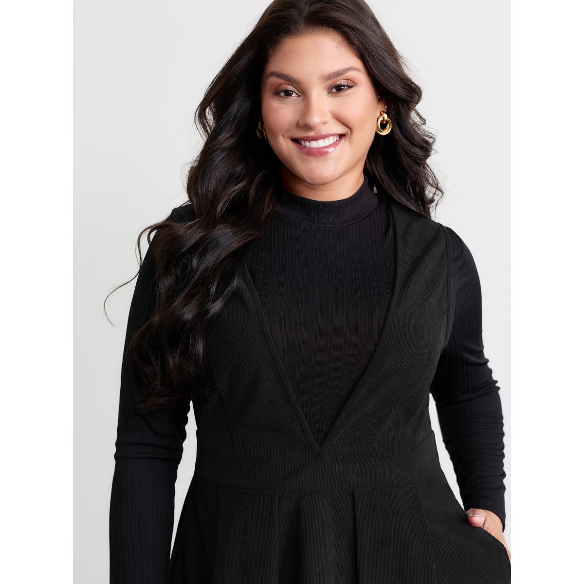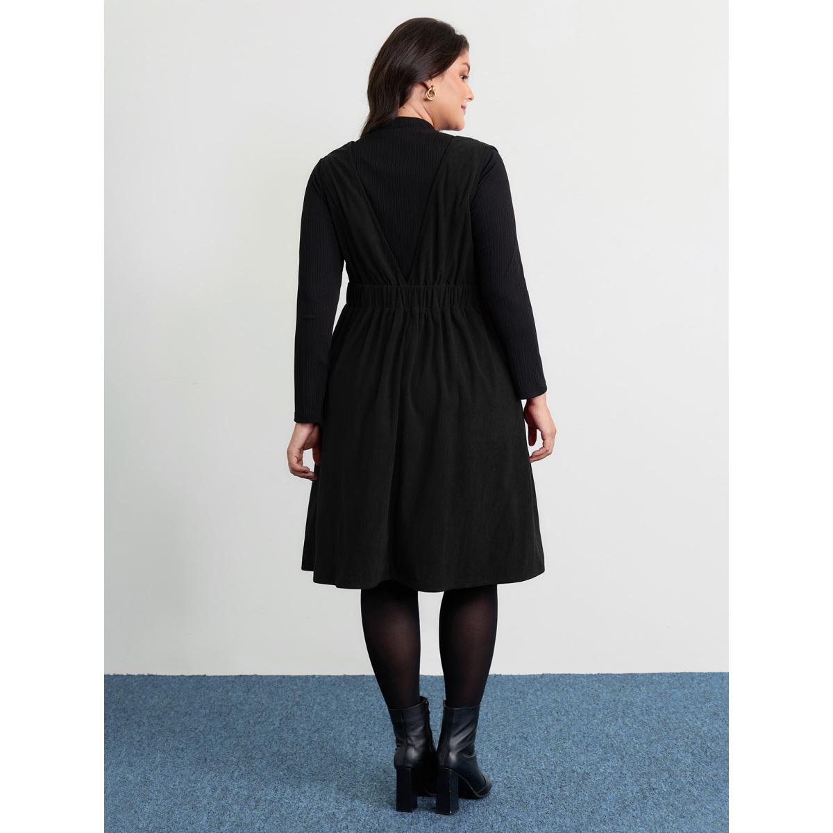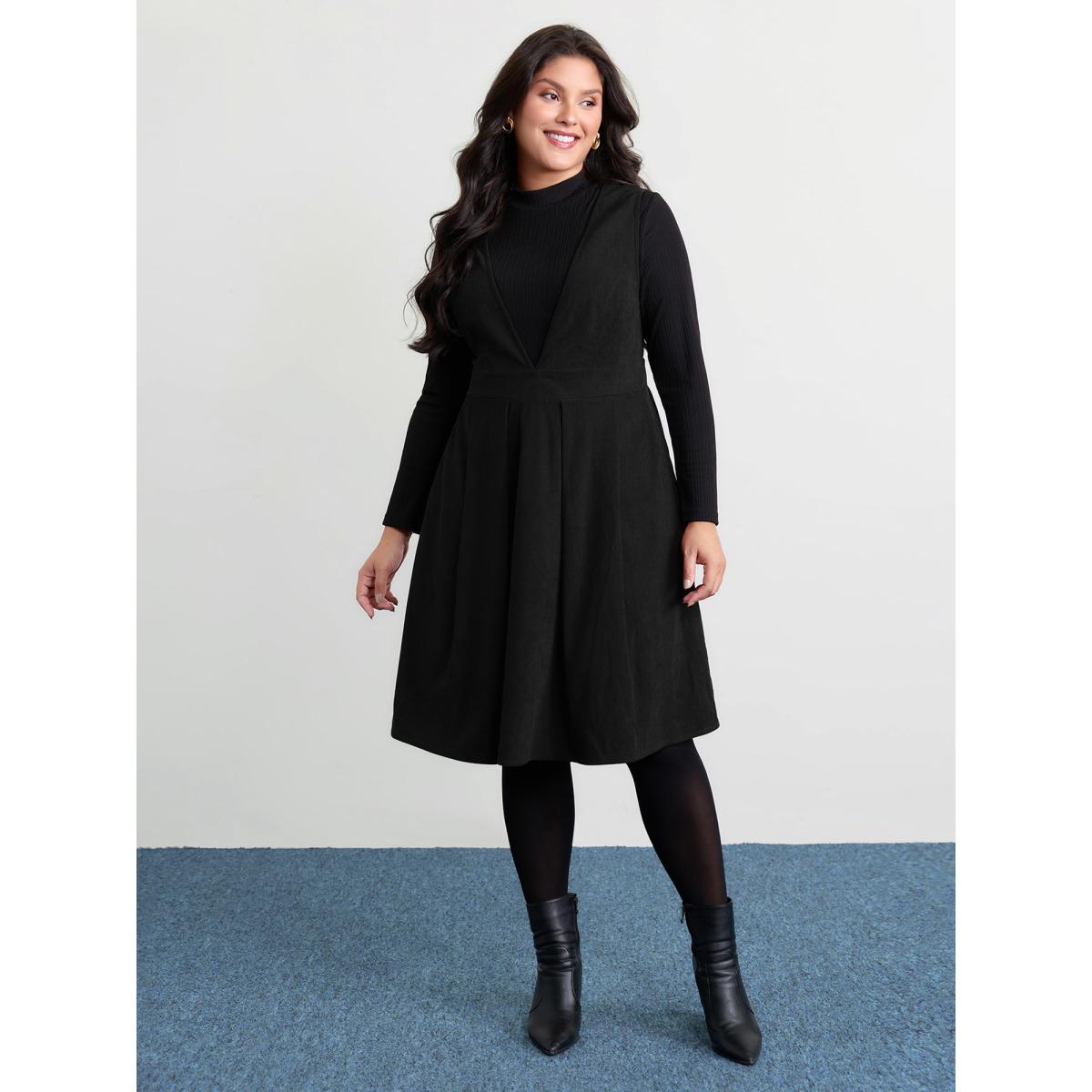 Plus Size Corduroy Stretchy Waist V-Neck Midi Dress Black Women Timeless Pleated Deep V-neck Sleeveless Curvy BloomChic 10/M