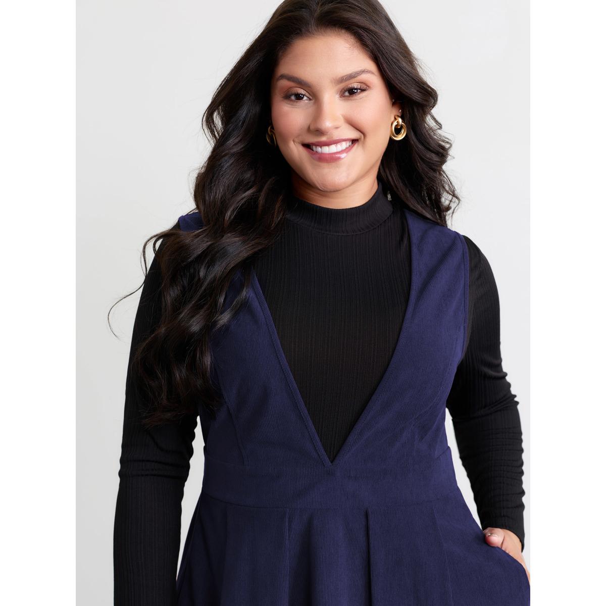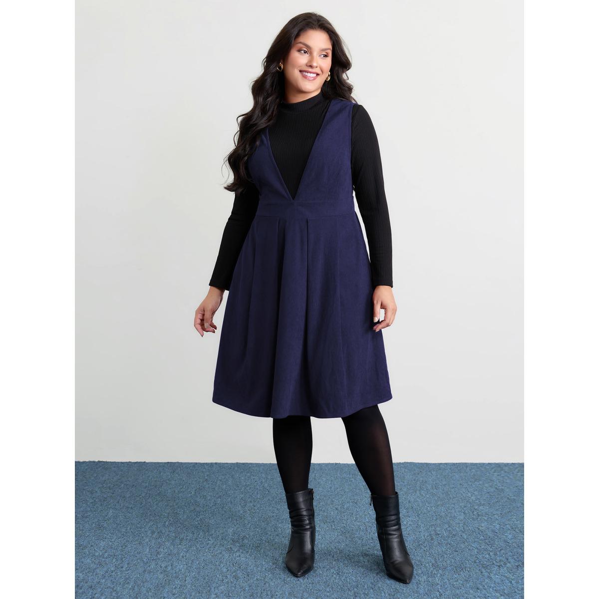 Plus Size Corduroy Stretchy Waist V-Neck Midi Dress Indigo Women Timeless Pleated Deep V-neck Sleeveless Curvy BloomChic 14-16/1X