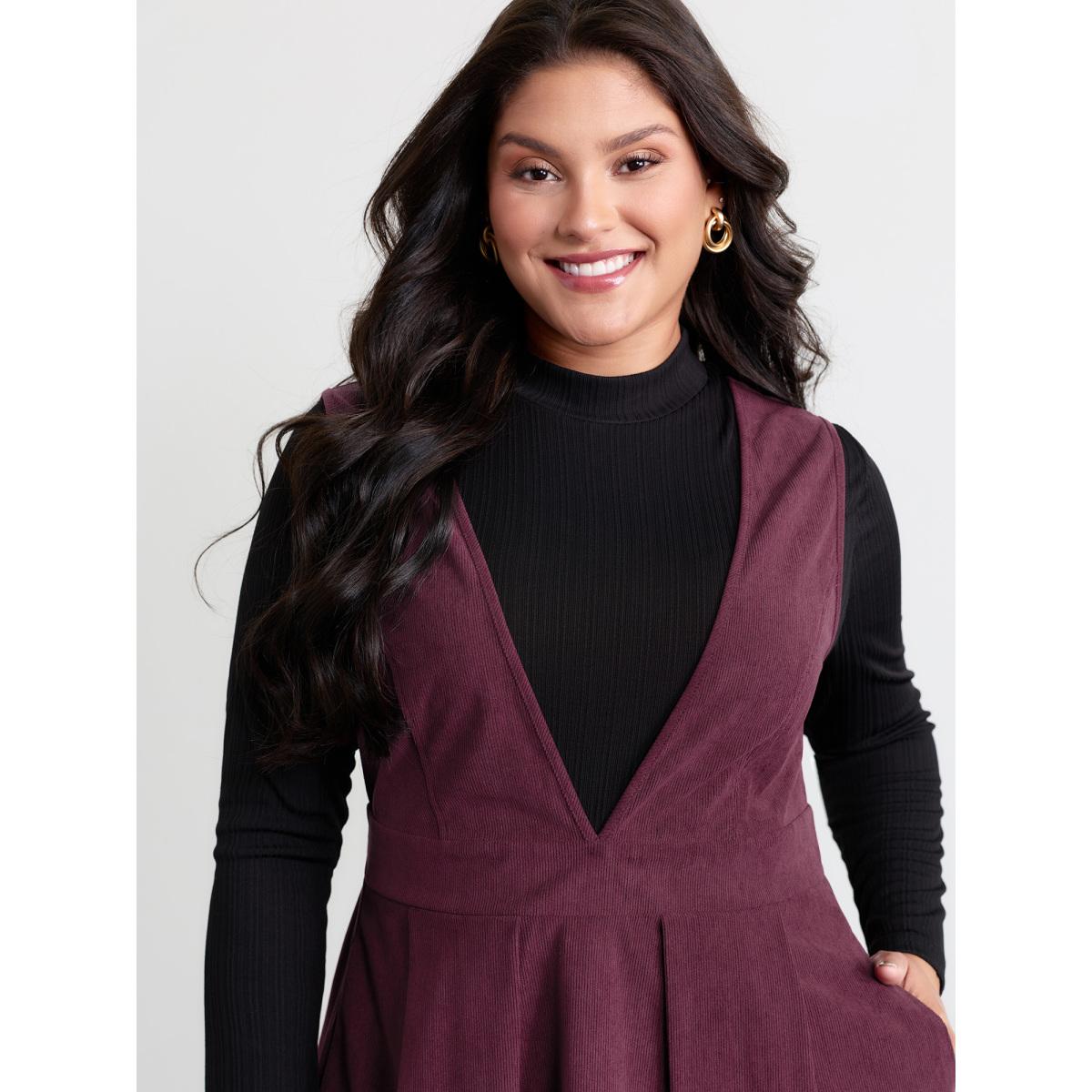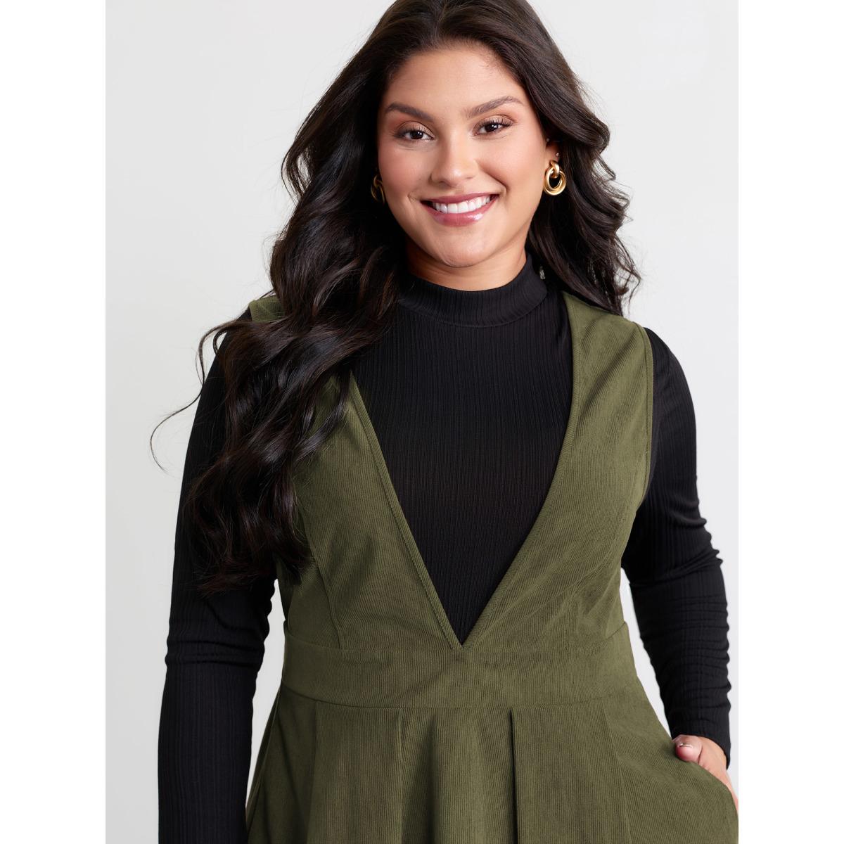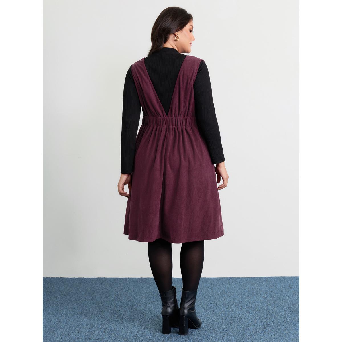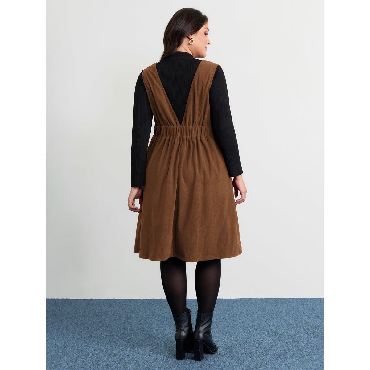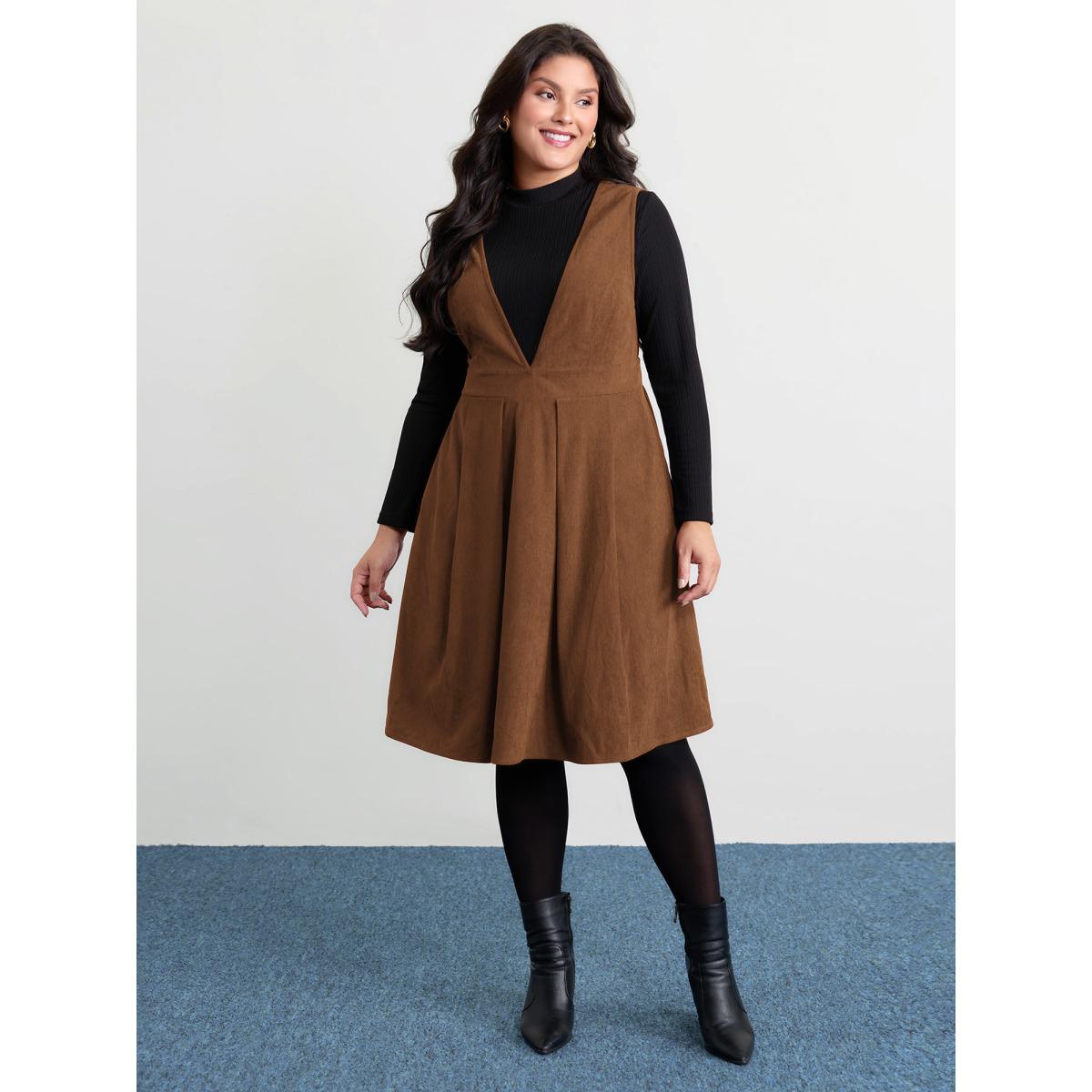 Plus Size Corduroy Stretchy Waist V-Neck Midi Dress Yellowishbrown Women Timeless Pleated Deep V-neck Sleeveless Curvy BloomChic 14-16/1X