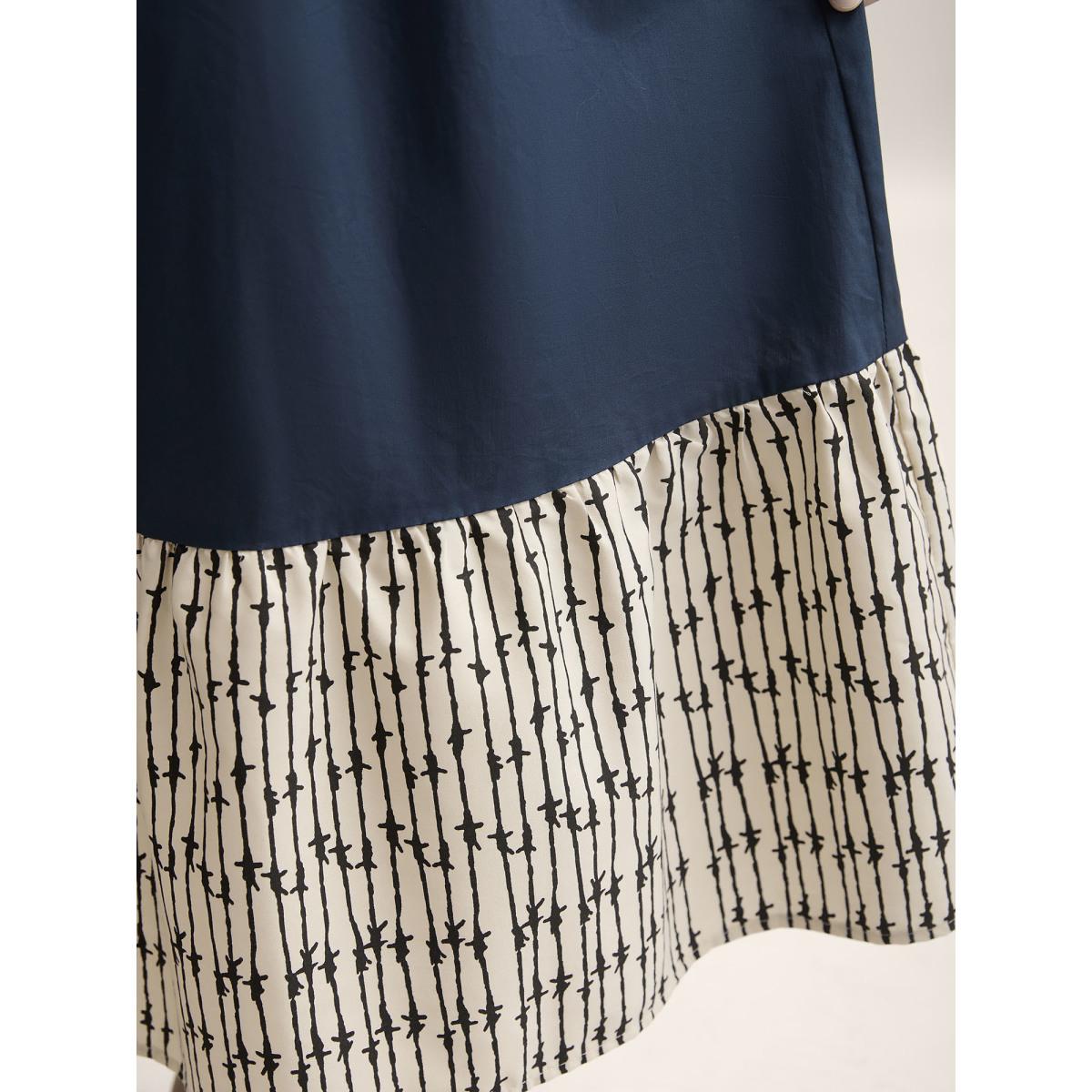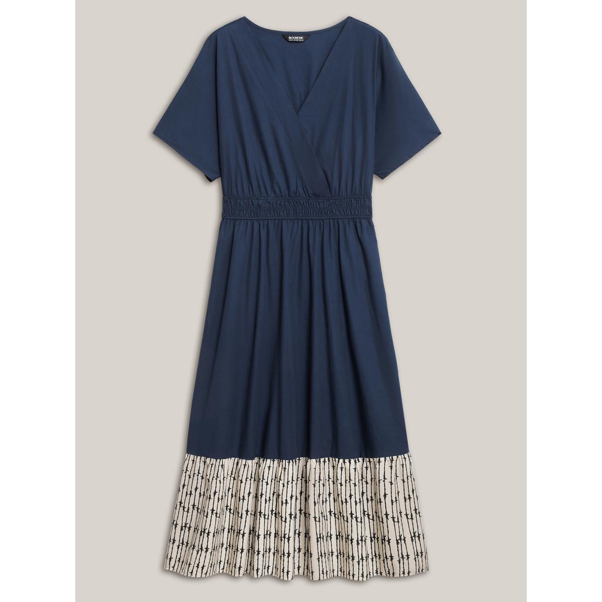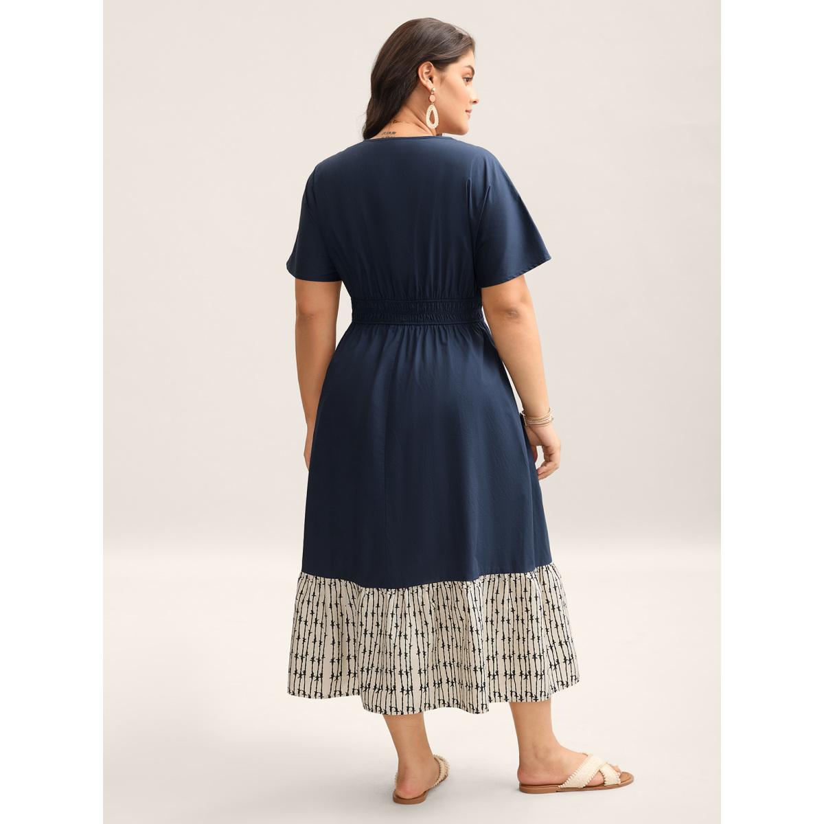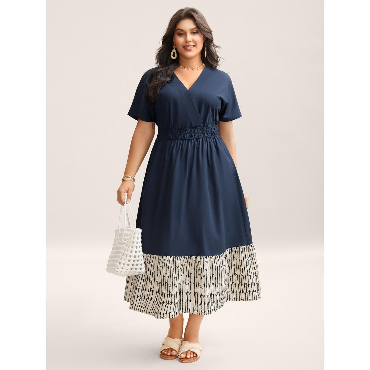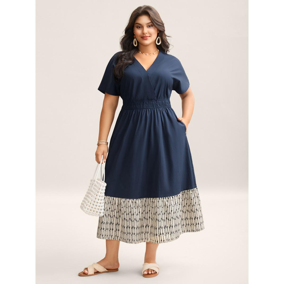 Plus Size Cotton Color Block Cinched-Waist Spliced Maxi Dress Navy Women Resort Gathered V-neck Short sleeve Curvy BloomChic 18-20/2X