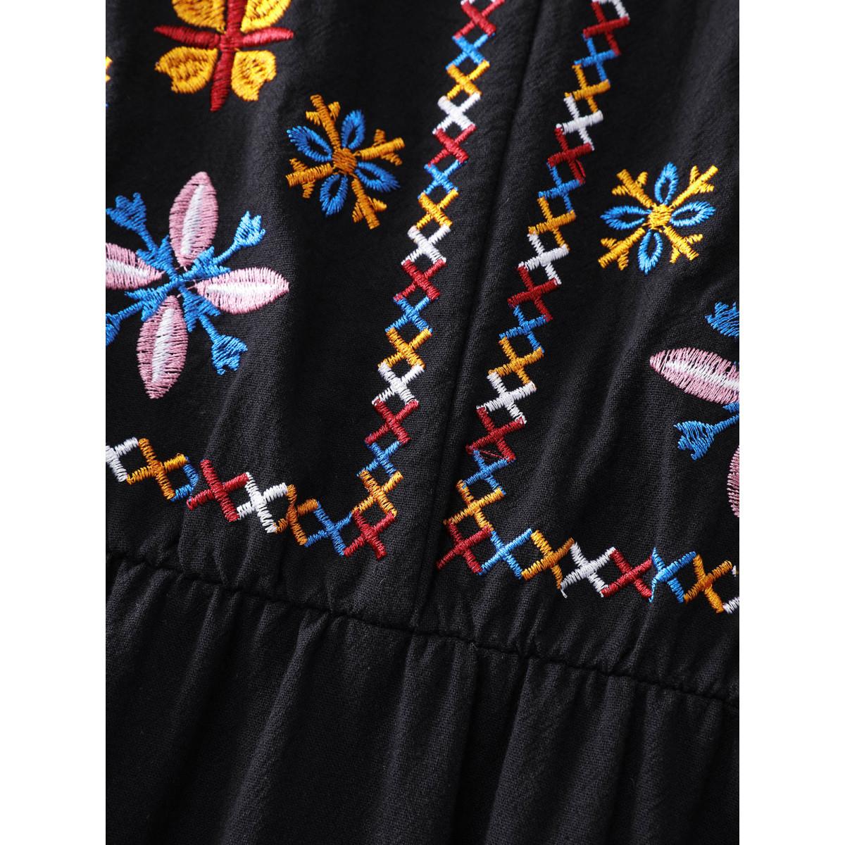 Plus Size Floral Embroidered Notched Collar Midi Dress Black Women Boho Embroidered Flat collar with V-notch Cap Sleeve Curvy BloomChic 14-16/1X