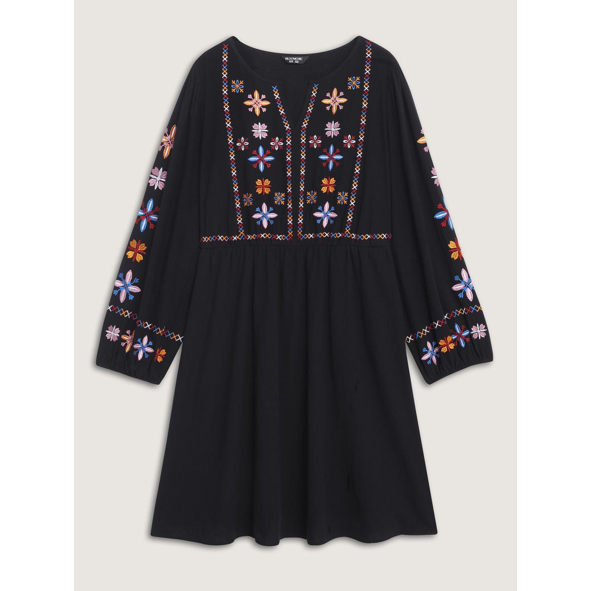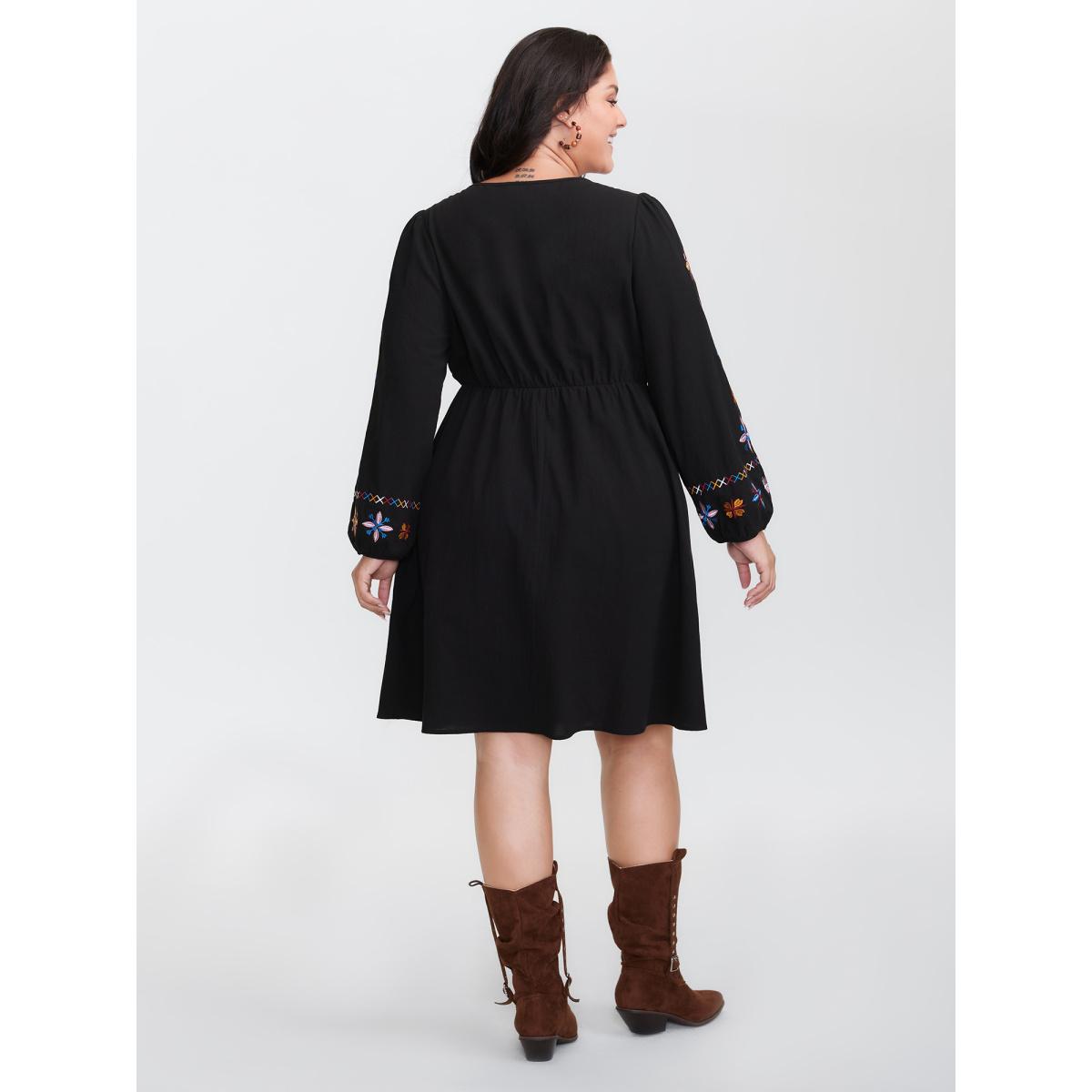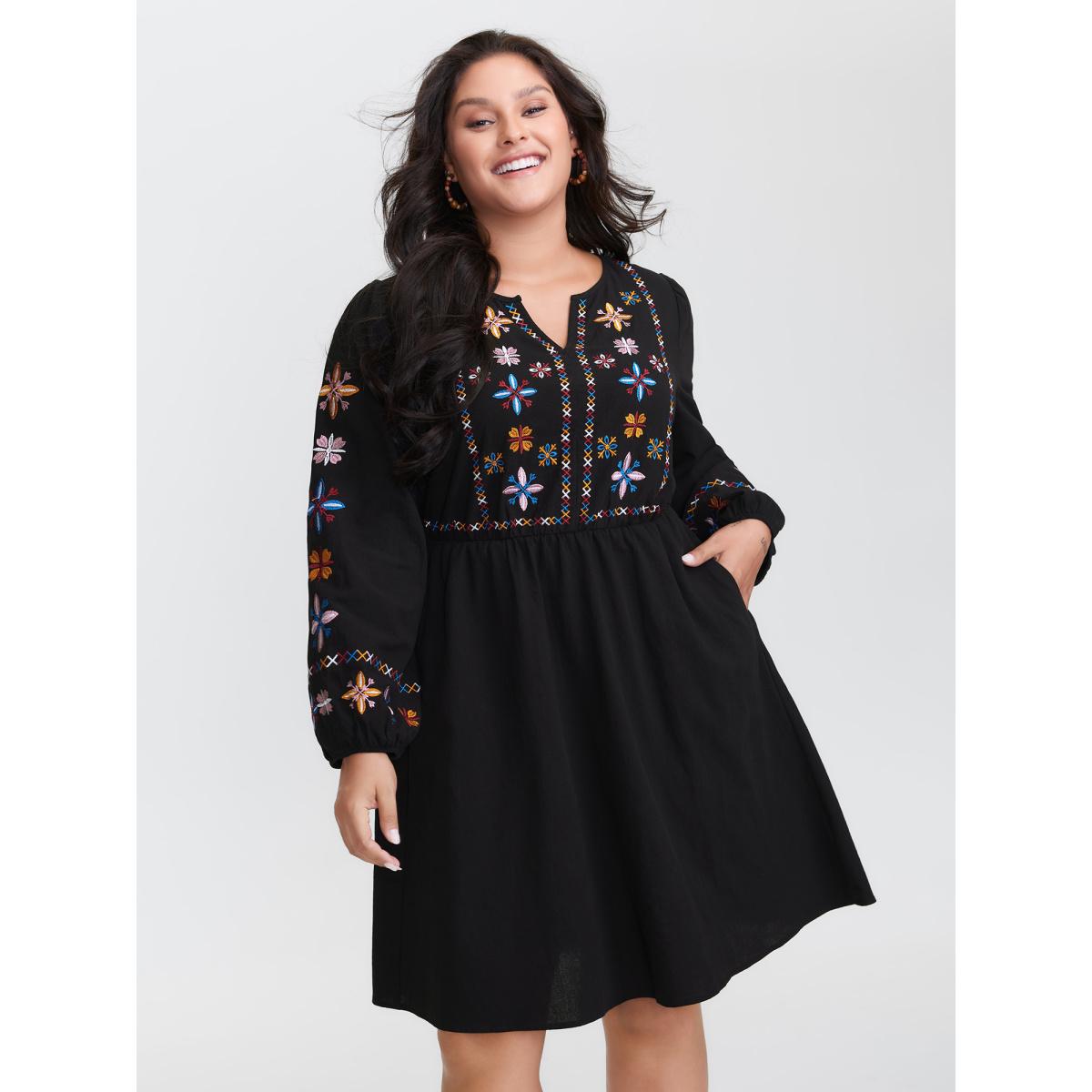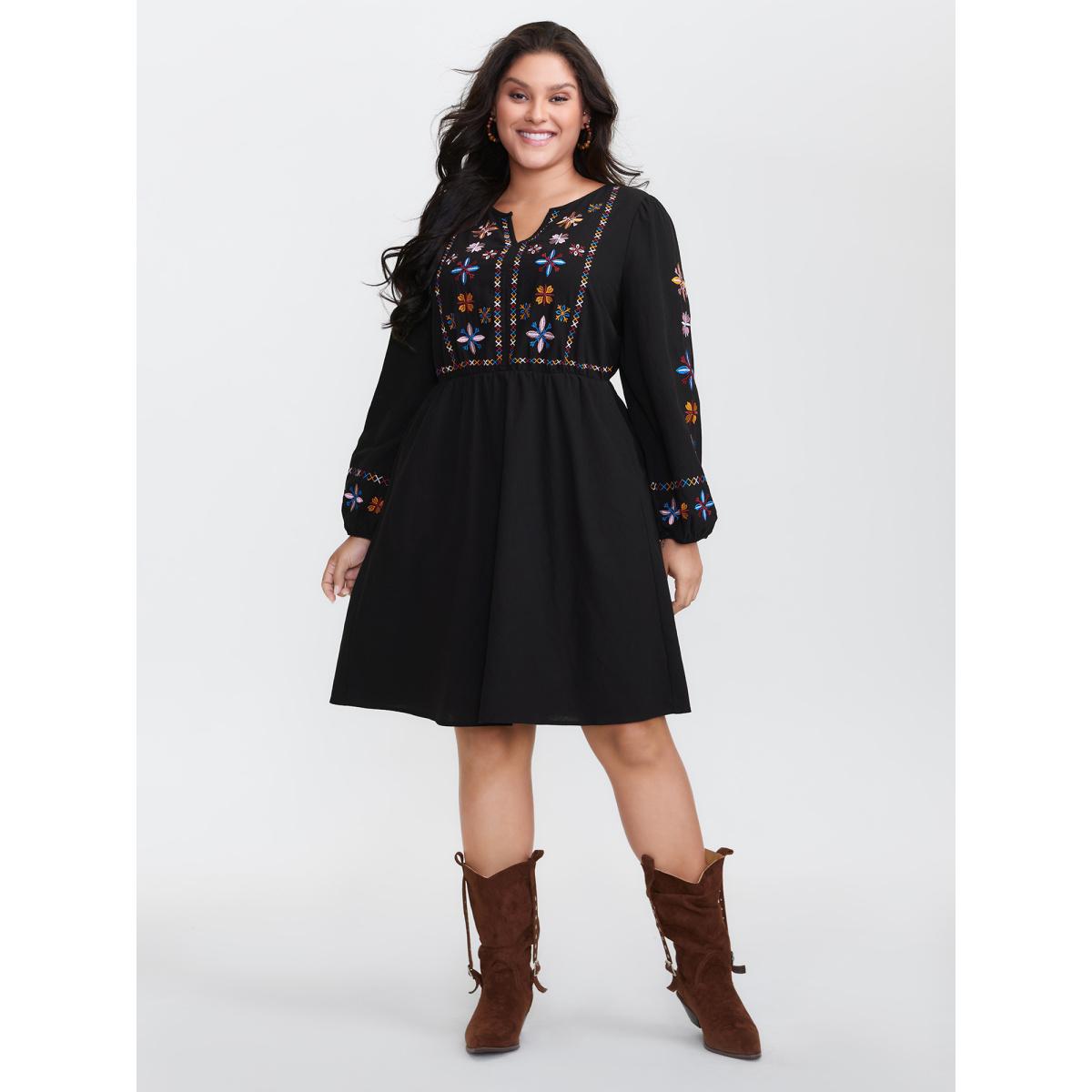 Plus Size Floral Embroidered Notched Midi Dress Black Women Elegant Elastic cuffs Notched collar Long Sleeve Curvy Midi Dress BloomChic 10/M
