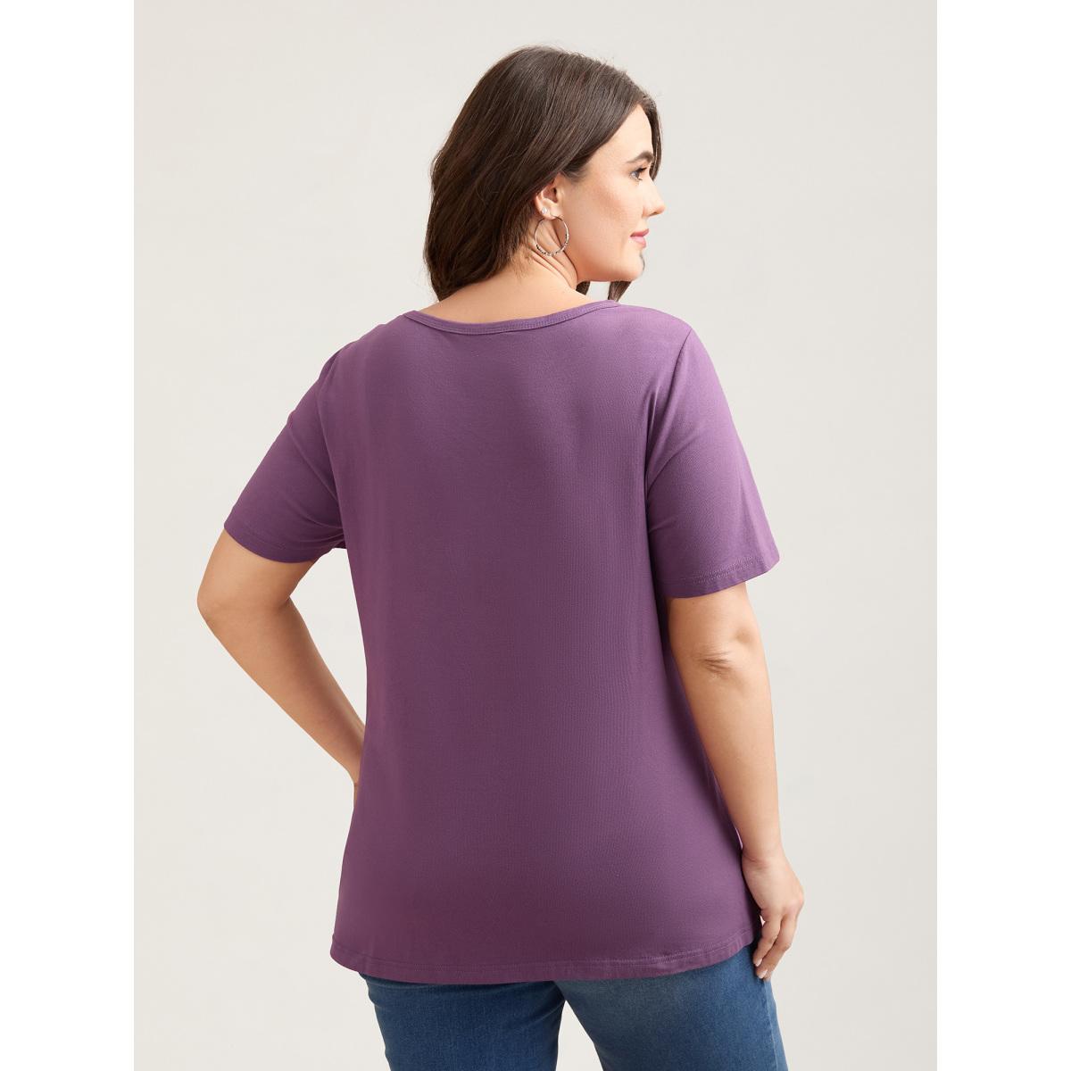 Plus Size Plain Button Detail Curved Hem T-shirt Purple Women Casual Plain Plain Round Neck Dailywear T-shirts BloomChic 26/4X