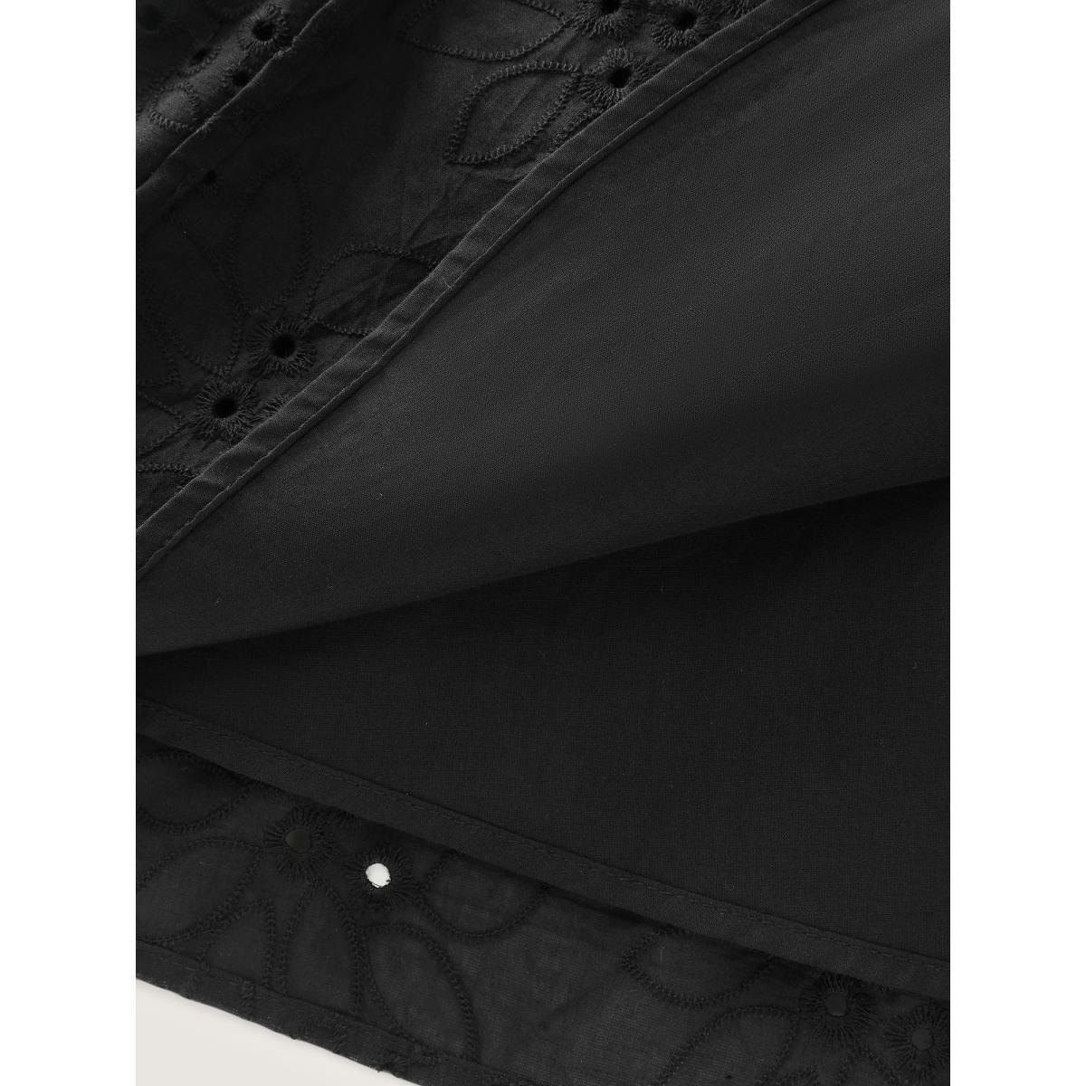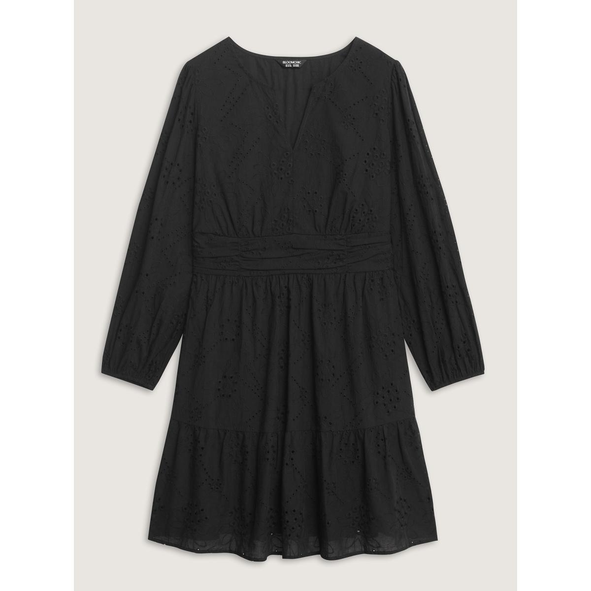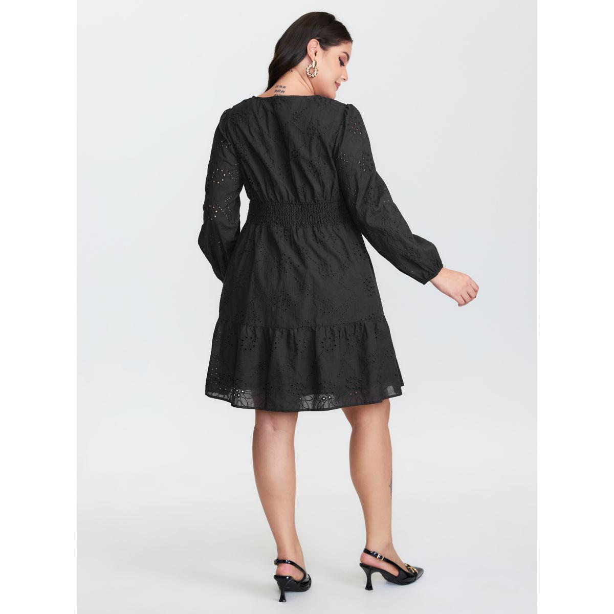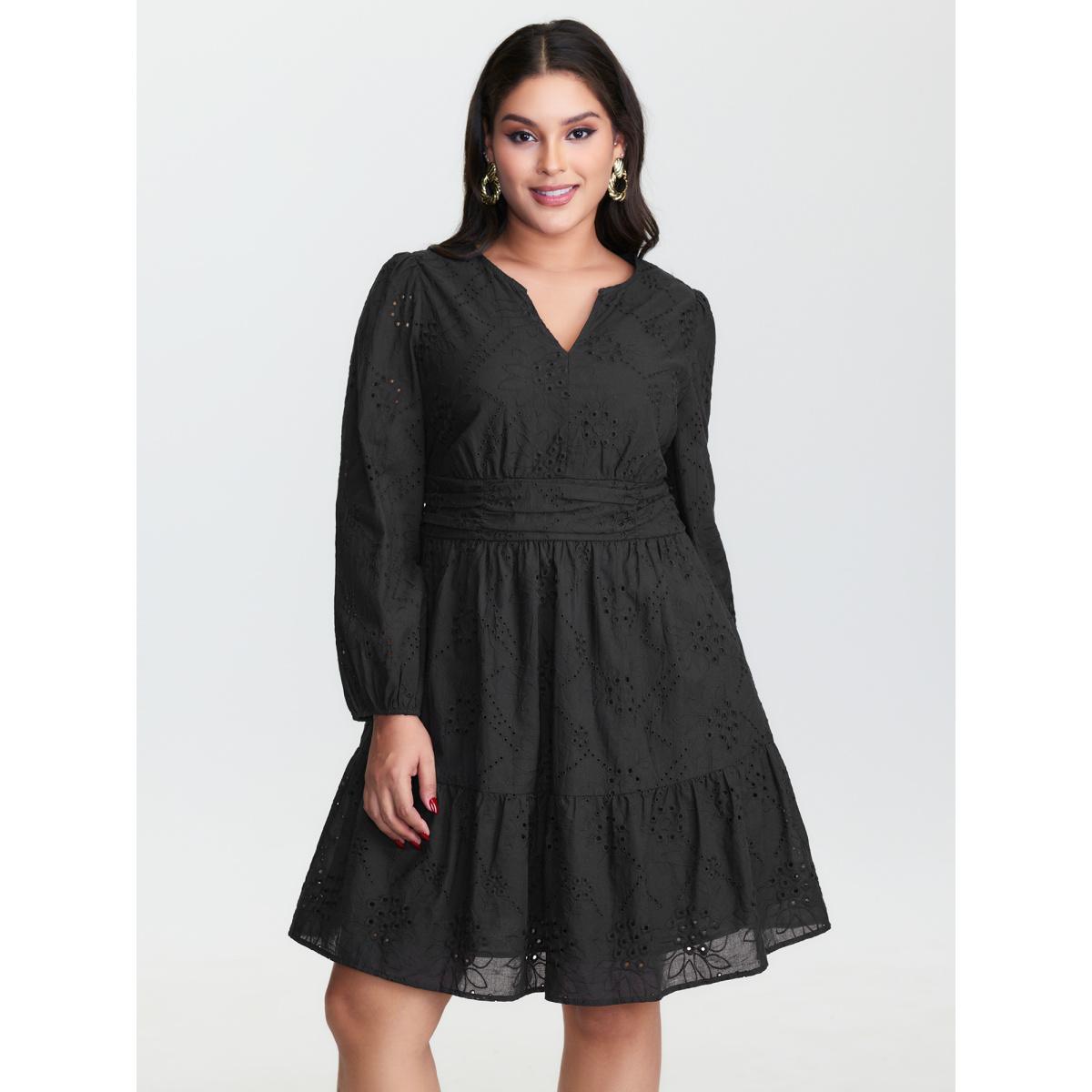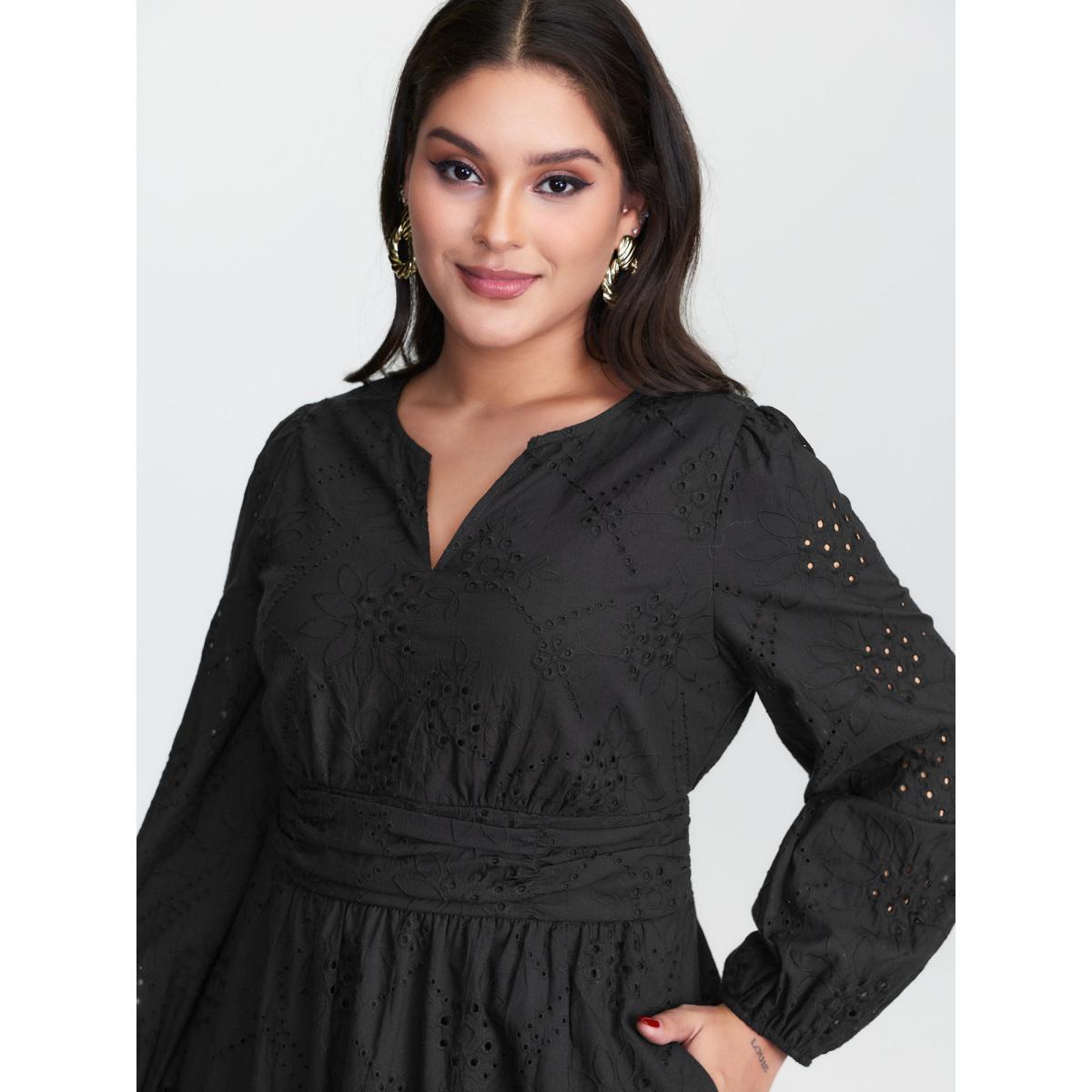 Plus Size Cotton Floral Eyelet Embroidery Tiered Midi Dress Black Women Timeless Texture Flat collar with V-notch Long Sleeve Curvy BloomChic 28/5X