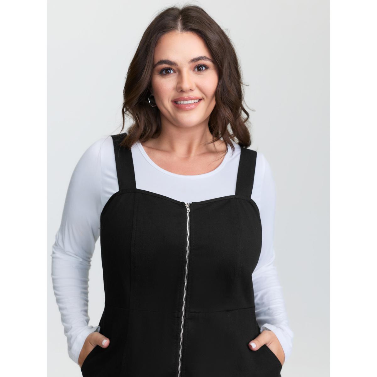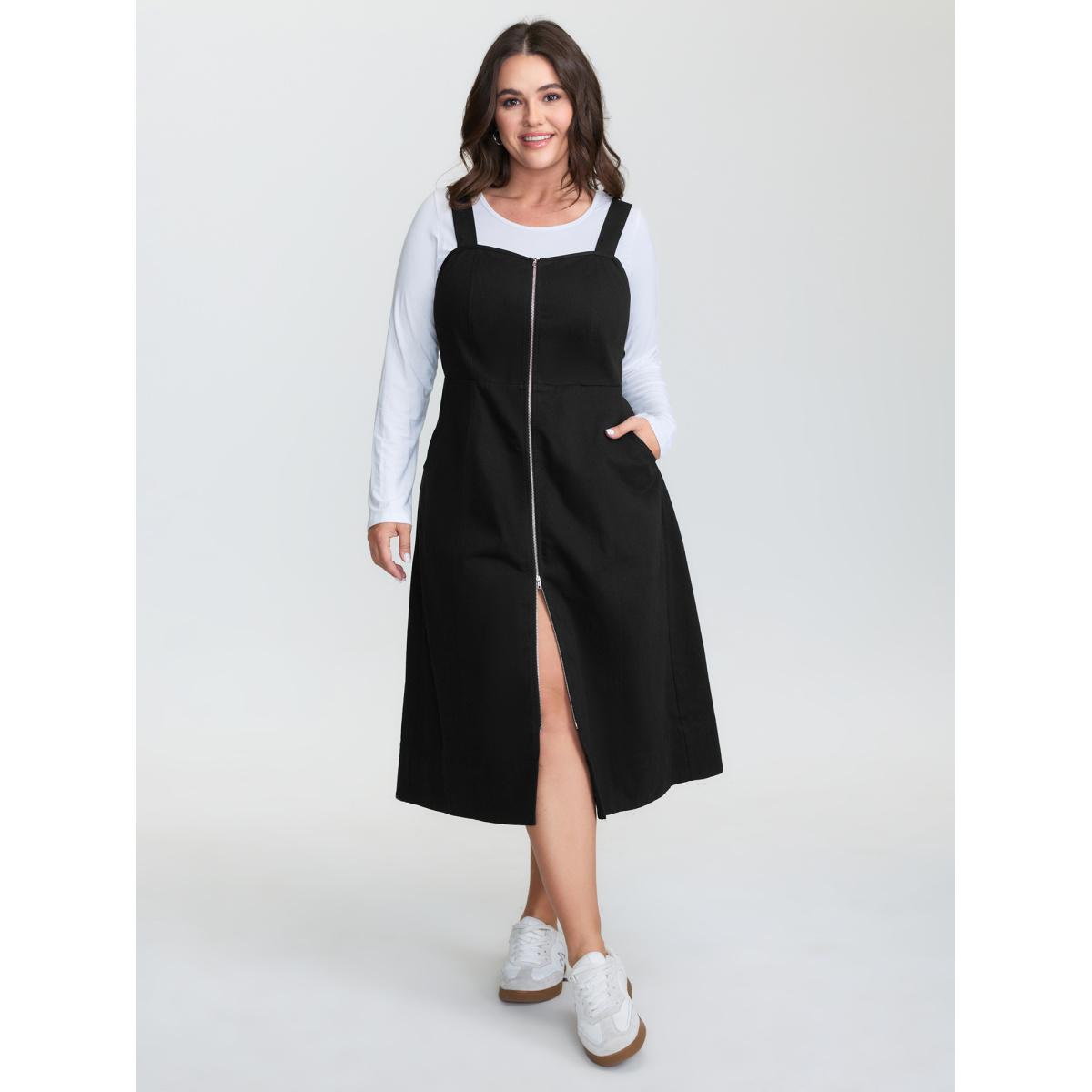 Plus Size Cotton Shirred Zipper-Front Midi Dress Black Women Leisure Shirred Non Sleeveless Curvy BloomChic 30/6X