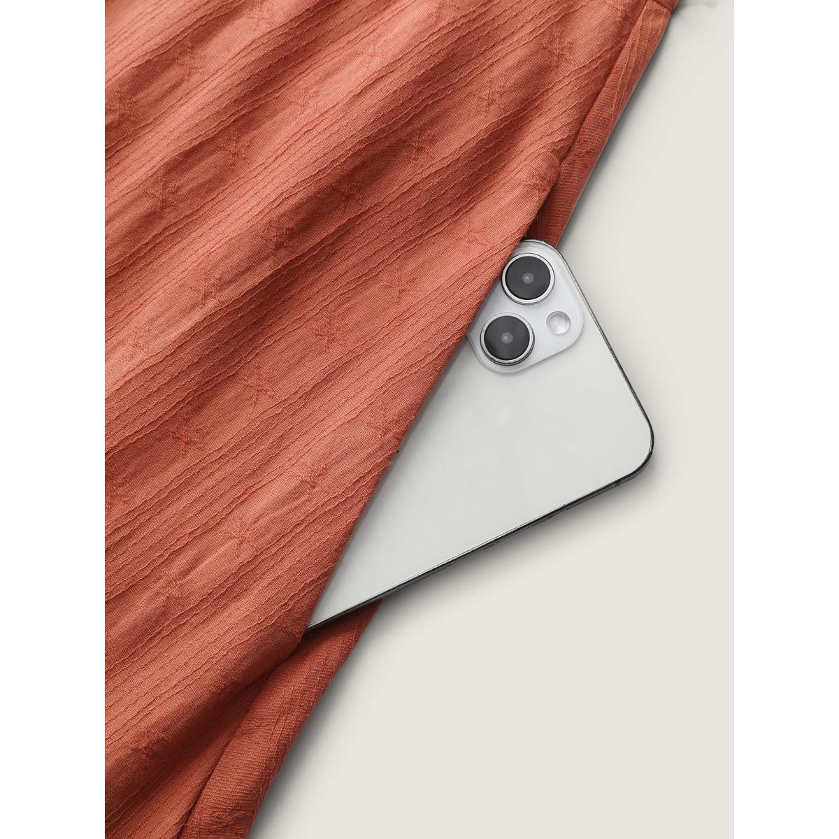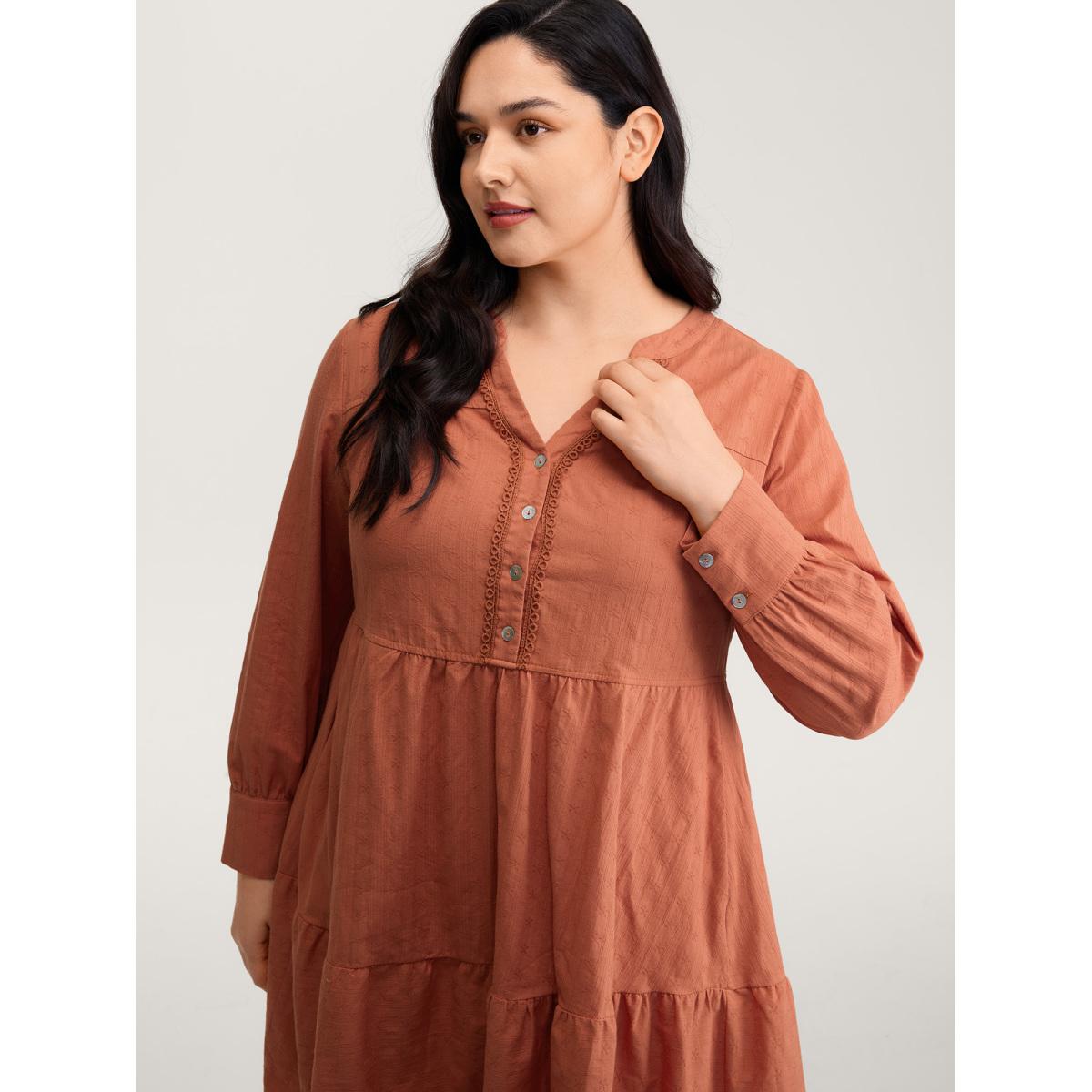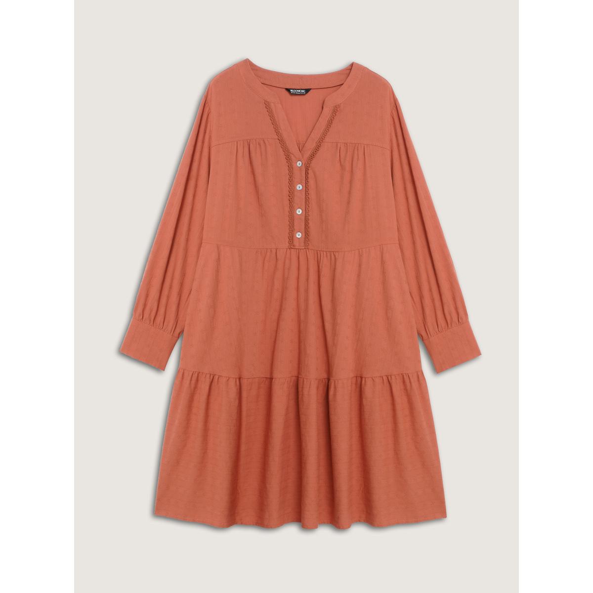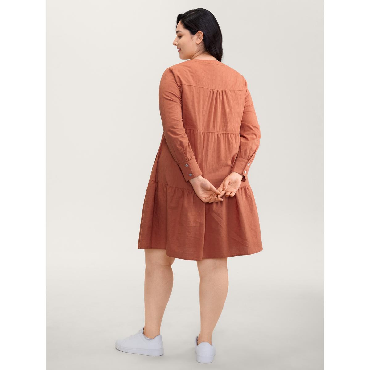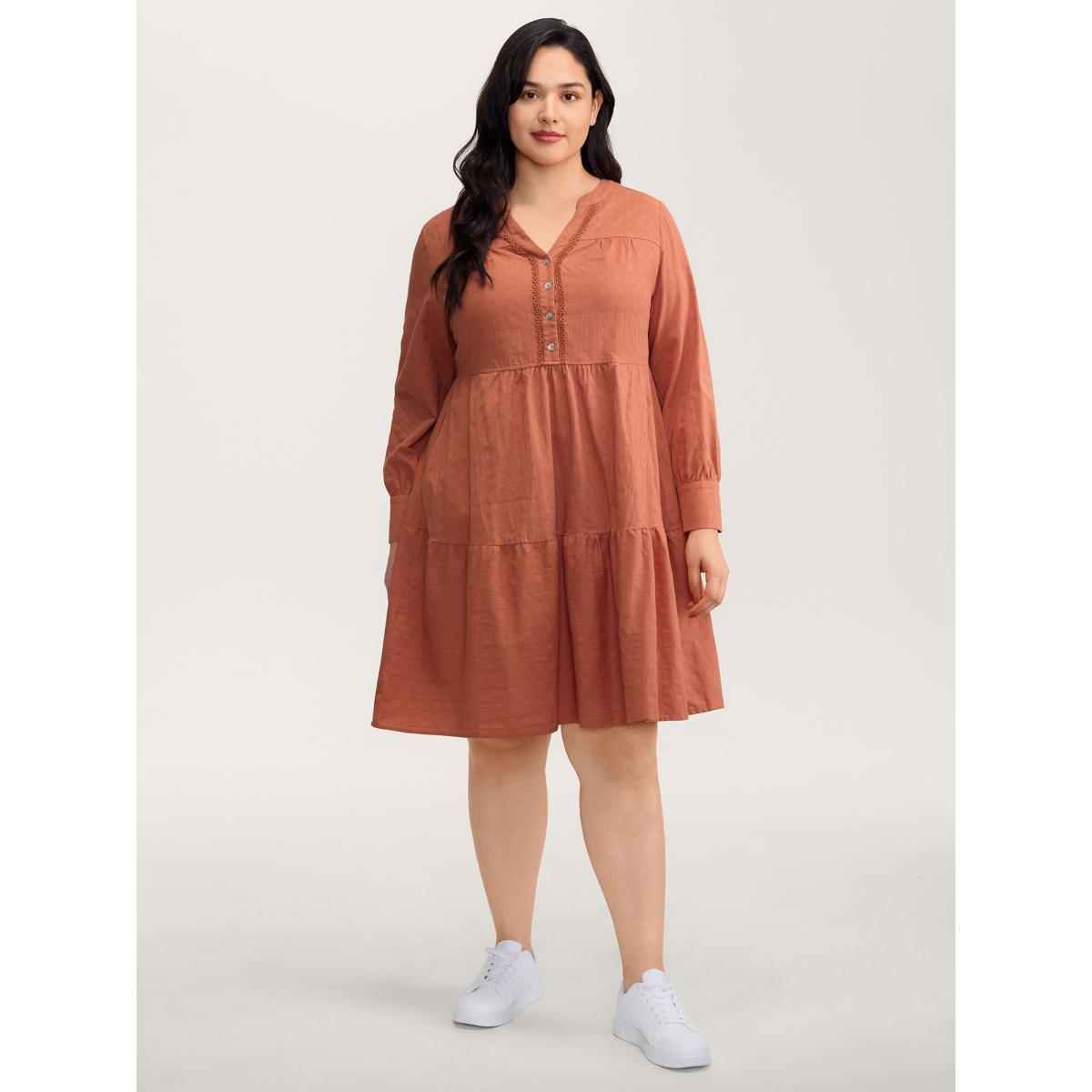 Plus Size Cotton Textured Button Tiered Knee Dress Brightorange Women Leisure Woven ribbon&lace trim Flat collar with V-notch Extra Long Sleeve Curvy BloomChic 22-24/3X