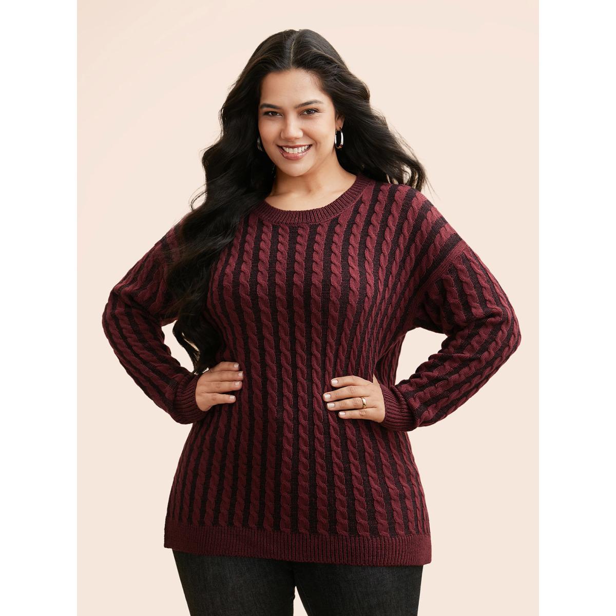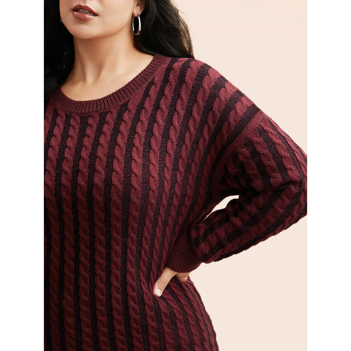 Plus Size Crew Neck Cable Knit Split Hem Pullover Deepred Women Casual Loose Long Sleeve Round Neck Everyday Pullovers BloomChic 30/6X