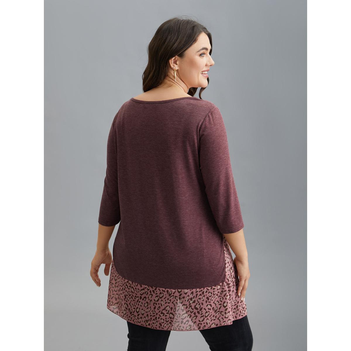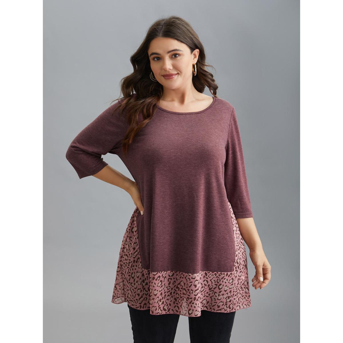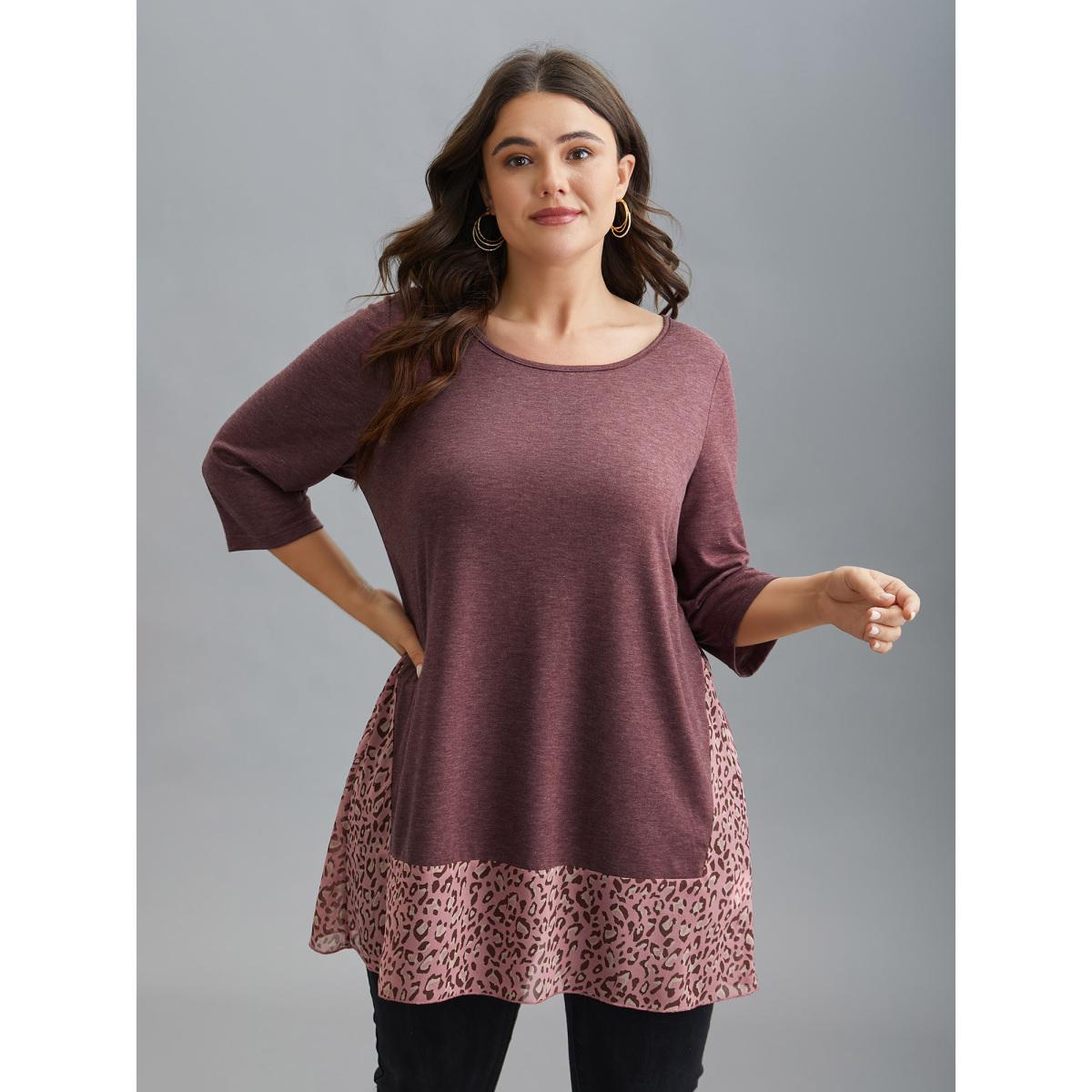 Plus Size Crew Neck Leopard Print Patchwork T-shirt Deepred Women Elegant Patchwork Round Neck Everyday T-shirts BloomChic 18-20/2X