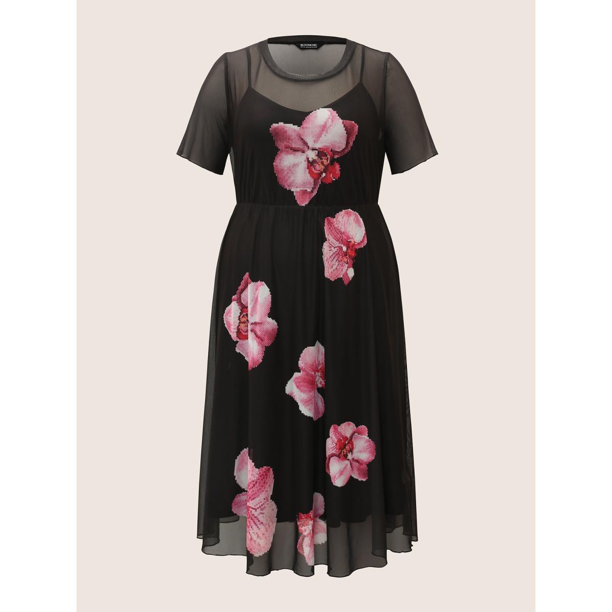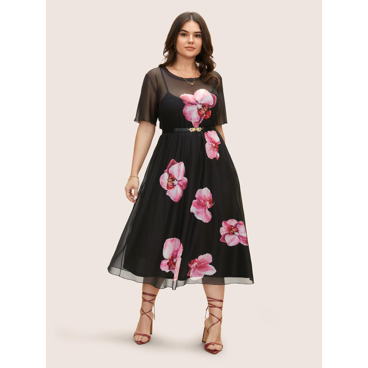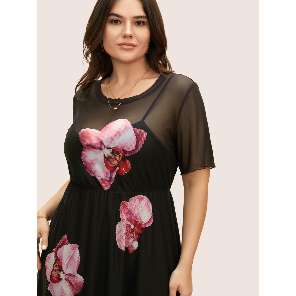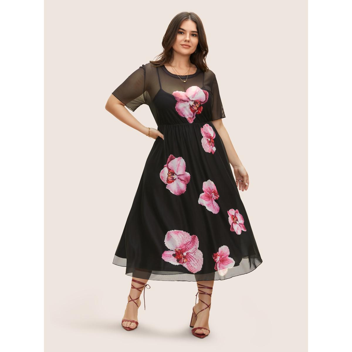 Plus Size Crew Neck Mesh Butterfly Orchid Midi Dress Black Women Elegant See through Round Neck Short sleeve Curvy BloomChic 26/4X