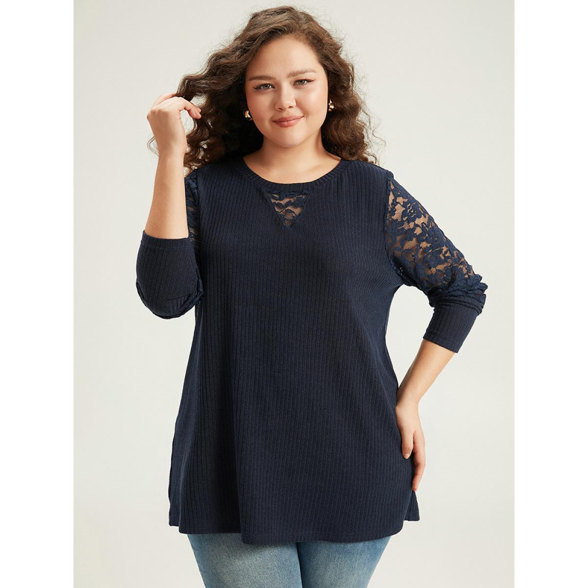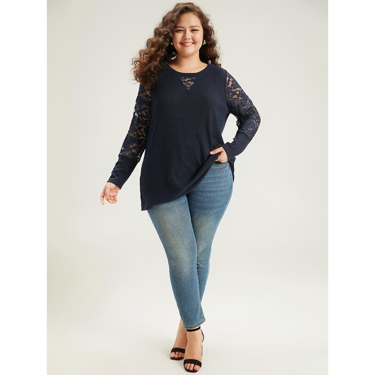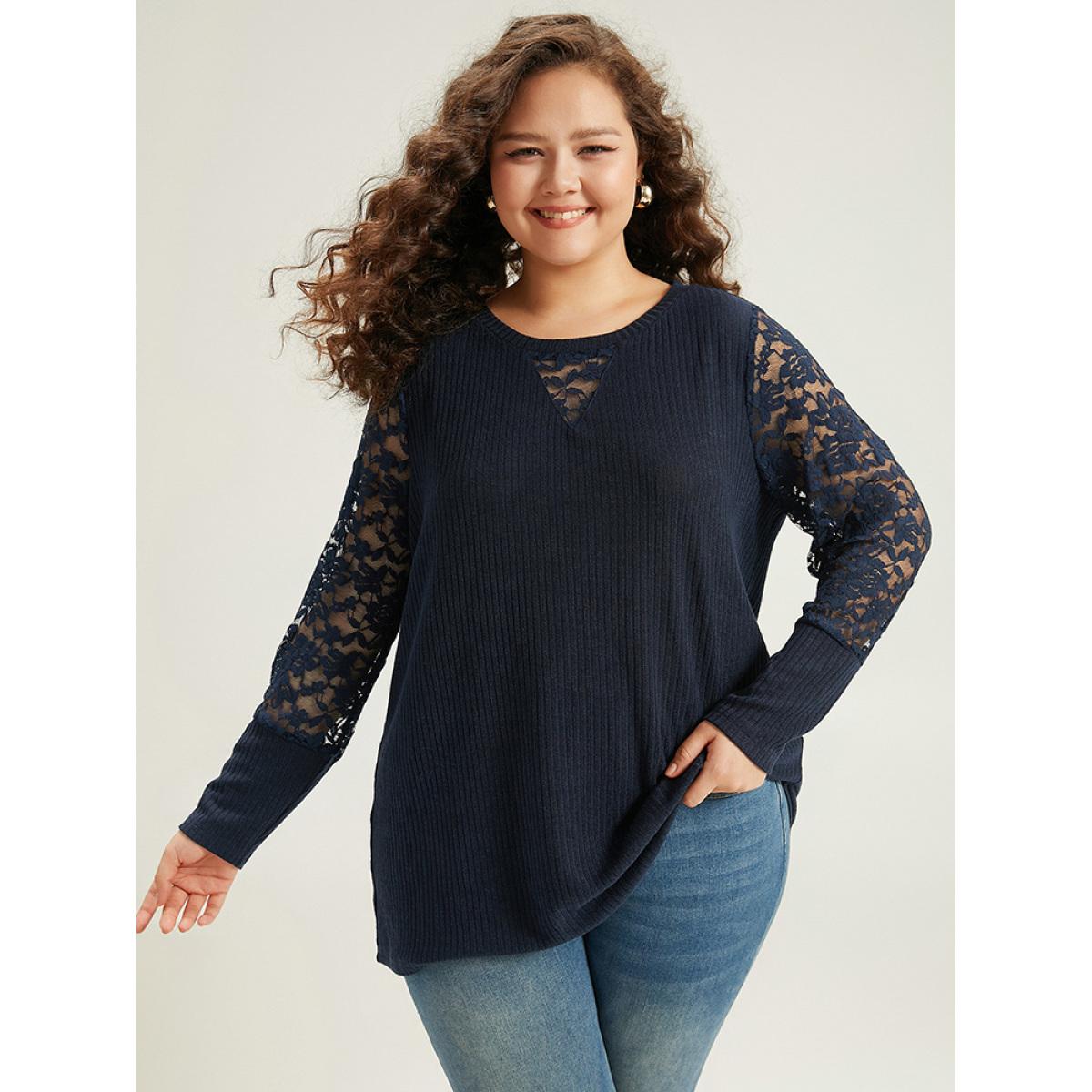 Plus Size Crochet Lace Mesh Crew Neck Sweatshirt Indigo Women Elegant Plain Plain Round Neck Dailywear T-shirts BloomChic 10/M