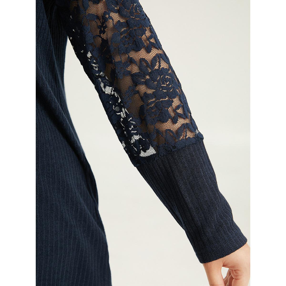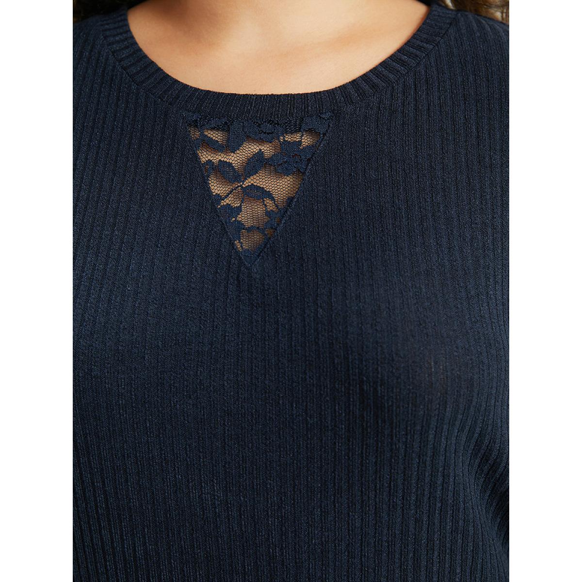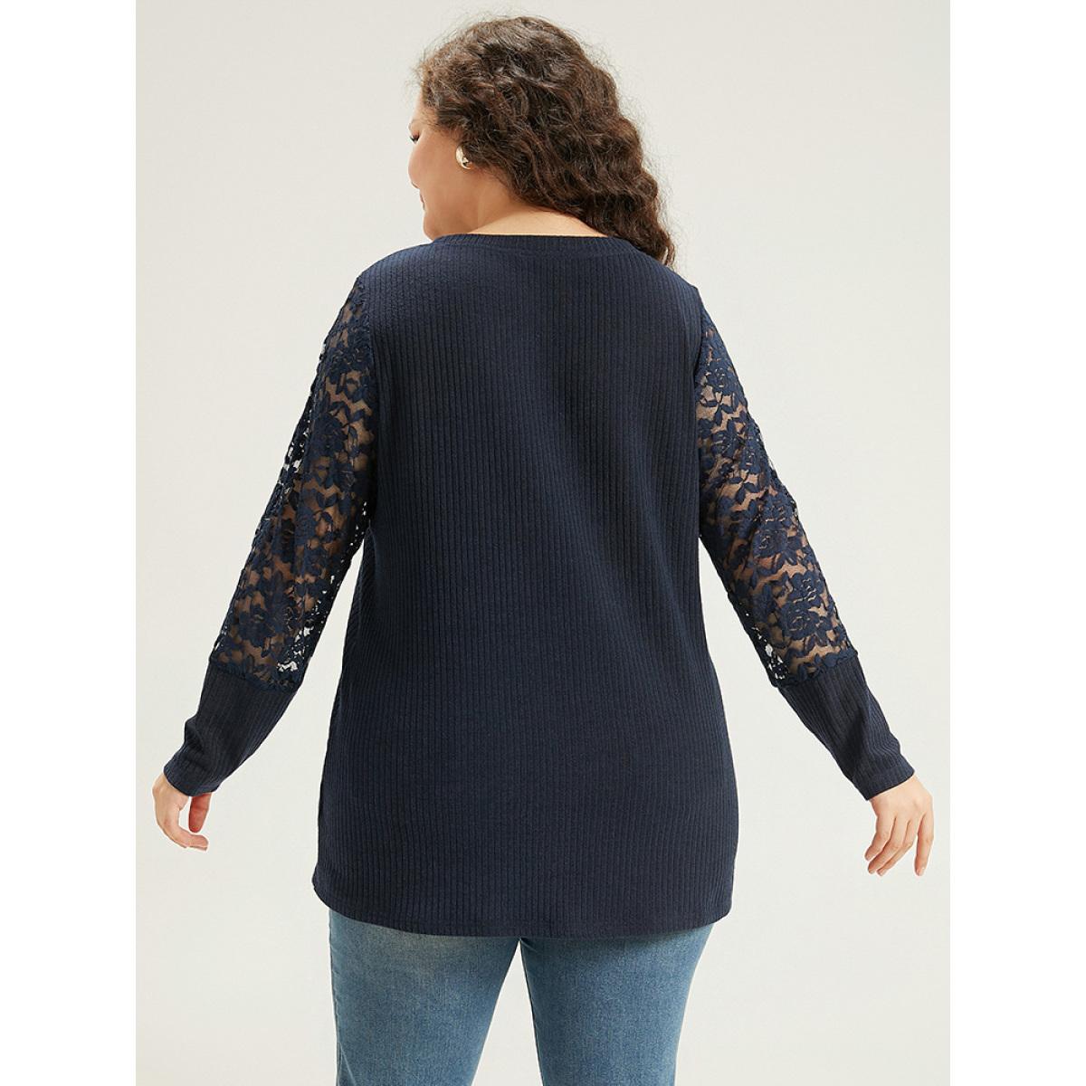 Plus Size Crochet Lace Mesh Crew Neck Sweatshirt Indigo Women Elegant Plain Plain Round Neck Dailywear T-shirts BloomChic 10/M