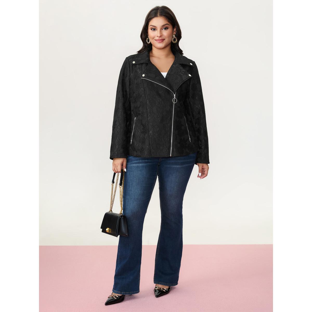 Plus Size Crochet Lace Mesh Pocket Zipper Coat Women Black Romantic Overlapping Ladies Elegant Winter Coats BloomChic 26/4X