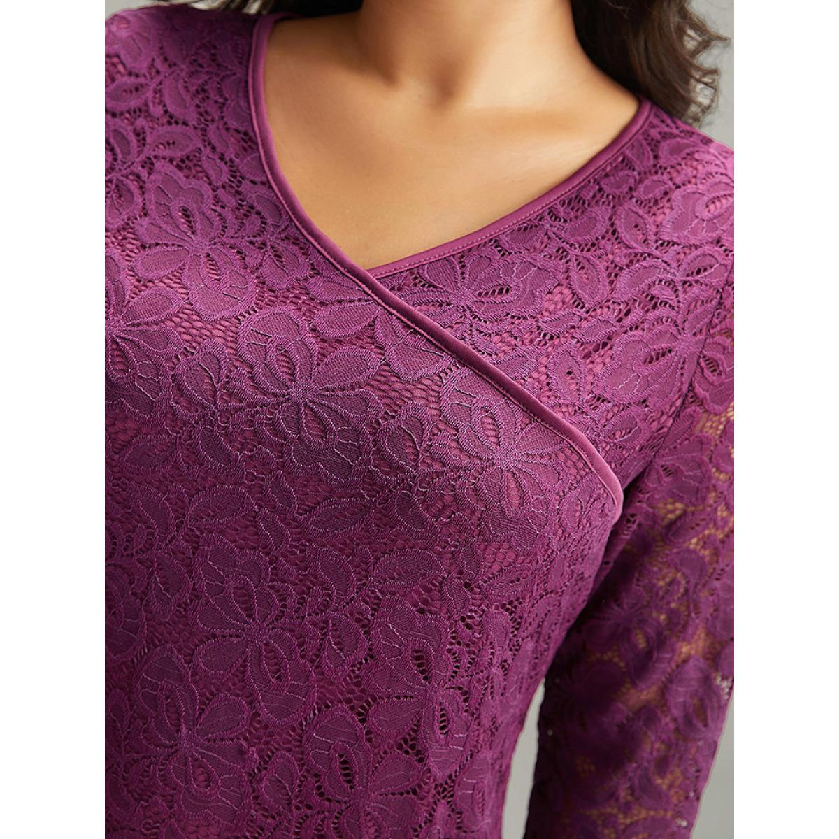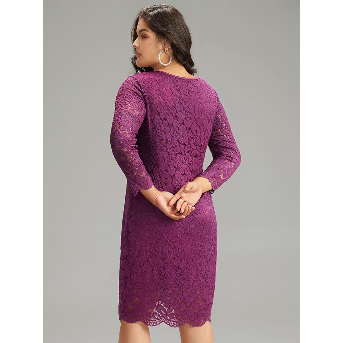 Plus Size Crochet Lace Mesh Scalloped Trim Dress Purple Women Glamour Plain V-neck Long Sleeve Curvy Knee Dress BloomChic 26/4X Product Image