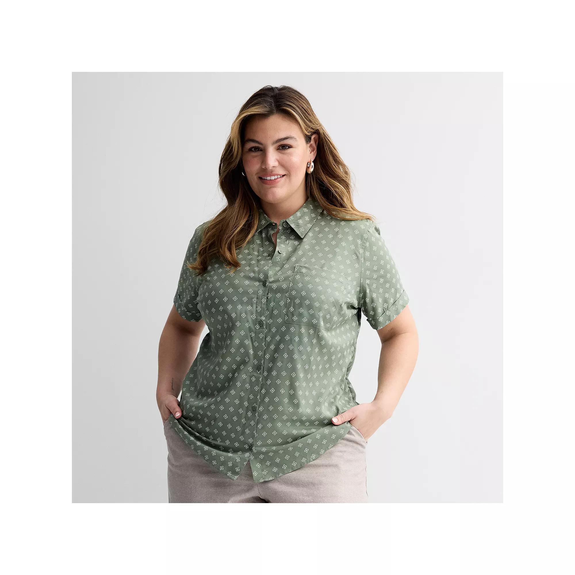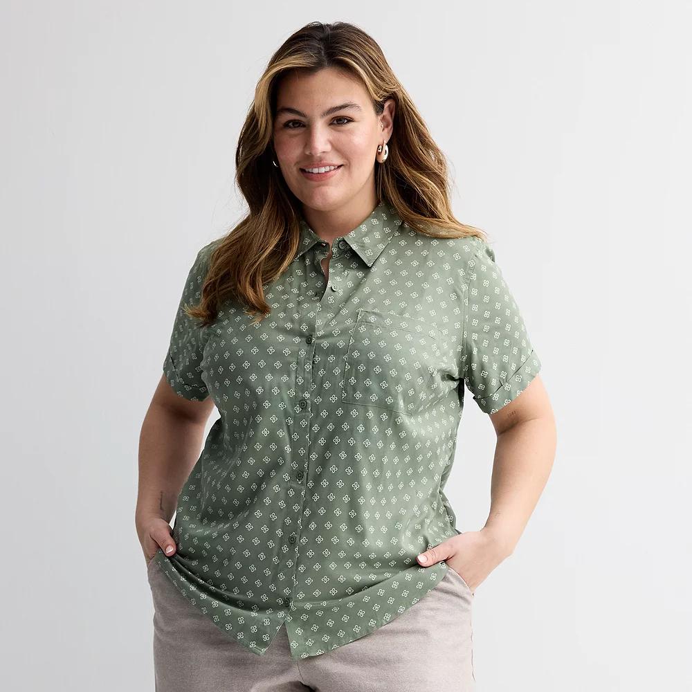 Easy summer style is here thanks to this Plus Size Croft & Barrow Camp Shirt. Click on this WOMEN'S GUIDE to find the perfect fit and more!Easy summer style is here thanks to this Plus Size Croft & Barrow Camp Shirt. Click on this WOMEN'S GUIDE to find the perfect fit and more!FEATURES 1 pocket Rounded hem Button front Short sleeves with sewn-rolled cuffs Collared necklineFIT & SIZING Relaxed fit 29-in. length from shoulder to hemFABRIC & CARE Rayon Polyester lining Machine wash Imported Size: 0X. Color: Olive Lattice Geo. Gender: female. Age Group: adult.