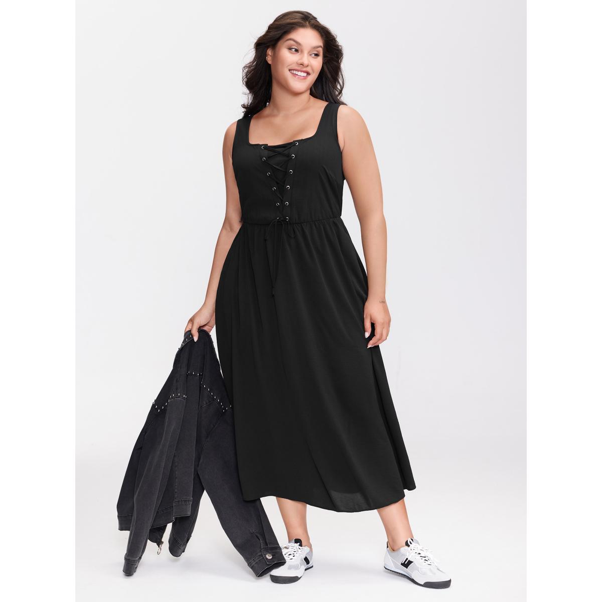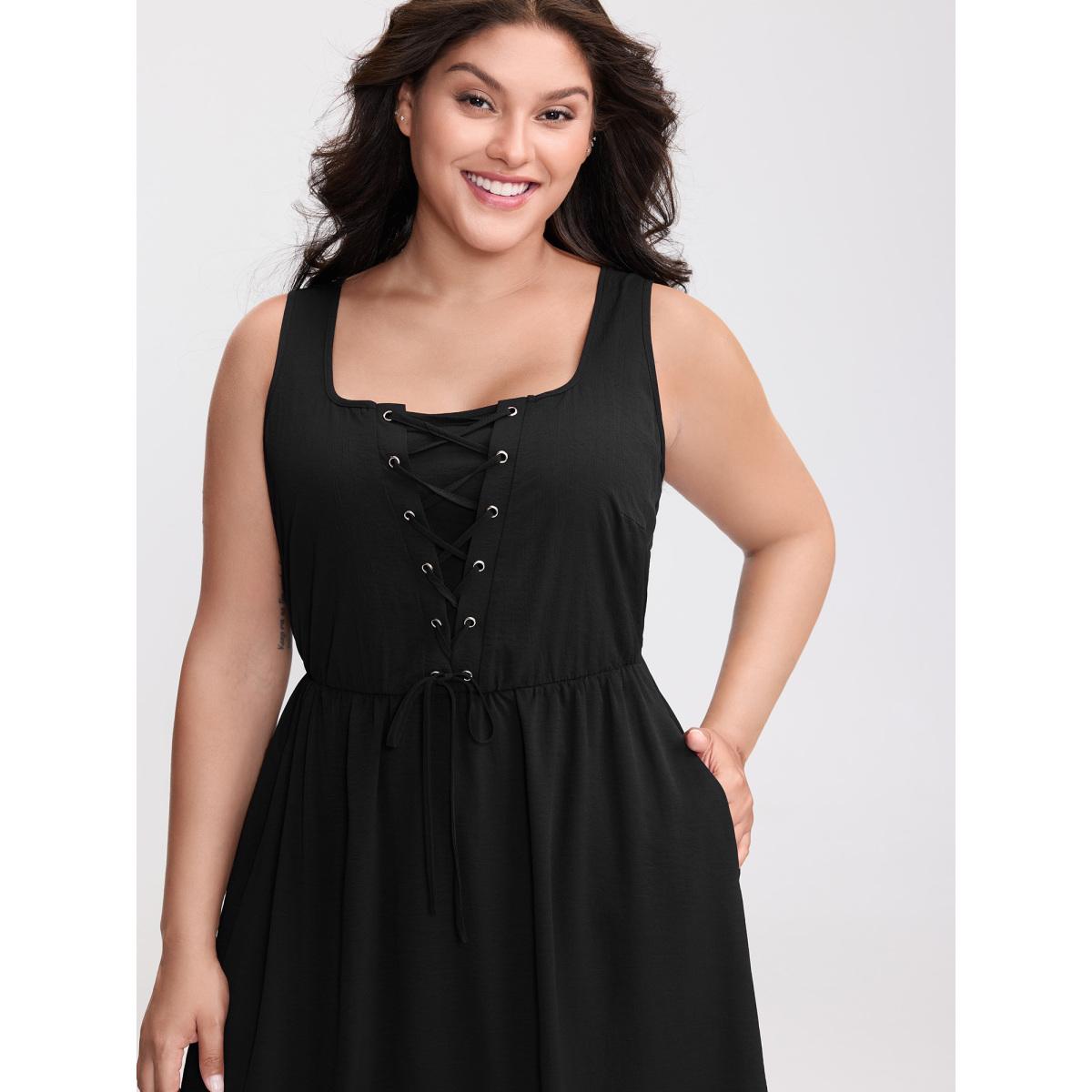 Plus Size Cross-Tie Textured Solid Midi Dress Black Women Leisure Eyelet U-neck Sleeveless Curvy BloomChic 30/6X