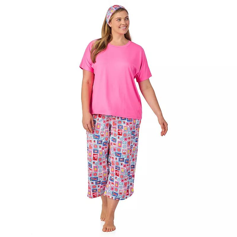 Elevate your bedtime style with this women's plus size Cuddl Duds 2-piece pajama crewneck top and pajama capri pants set with matching headband. Click on this INTIMATES & SLEEPWEAR GUIDE to find the perfect fit and more!Elevate your bedtime style with this women's plus size Cuddl Duds 2-piece pajama crewneck top and pajama capri pants set with matching headband. Click on this INTIMATES & SLEEPWEAR GUIDE to find the perfect fit and more!FEATURES Set includes: top, capri pants, matching headband Top: crewneck, short sleeves, high-low hem, dolman sleeves Capri pants: drawstring elastic waistband, 2 side seam pockets Pullover stylingFIT & SIZING 23-in. inseam 22 1/4-in leg opening Midrise sits on the high hip Straight leg opening Relaxed fitFABRIC & CARE Polyester, spandex Machine wash and tumble dry low Imported Size: 1X. Color: Cream Stamps. Gender: female. Age Group: adult.