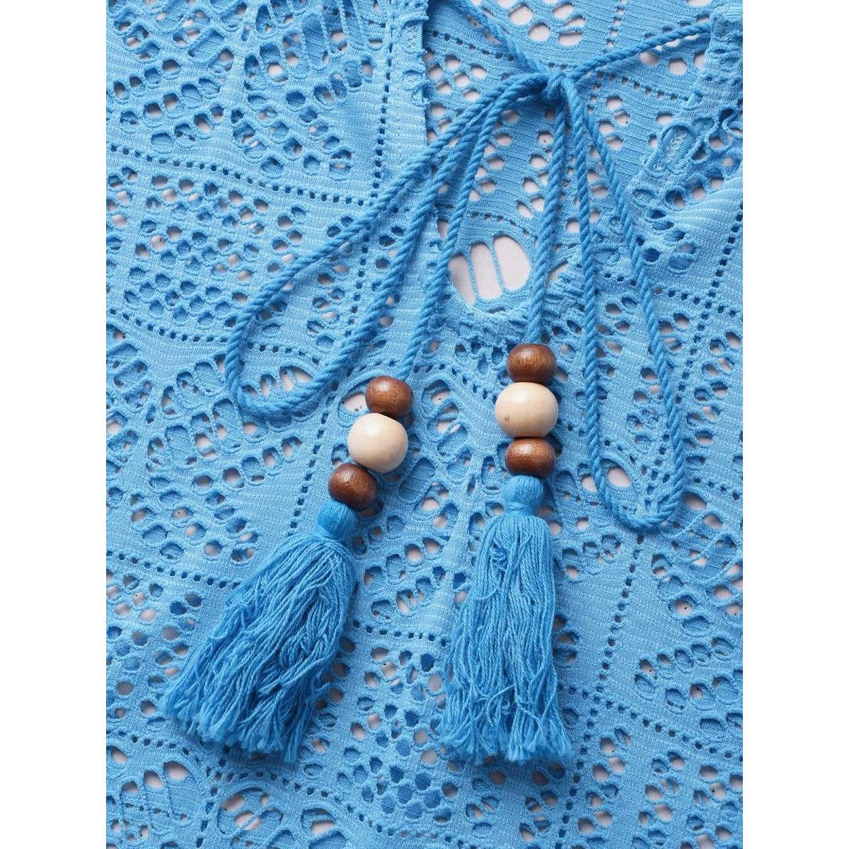 Plus Size Cut Out Tassel Trim Split Hem Midi Dress Skyblue Women Resort Flat collar with V-notch Half Sleeve Curvy BloomChic 22-24/3X