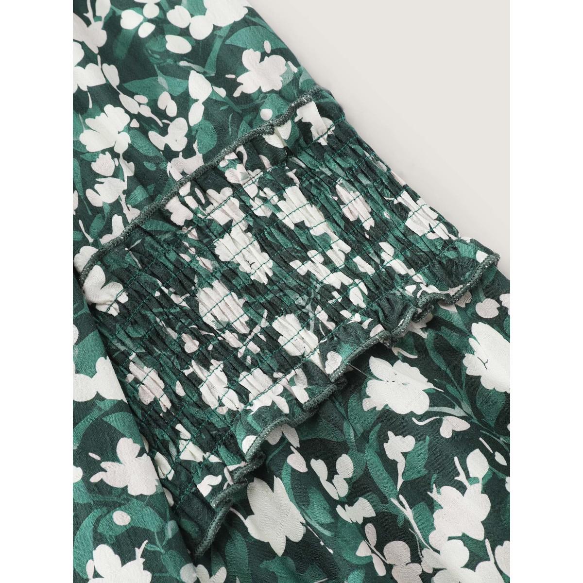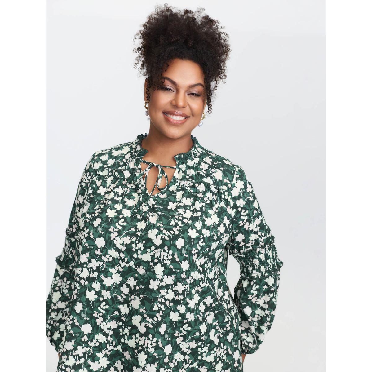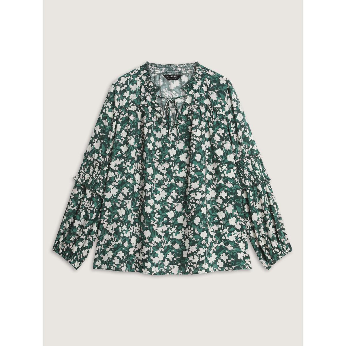 Plus Size Cyan Floral Shirred Sleeve Drawstring Neckline Blouse Women Timeless Extra Long Sleeve Flat collar with V-notch Elegant Blouses BloomChic 22-24/3X