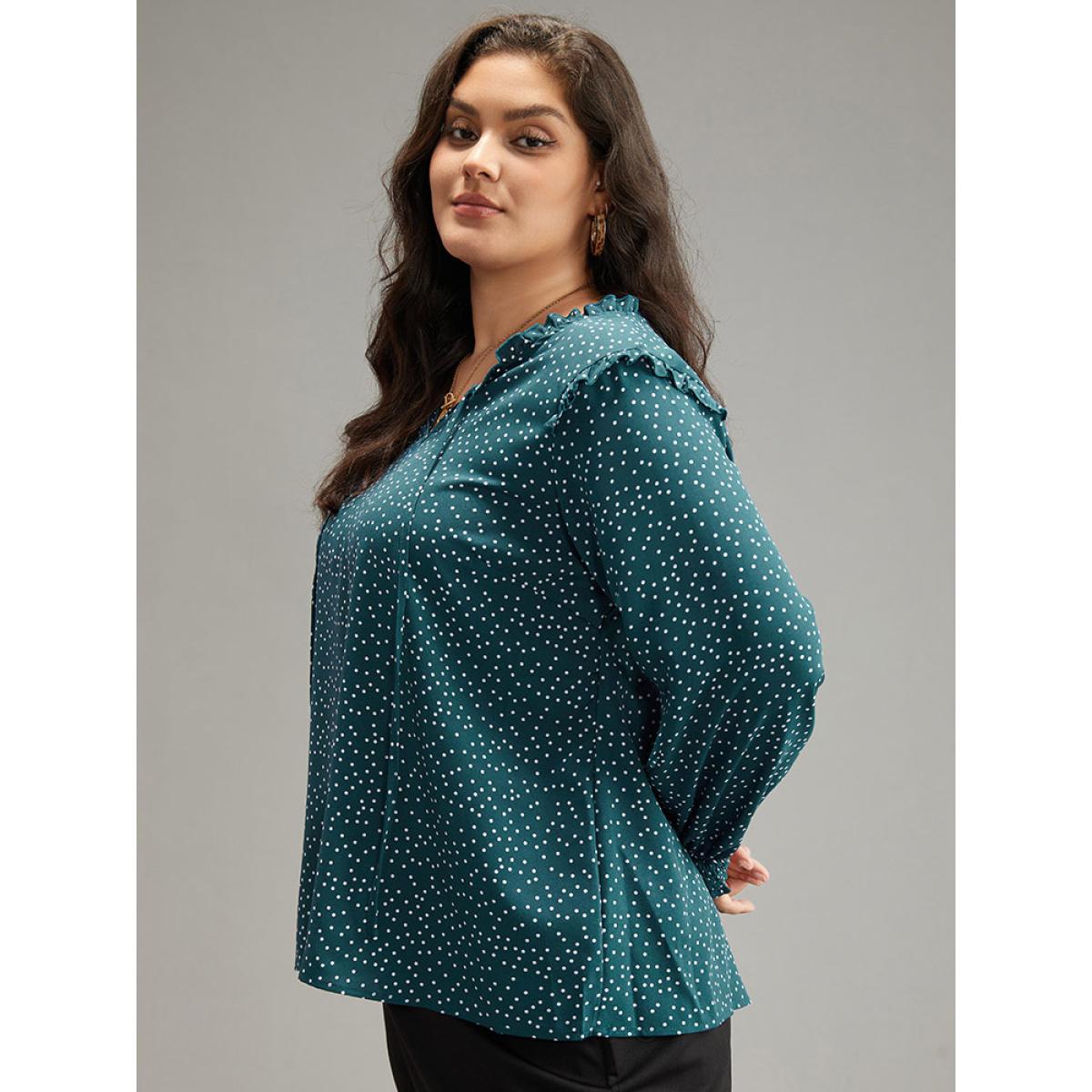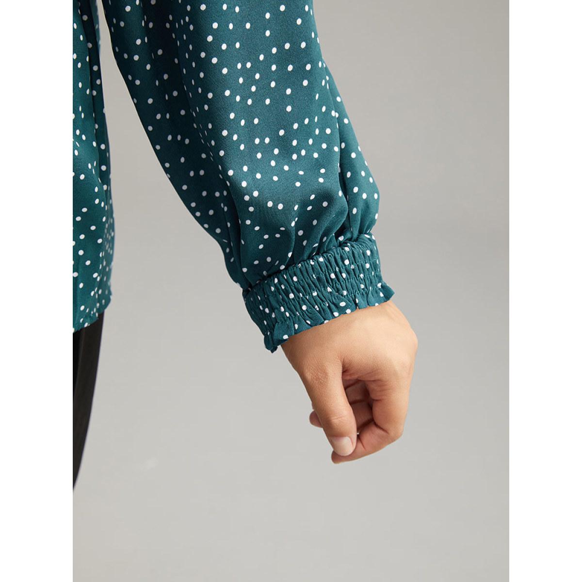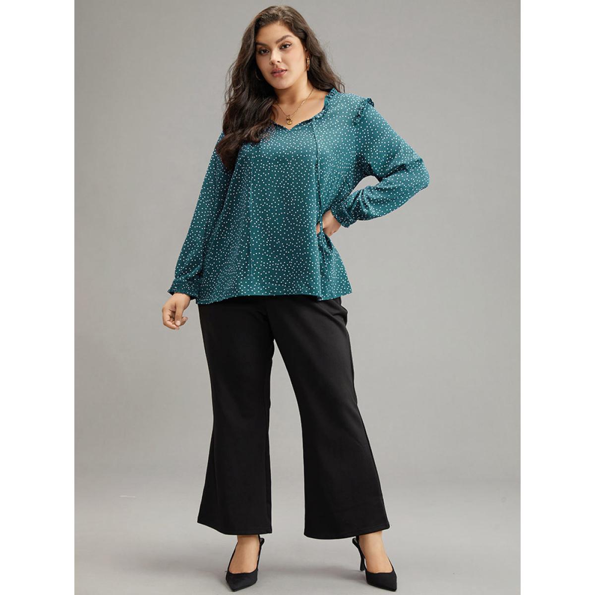 Plus Size Cyan Polka Dot Shirred Tie Neck Frill Trim Blouse Women Elegant Long Sleeve Tie Neck Dailywear Blouses BloomChic 30/6X