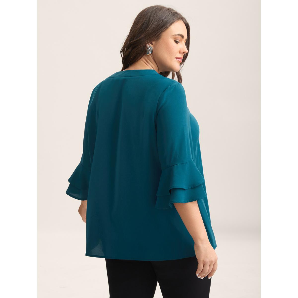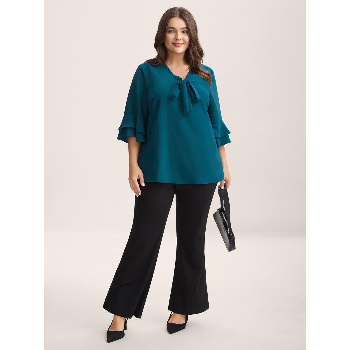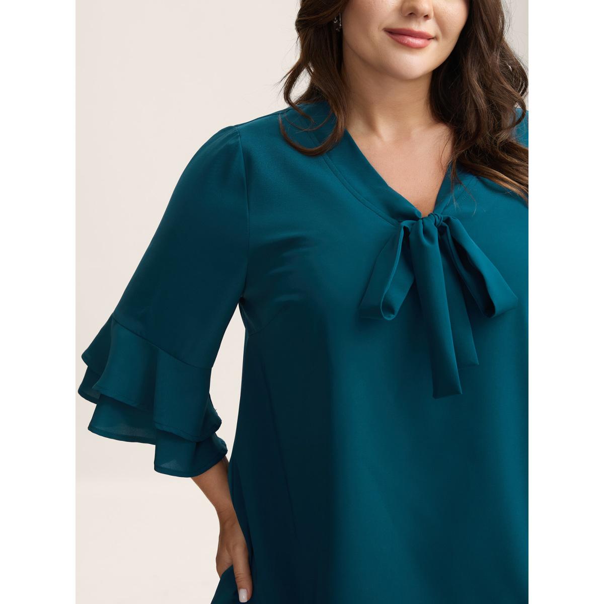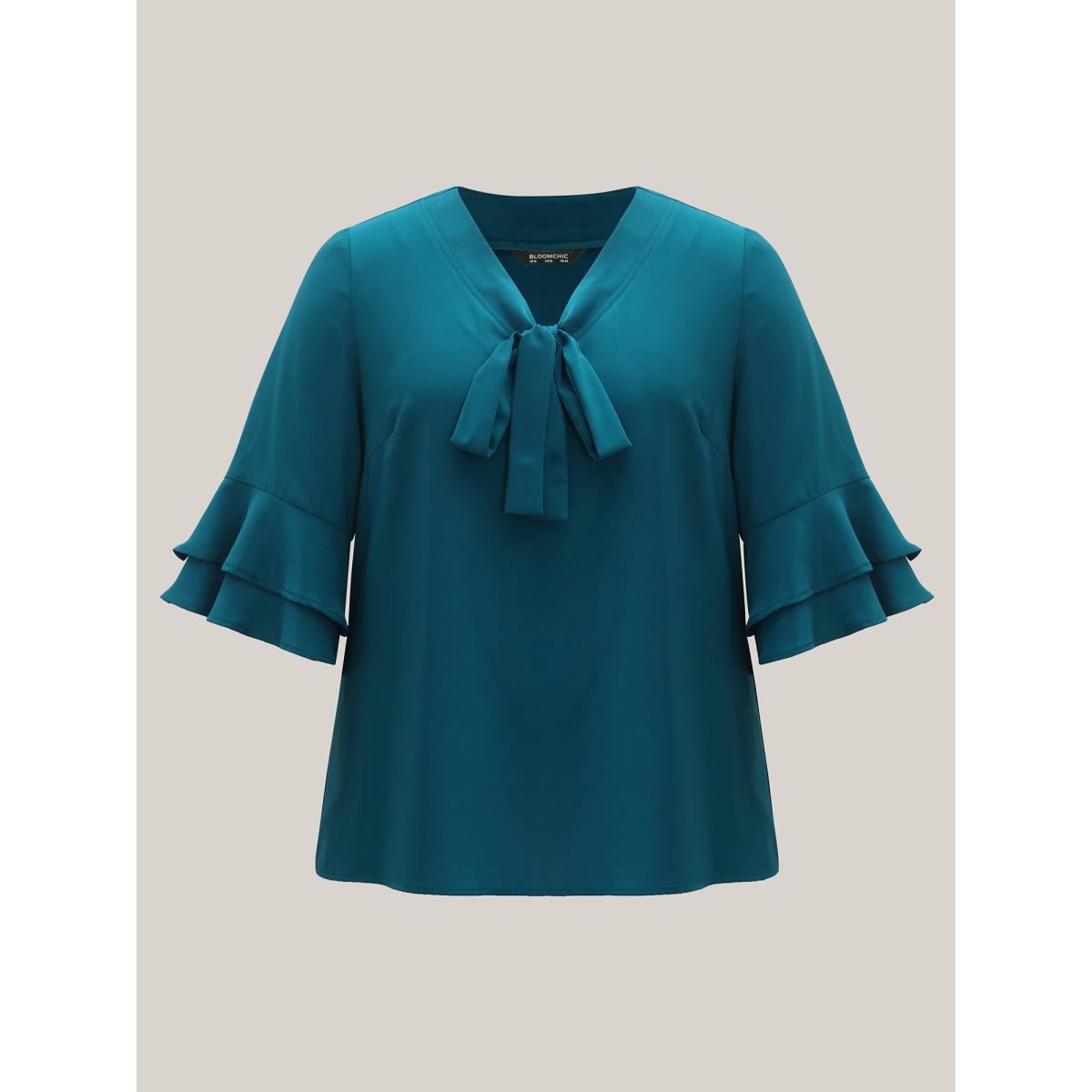 Plus Size Cyan Ribbon Collar Double Lotus Sleeve Blouse Women Elbow-length sleeve Ribbon-tied collar Work Blouses BloomChic 14-16/1X