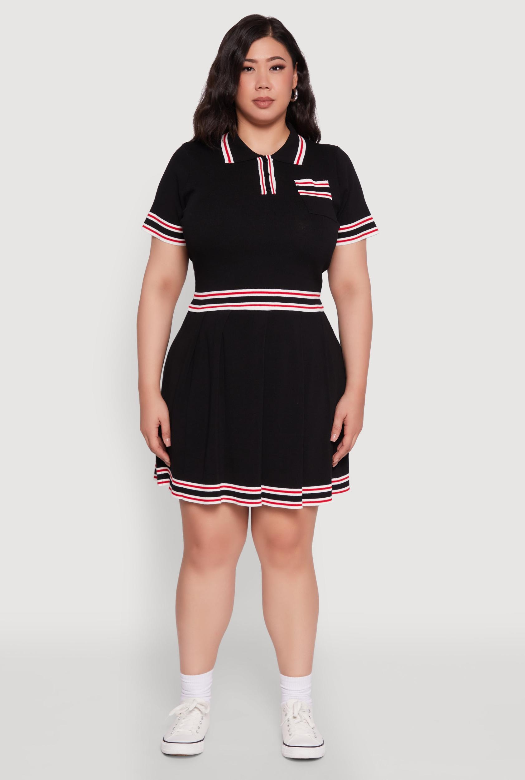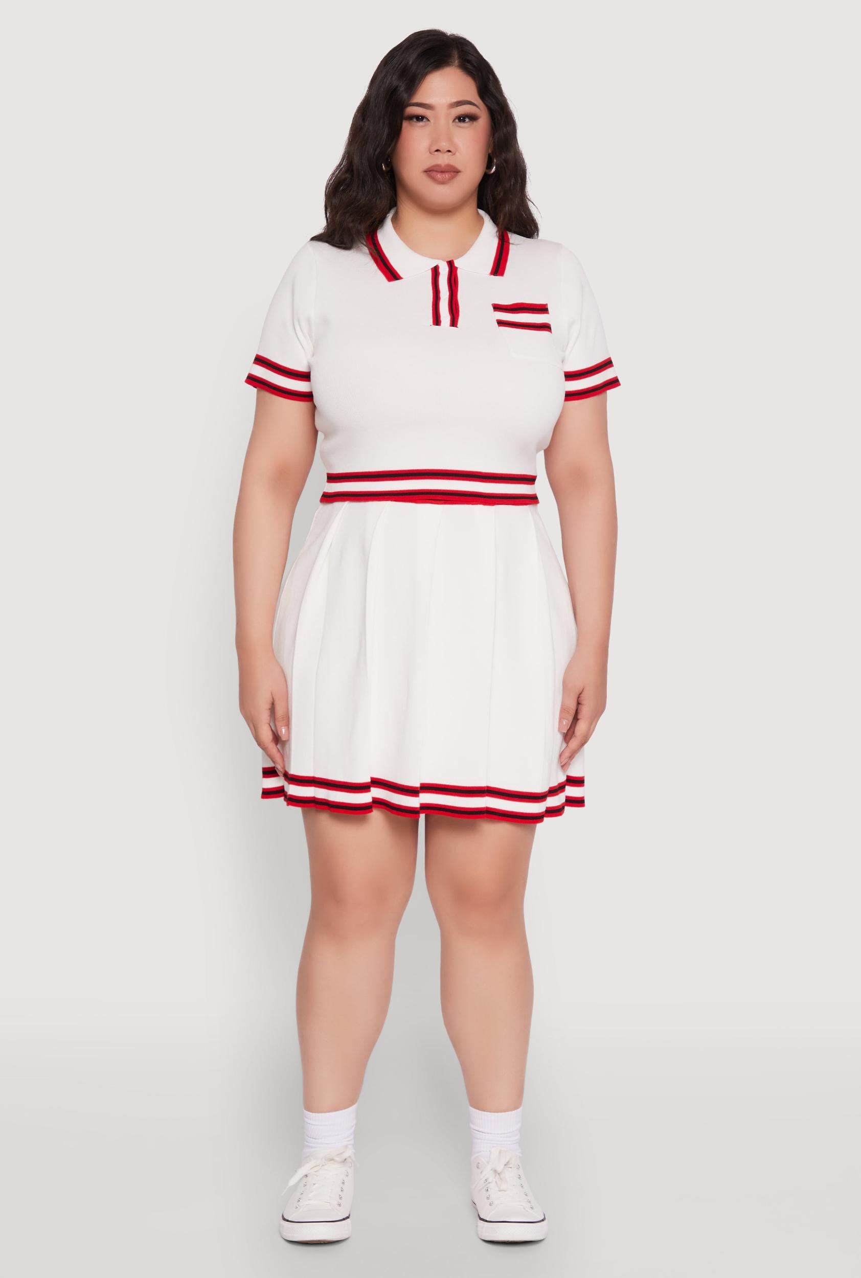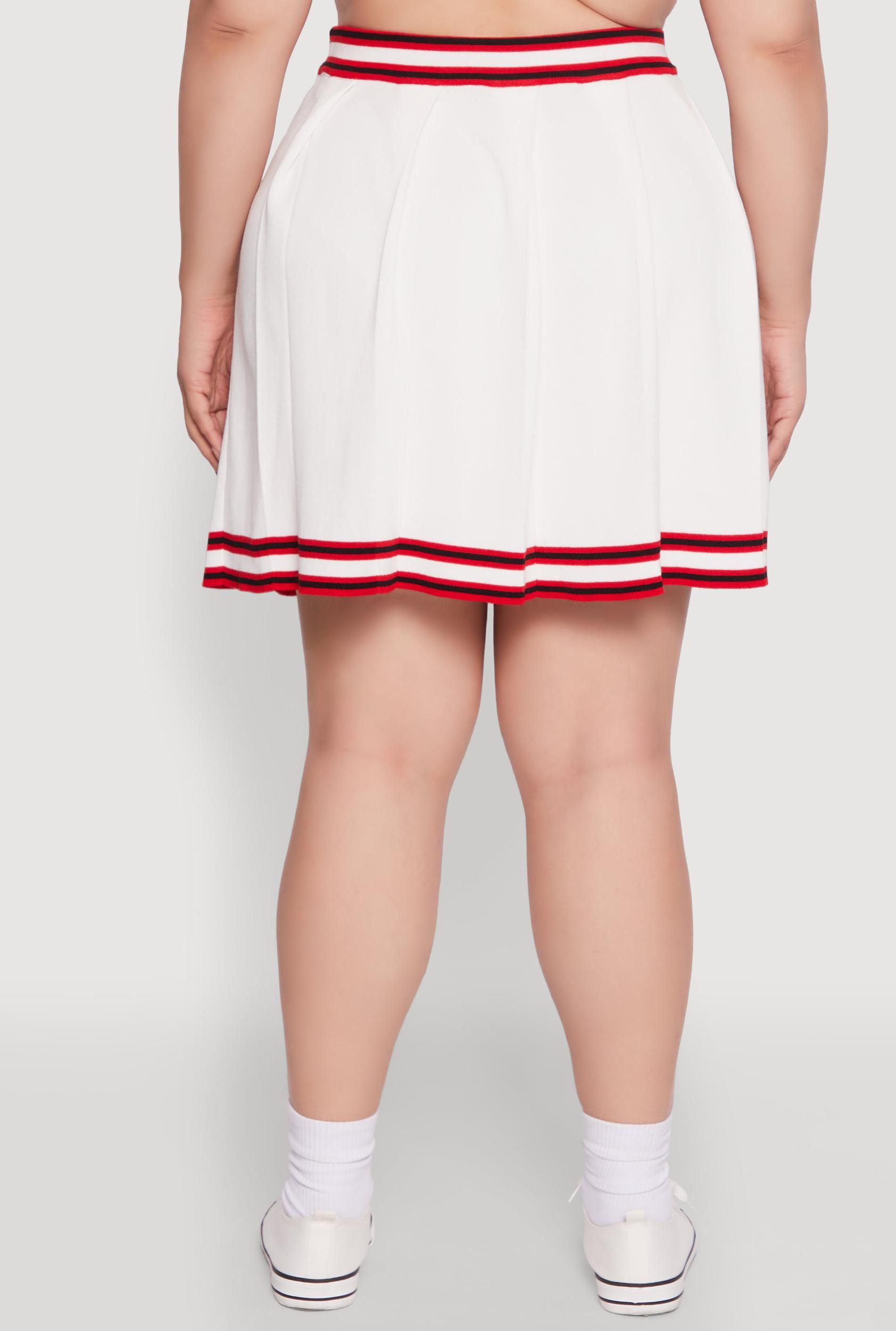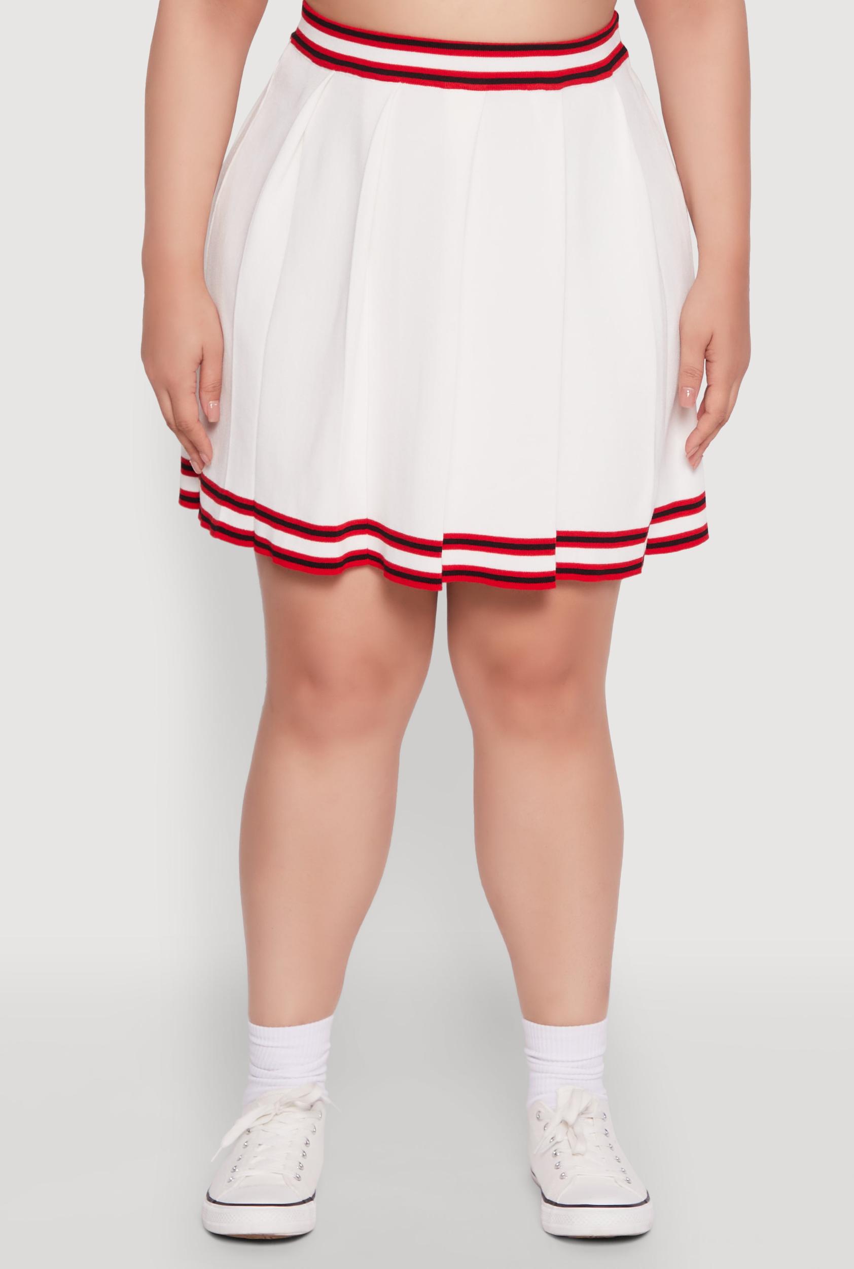 Step up your style game with the Plus Size Daisy Varsity Stripe Pleated Skirt. This midi-length beauty combines sporty varsity vibes with feminine pleats, giving you a look that's effortlessly cool and totally on-trend. Whether you're dressing up for a casual day out or adding a fun twist to your set, this skirt is your new go-to for standout style and comfort. Feel confident, look fabulous, and embrace your unique vibe with this must-have piece. High waisted fit for a flattering silhouette Midi length adds a touch of elegance and versatility Bold varsity stripe detail for a sporty, trendy look Pleated design creates movement and visual interest Perfect for casual outings or styled with your favorite sets Designed specifically for plus size comfort and confidence Measurements Full Length: 20 in Content and Care Material: 70% Viscose 30% Polyester Care Instructions: Machine Wash, Lay Flat To Dry Country Of Origin: China Rainbow Item Number 1927064729970