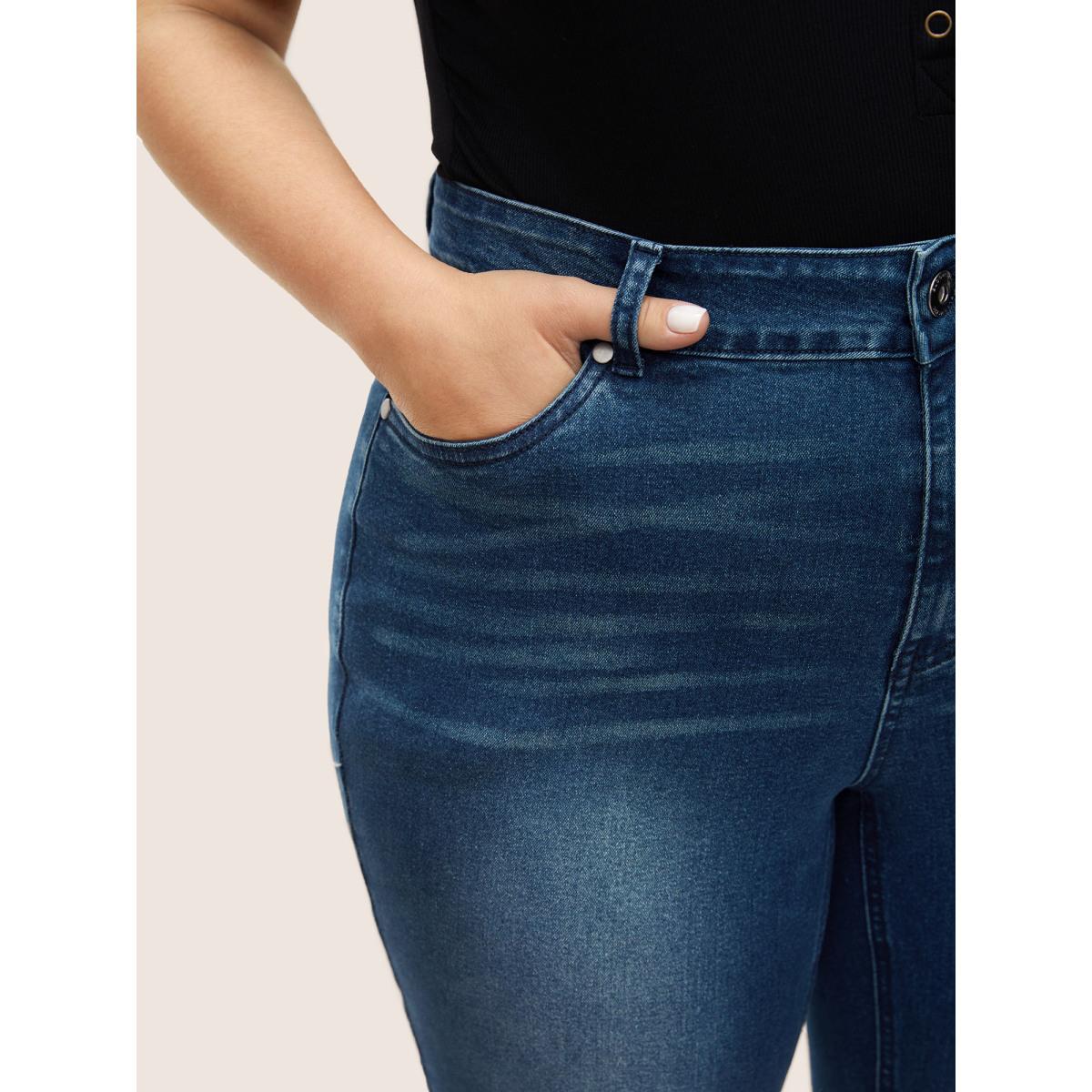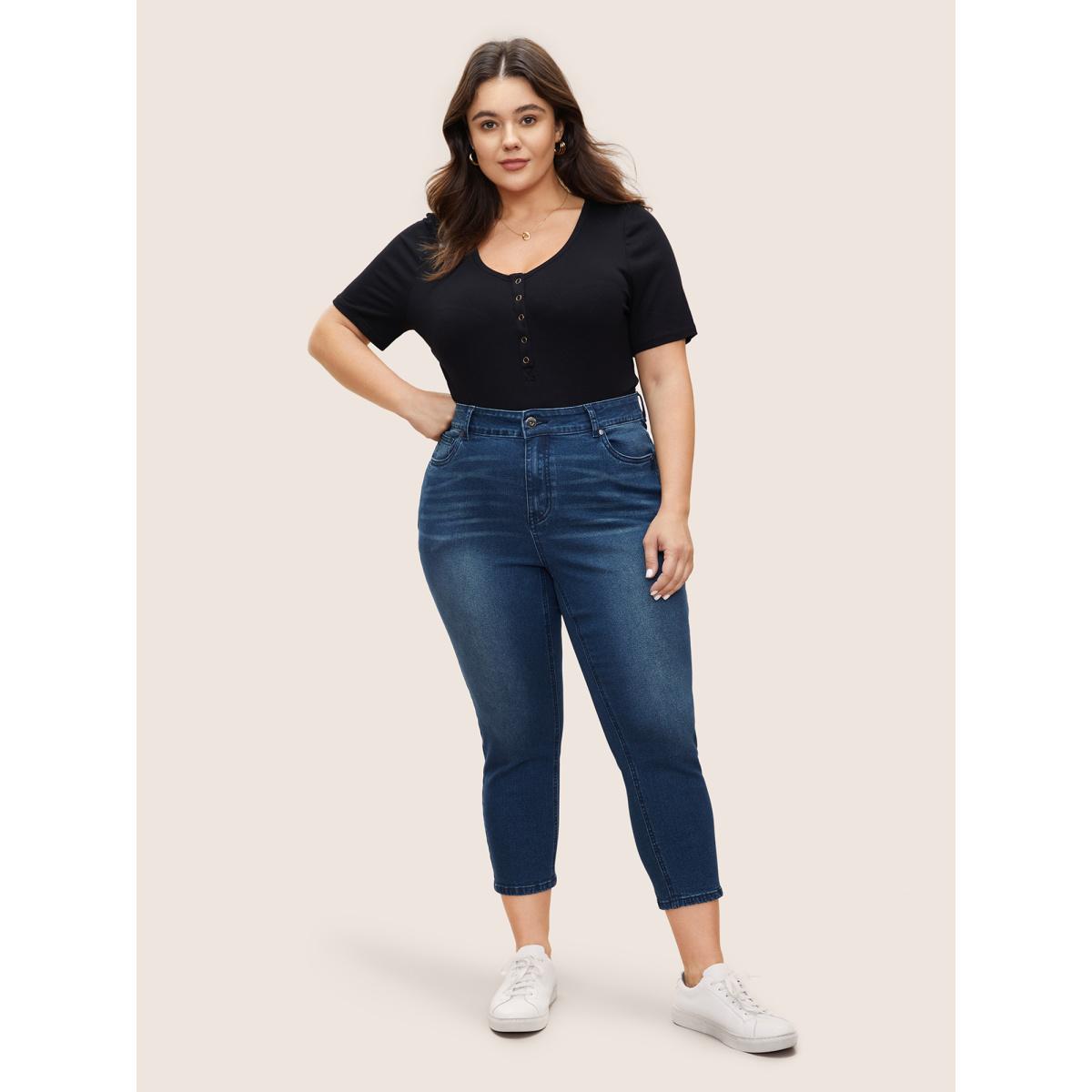 Plus Size Very Stretchy High Rise Dark Wash Cropped Jeans Women LightBlue Leisure Plain Roll Hem High stretch Slanted pocket Jeans BloomChic 18/2X