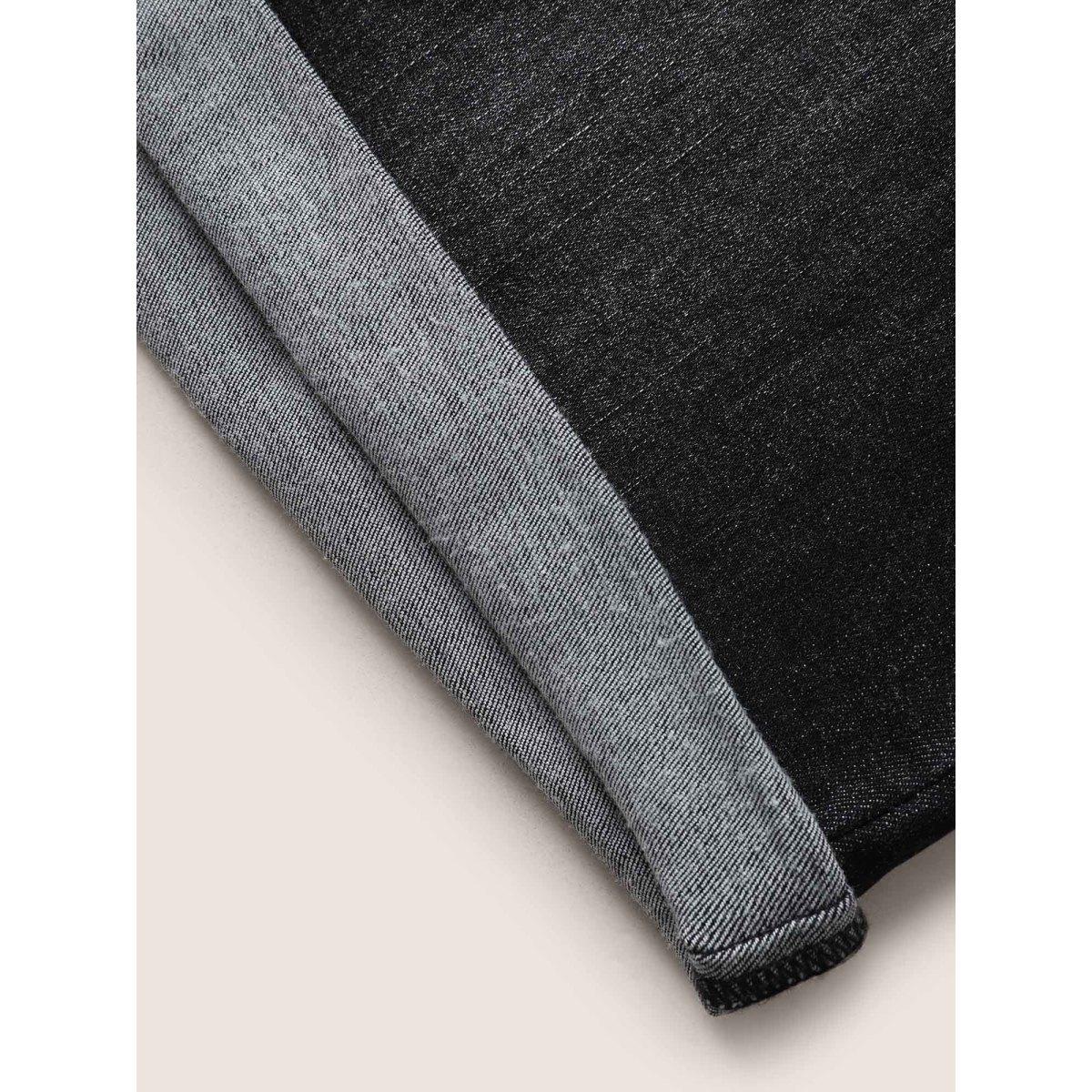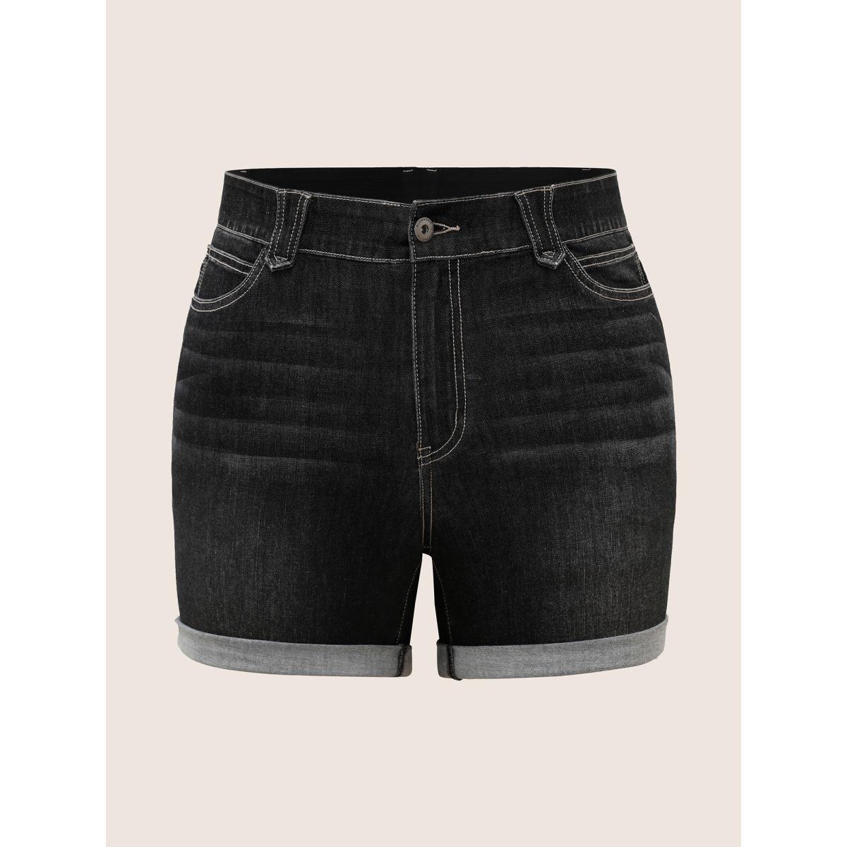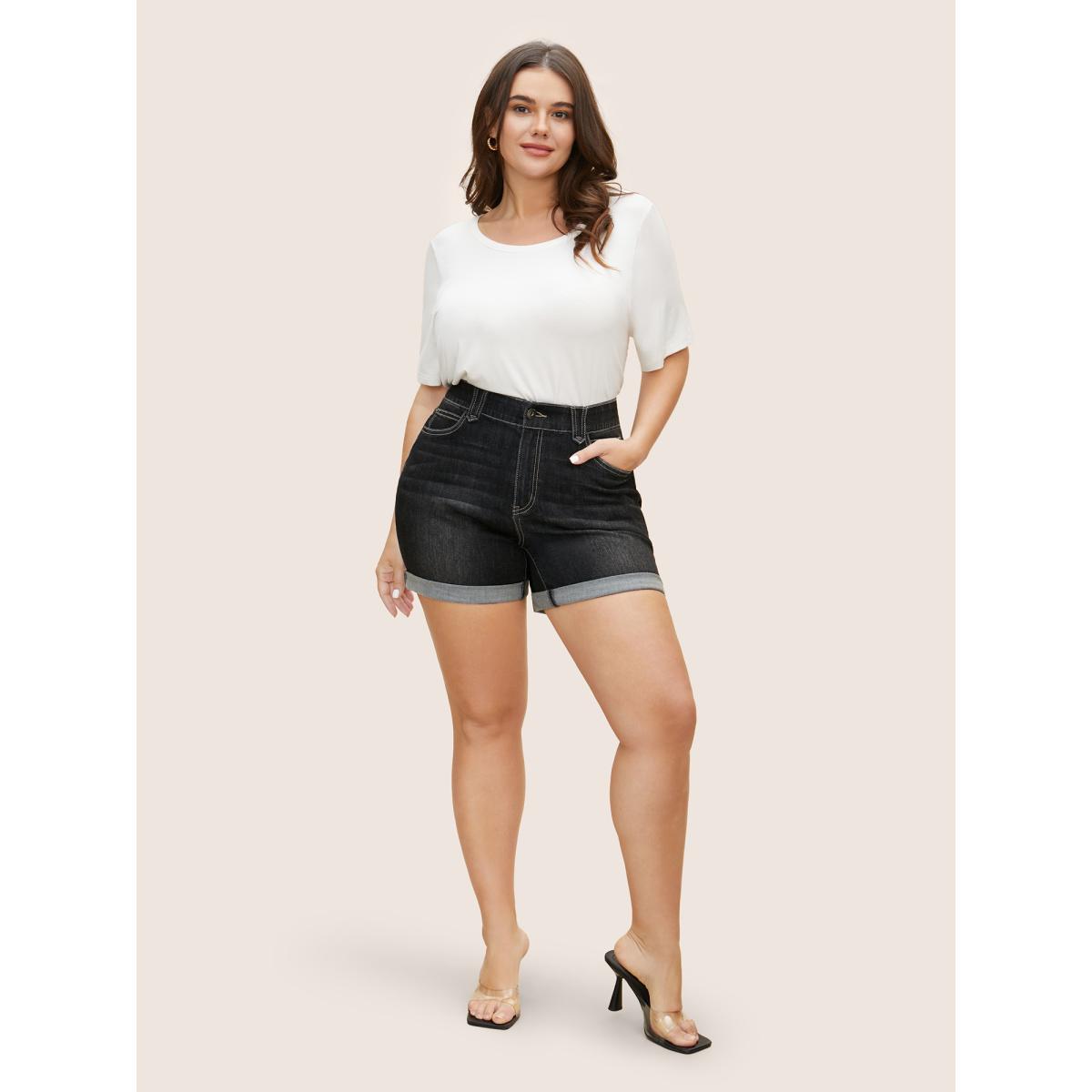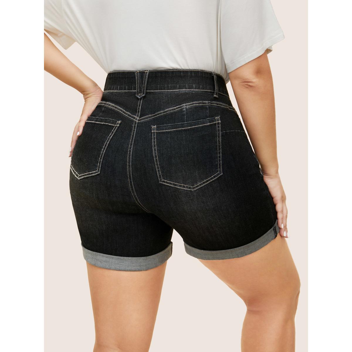 Plus Size Dark Wash Roll Hem High Stretch Denim Shorts Women Denimcharcoal Roll Hem High stretch Everyday Slanted pocket Elegant Denim Shorts BloomChic 30/6X